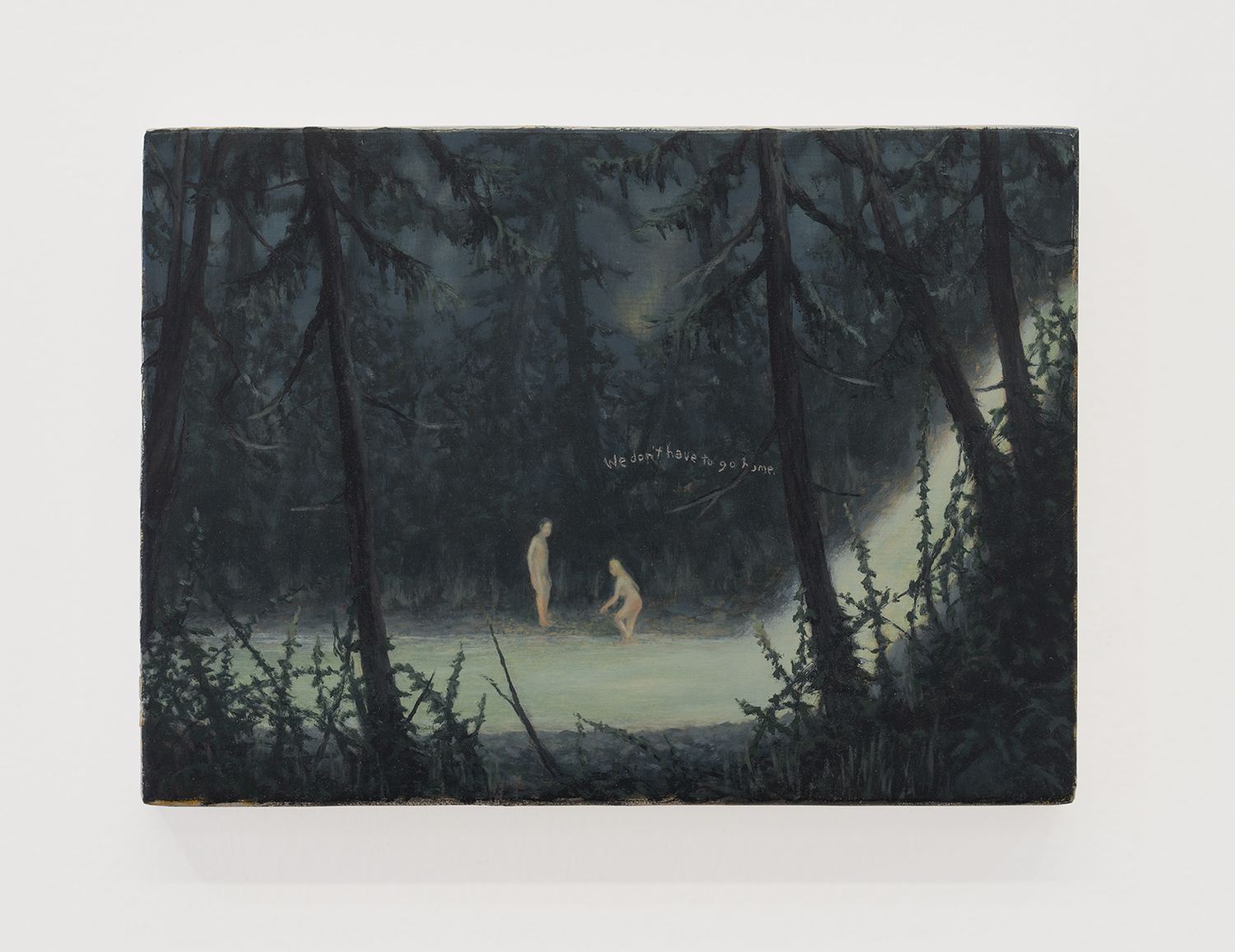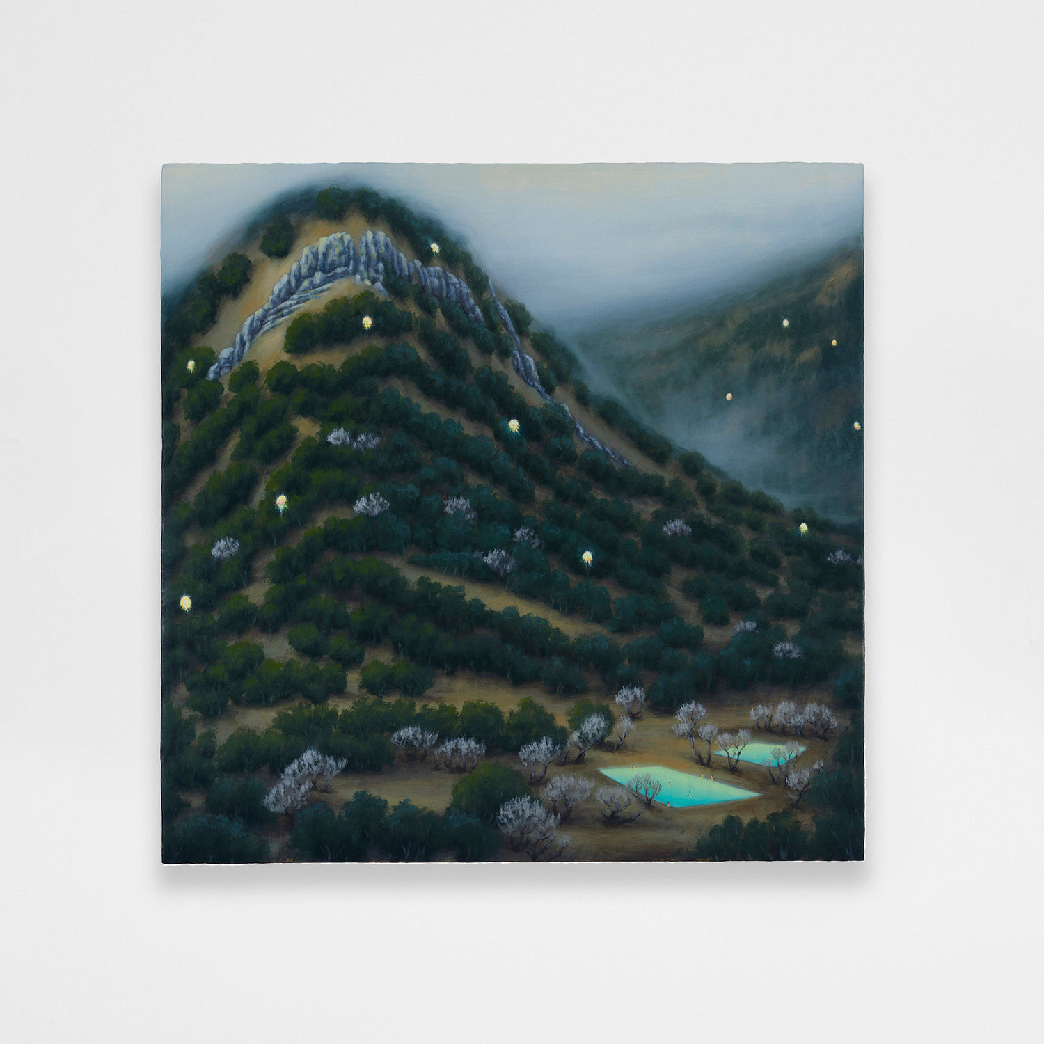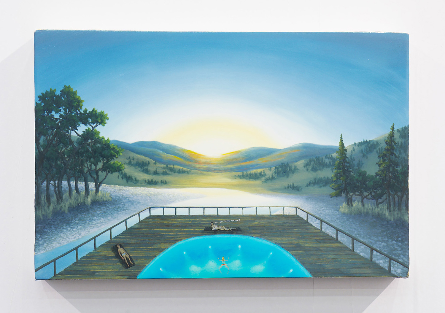 Dan Attoe has been exhibiting painting, sculpture and performance since graduating in 2004 with an MFA from the University of Iowa. He is most known for his paintings of natural scenes that uniquely combine landscape painting with genre painting; these scenes are inhabited by small human intruders who disrupt the grandiosity of their settings. This distinctive combination of two categories of fine art painting draw attention to the estrangement that man feels with nature. Attoe achieves this effect by highlighting the tendency of humans to focus on the mundane and inconsequential aspects of life while simultaneously ignoring the natural wonders that are directly in front of them.