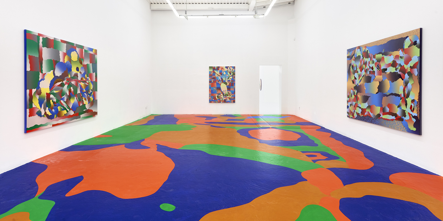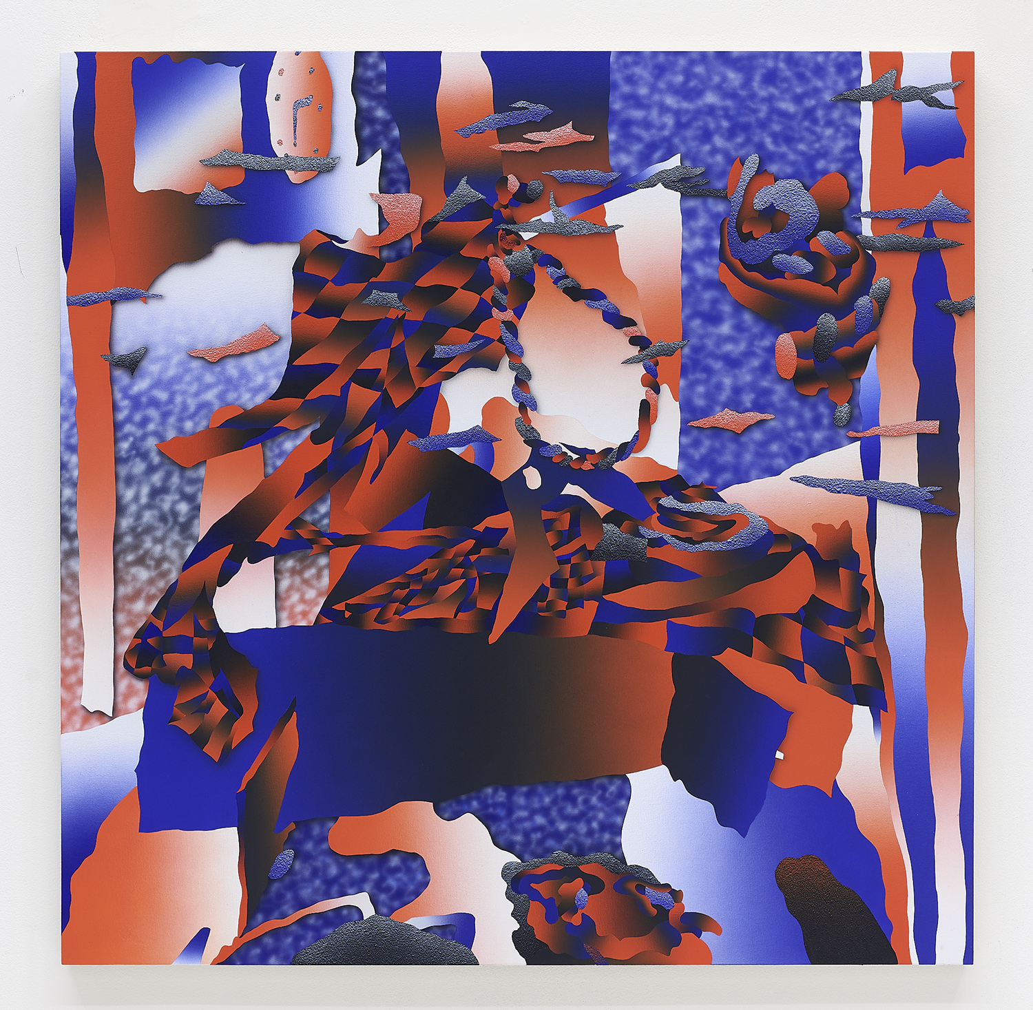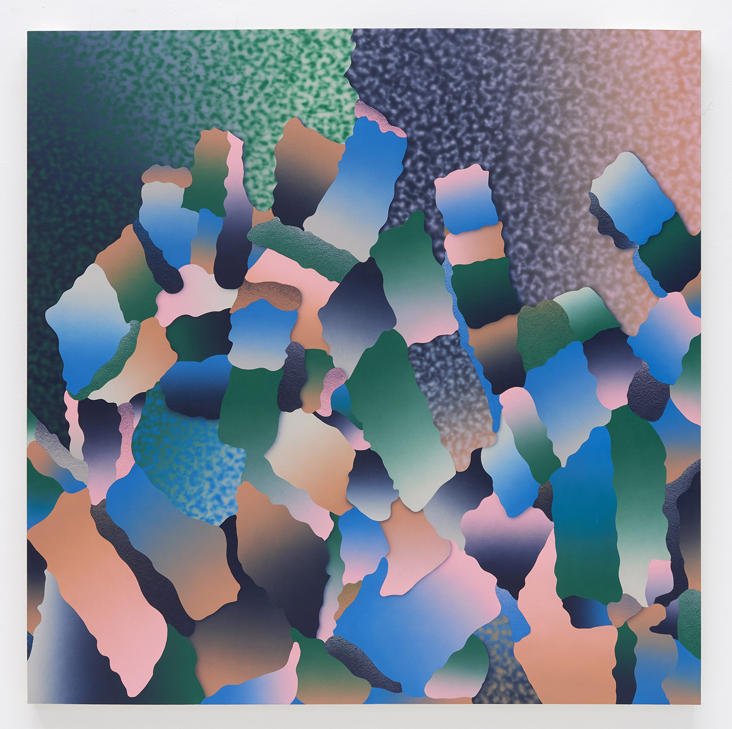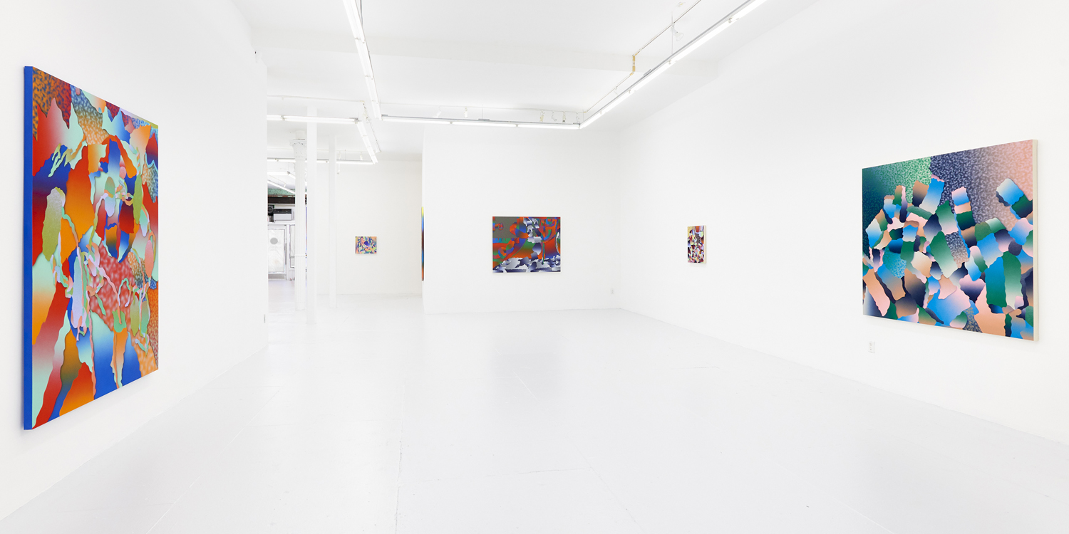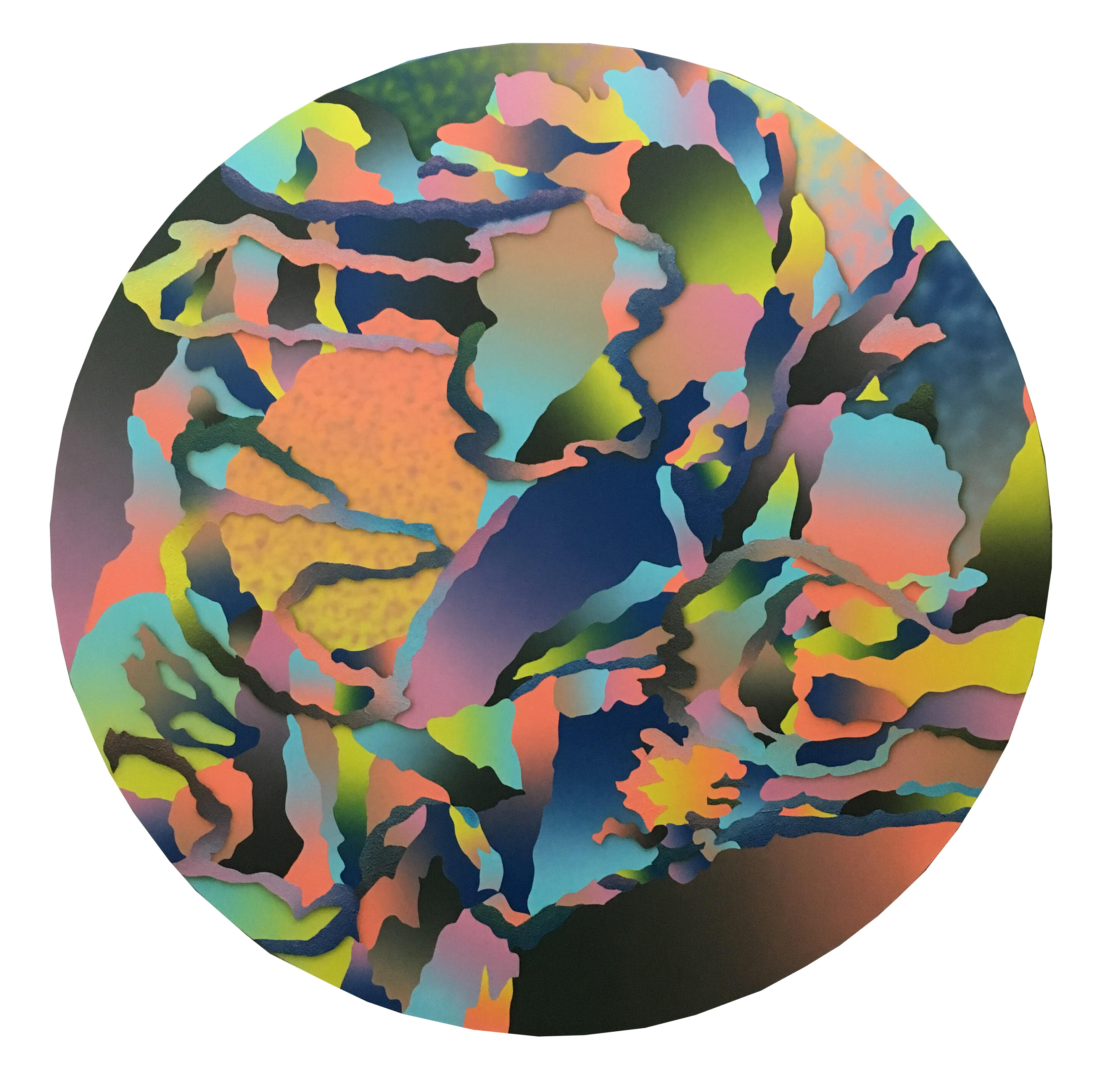 Morgan Blair (b. 1986, Worcester, MA) creates paintings with airbrush and sand or matte medium that exist in a realm of quasi abstraction and digital aesthetics. Often taking inspiration from claymation and sketching out the painting with clay, the paintings have a 3D sculptured quality to them that defies resolution. Their word-jazz spam titles pile a bunch of nonsense ideas from the internet in your head, but only further baffle your notion of what you might be looking at. A challenging palette and proliferation of bright gradients make the works feel screenic and other-worldly.
