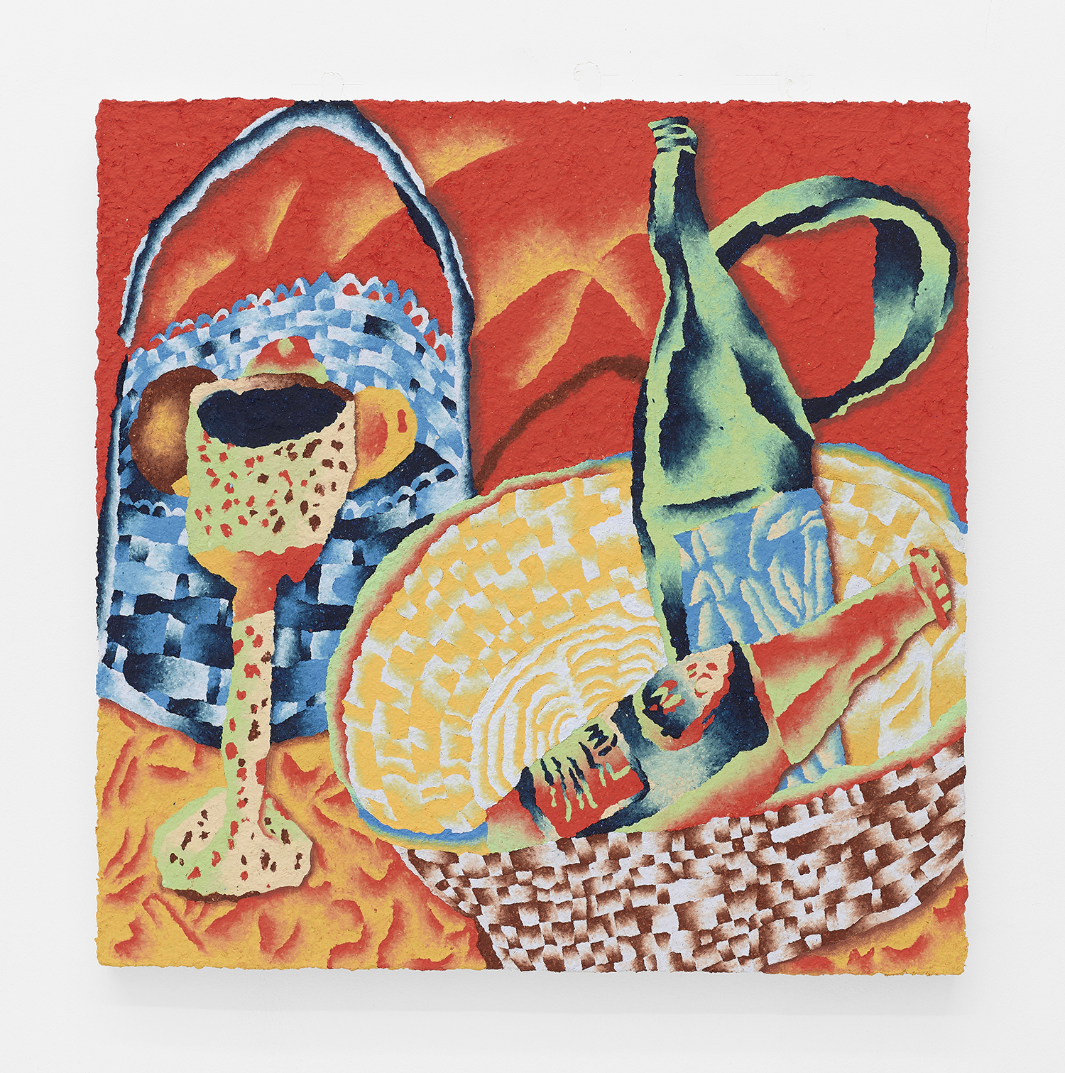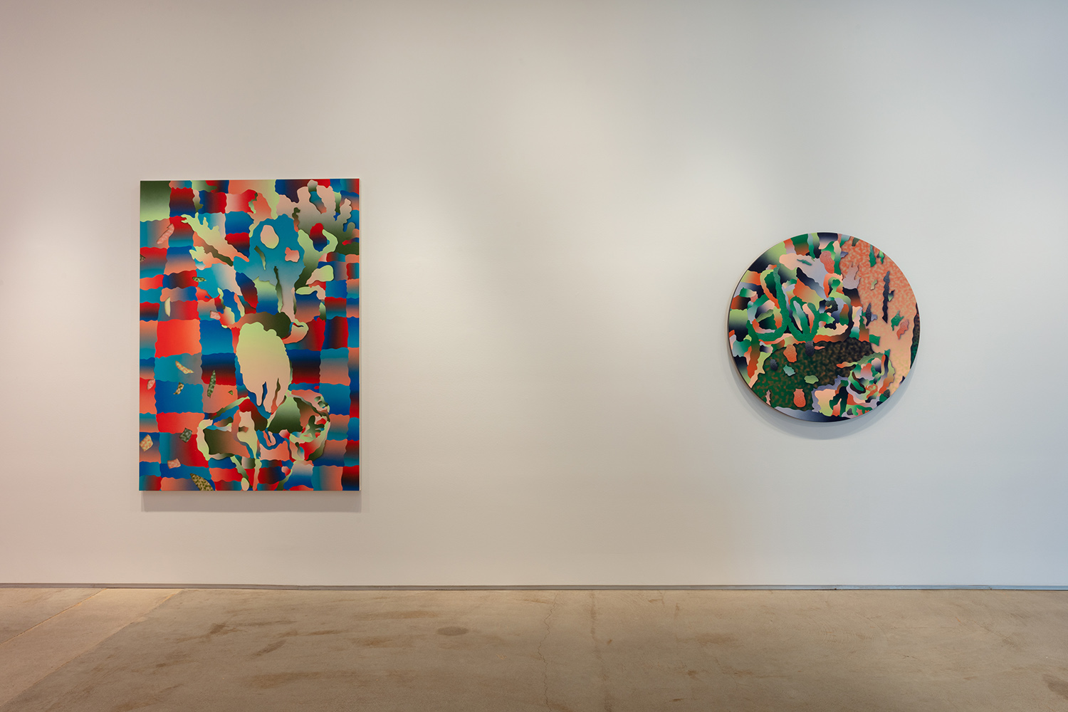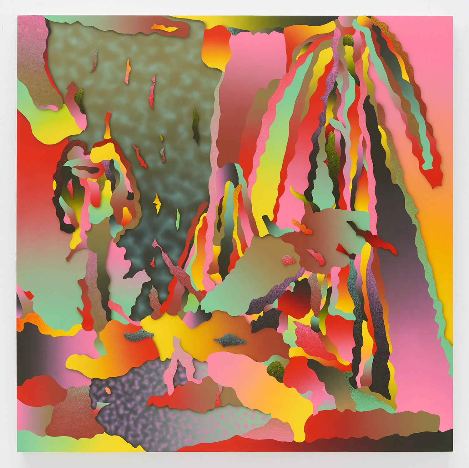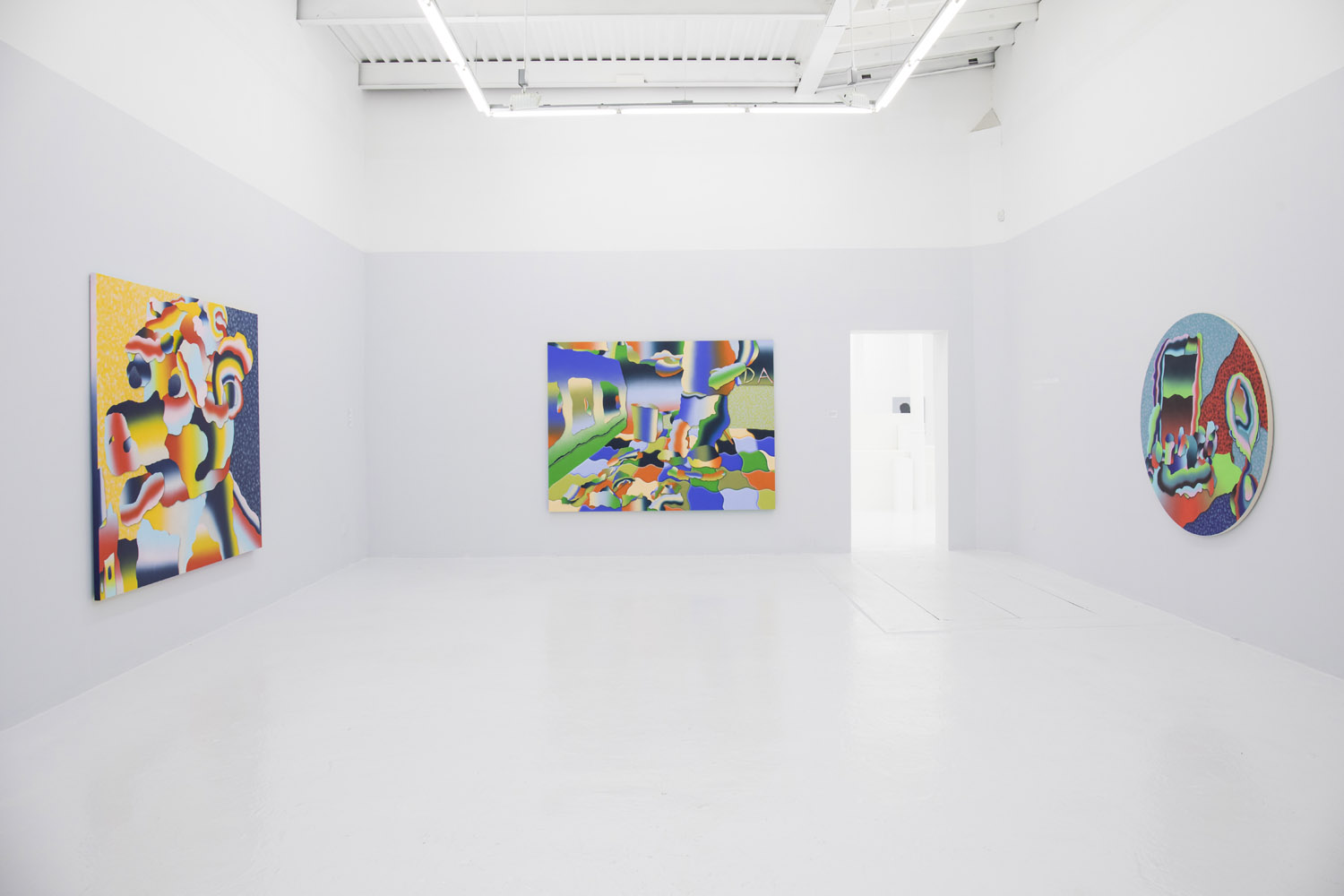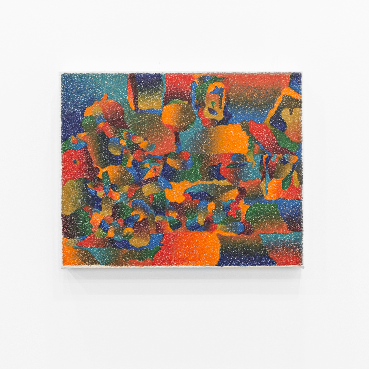 Morgan Blair (b. 1986, Worcester, MA) creates paintings with airbrush and sand or matte medium that exist in a realm of quasi abstraction and digital aesthetics. Often taking inspiration from claymation and sketching out the painting with clay, the paintings have a 3D sculptured quality to them that defies resolution. Their word-jazz spam titles pile a bunch of nonsense ideas from the internet in your head, but only further baffle your notion of what you might be looking at. A challenging palette and proliferation of bright gradients make the works feel screenic and other-worldly.
