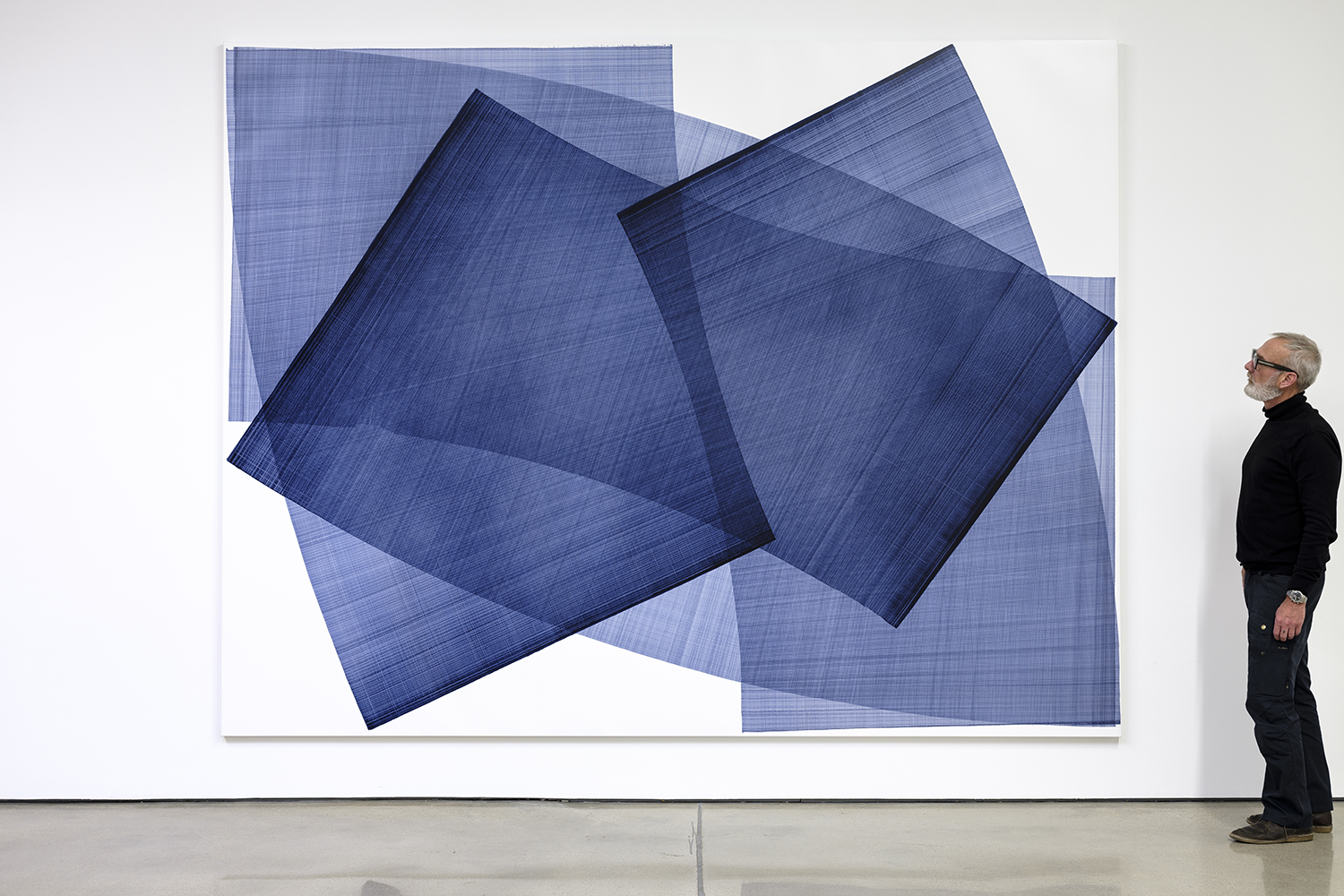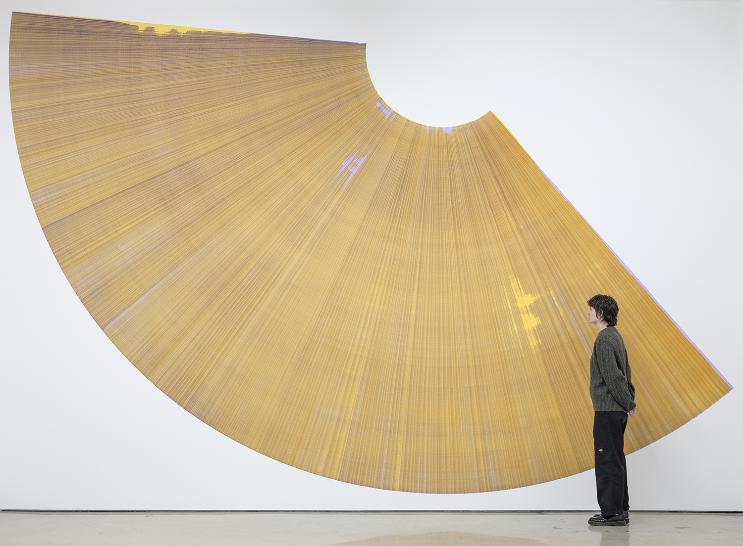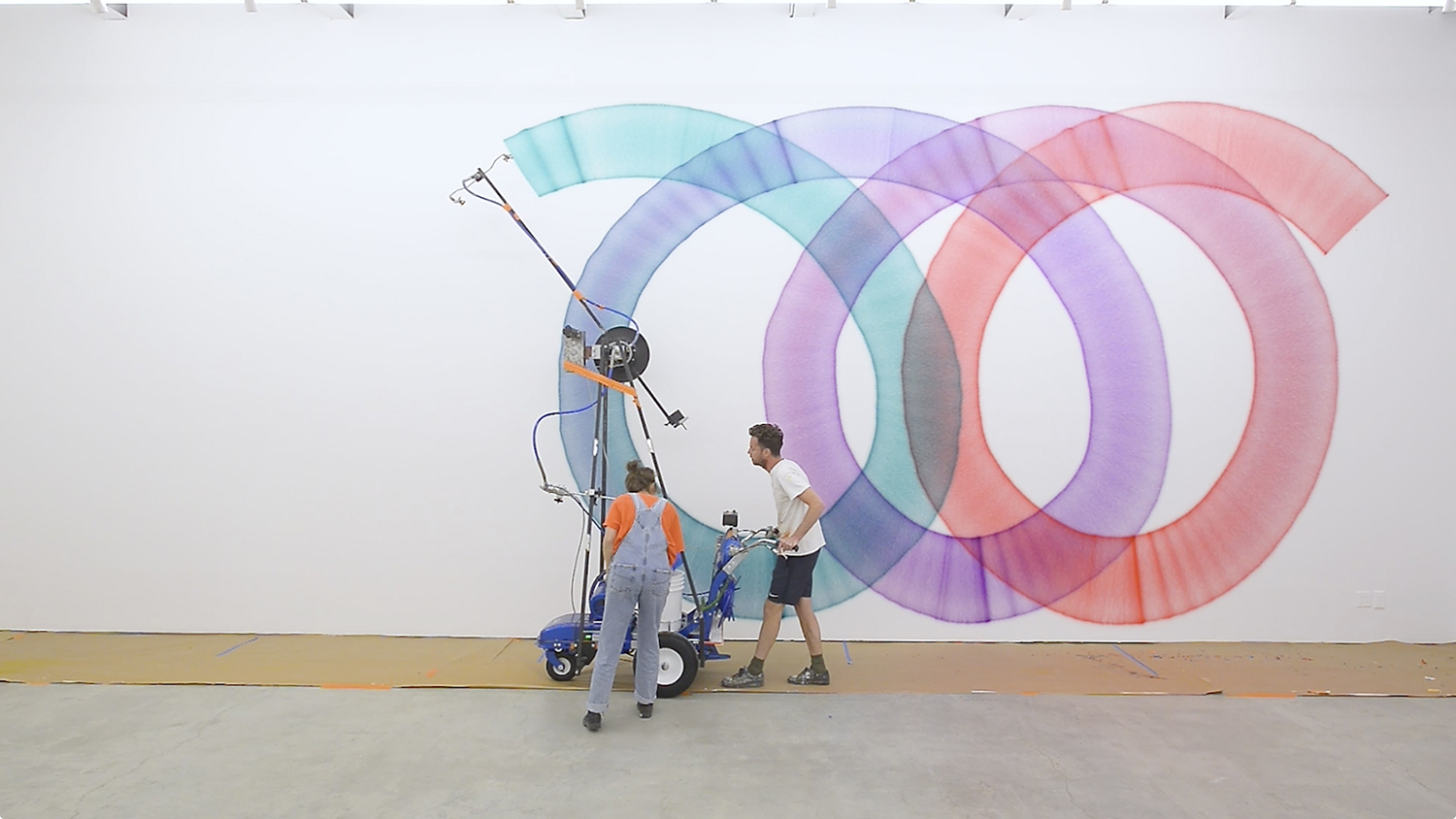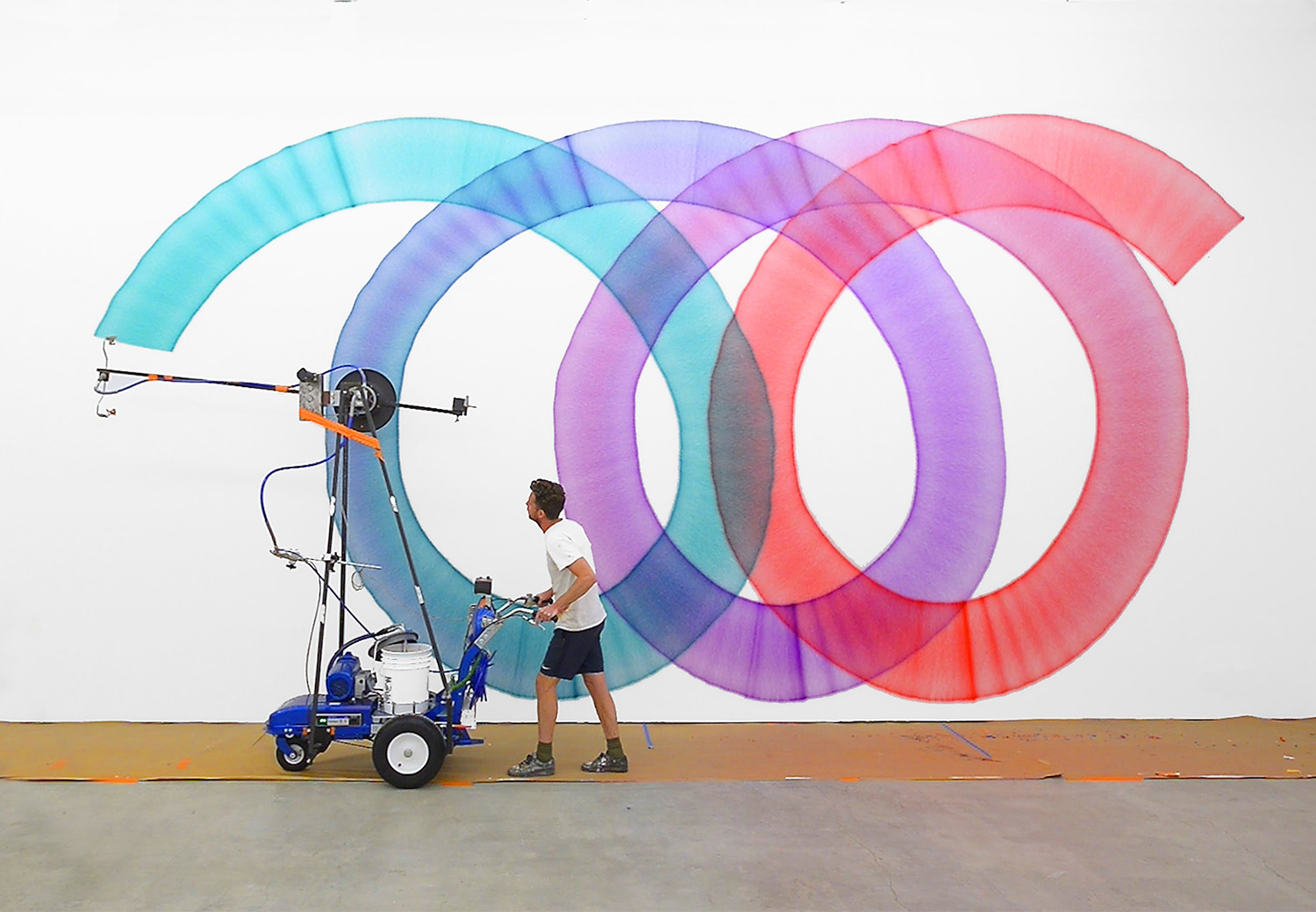 Intrigued by large vehicles such as agricultural machinery, Trum fashions cyborg-like paint sprayers with giant rotating arms to distribute colorful gradients of hypnotic, drippy loops. Whether researching the behavior of paint on paper or expanding public spaces with his colorful large-scale work, Trum gives nuance to the fundamental practice of line drawing.