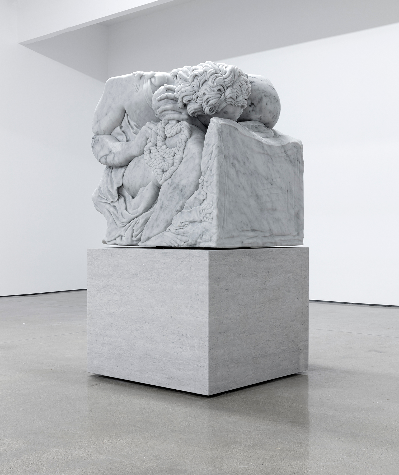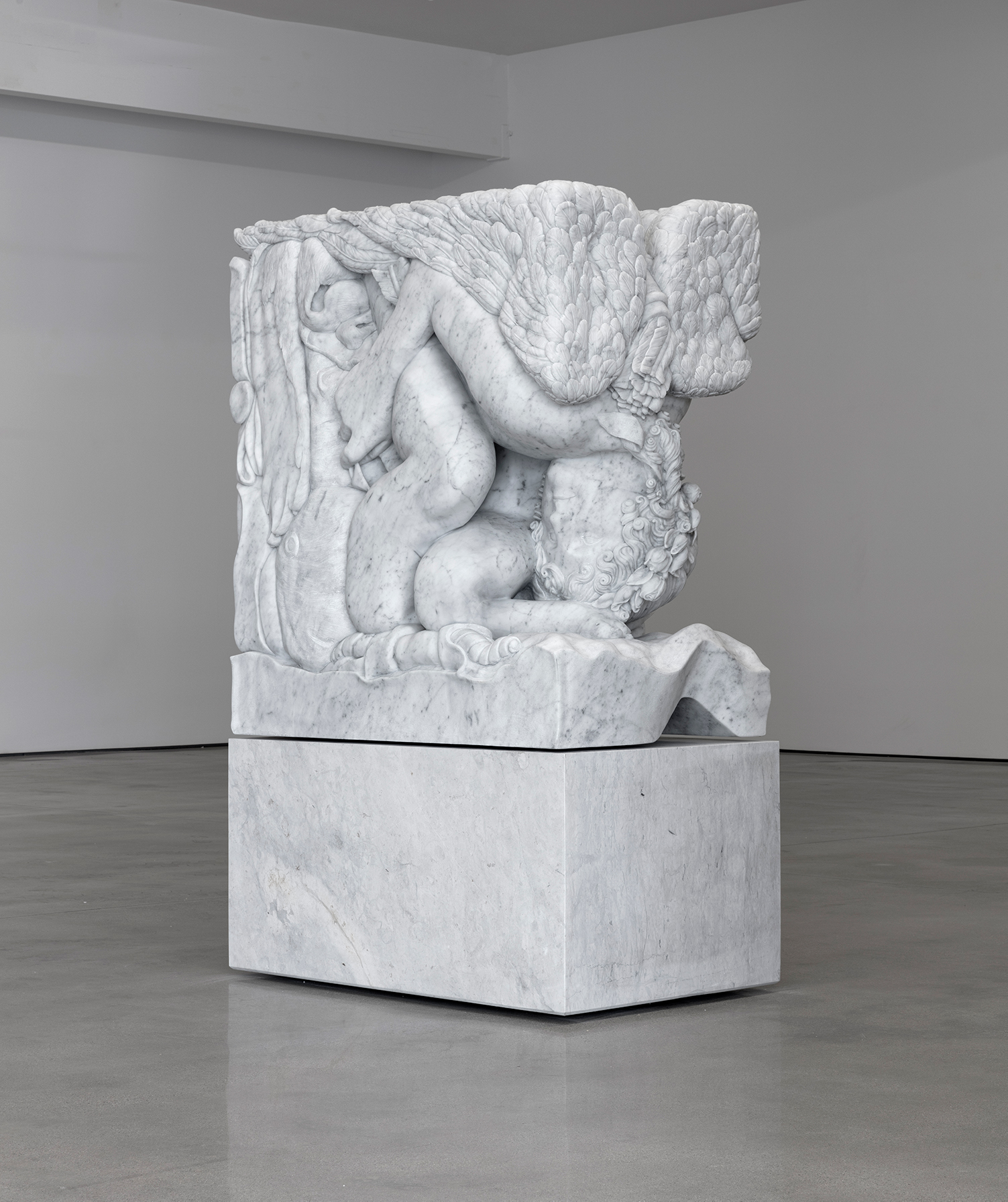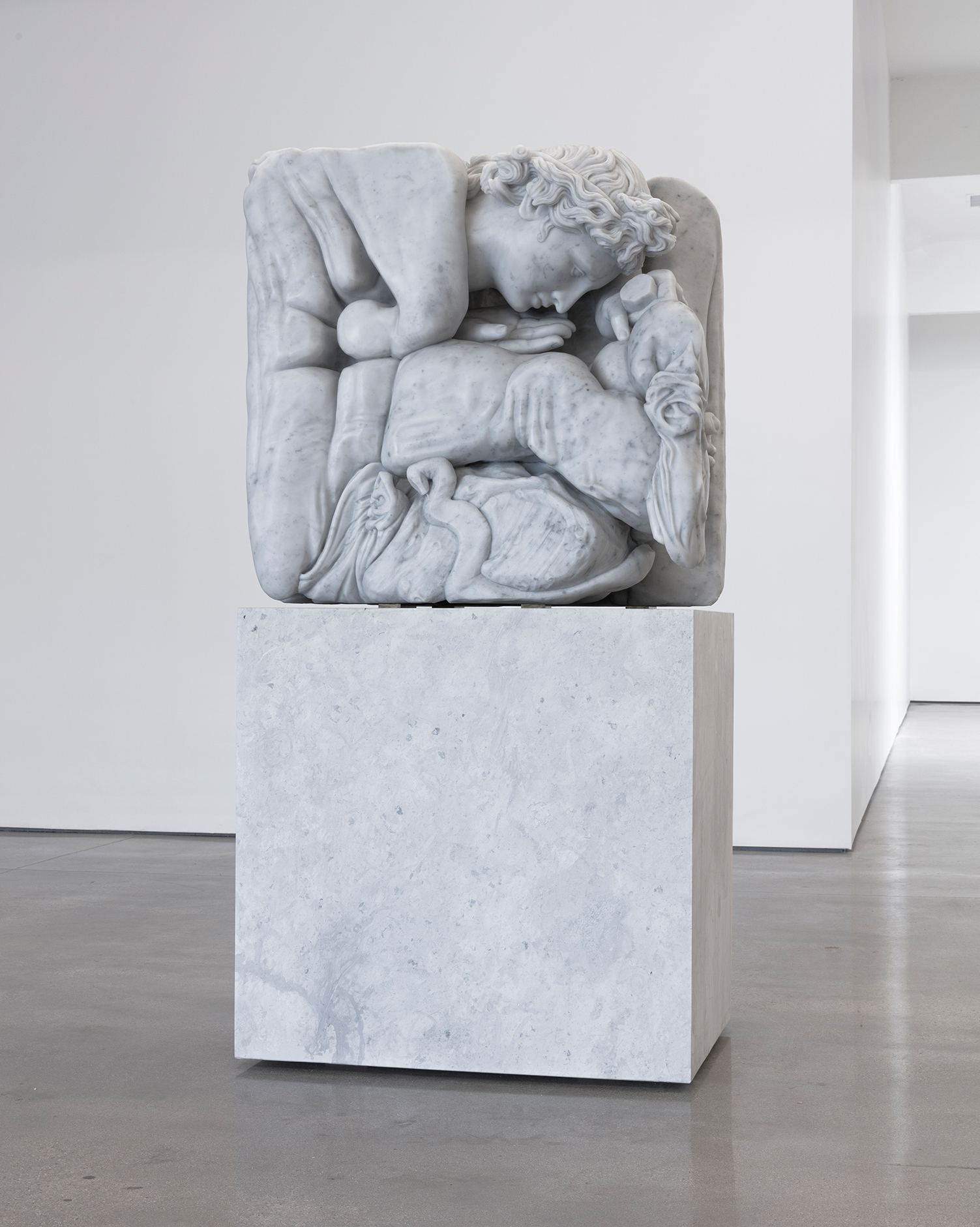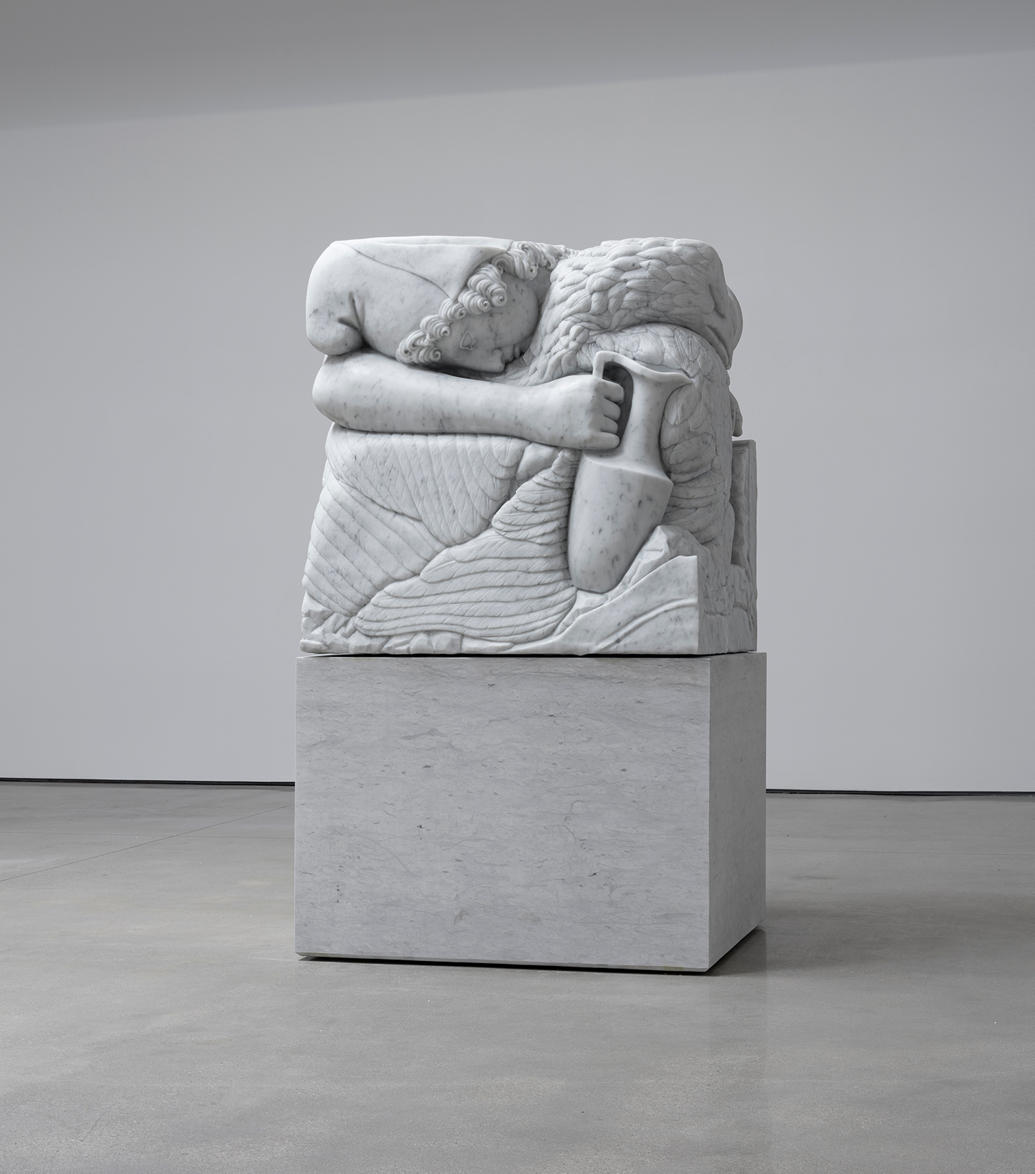 Ganymede with Jupiter’s Eagle, 2022, white carrara marble on stone pedestal, sculpture dimensions: 42 x 40 x 36 inches, 107 x 102 x 91 cm, pedestal dimensions: 30 x 41 x 35 inches, 76 x 104 x 89 cm