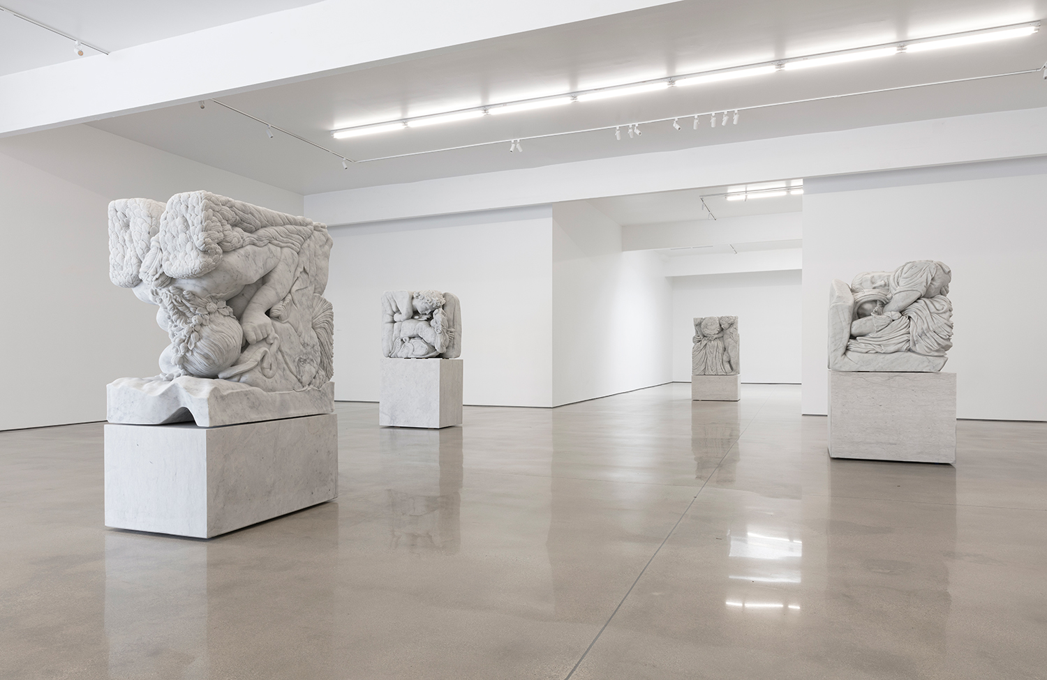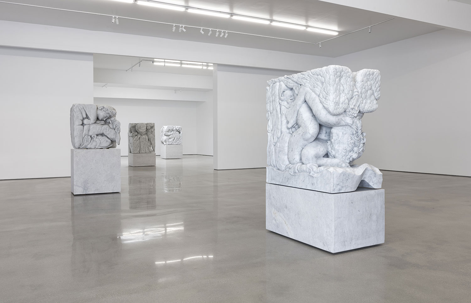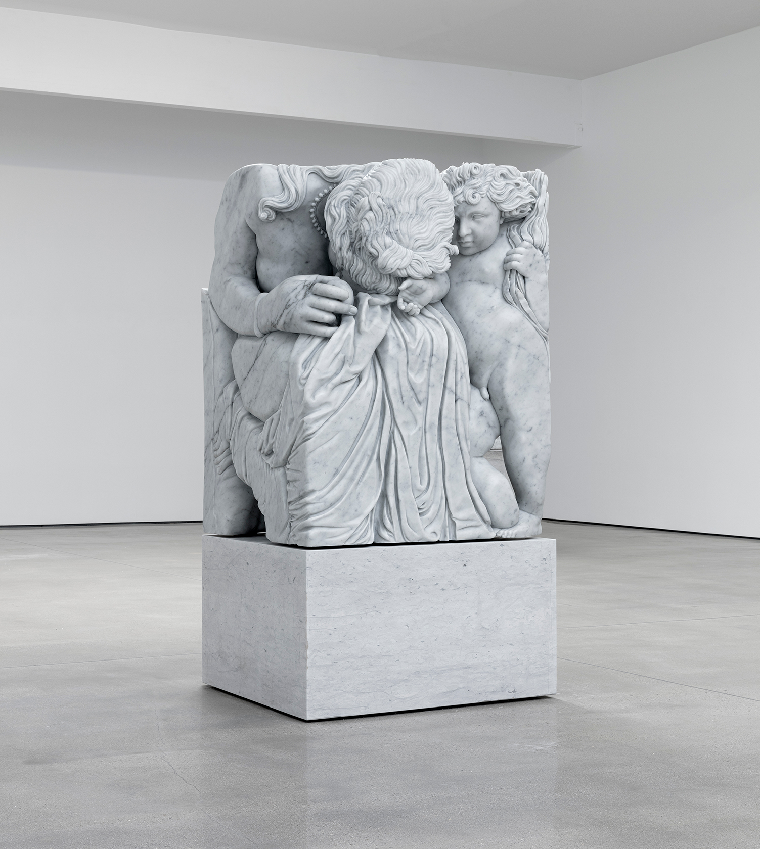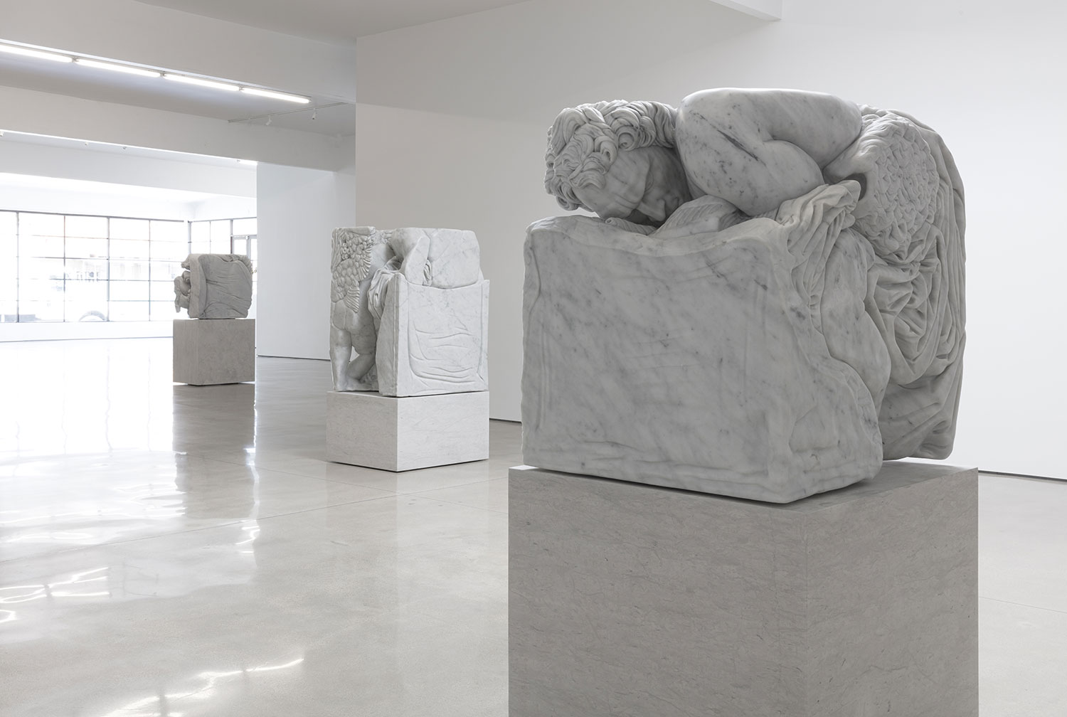 Standing, or resting, at one cubic meter each, Smith’s new sculptures are at first glance both instinctively recognizable and bizarrely different – it’s as though the canon of classical statuary has been put through a trash compactor. The artist – working with a team of master carvers, a seven-axis reductive robot, and the digital research teams at museums like the Uffizi – has rendered some of the greatest hits of Hellenic sculpture in 3D modeling programs, before compressing each of them into a compact cube, painstakingly chiseled out of a Carrara marble block. The ancient stone draws a material through-line between the sculpture Smith has chosen for his antic homage – Apollo of Belvedere, Cupid Triumphant, Bernini’s David, and others – the better to defamiliarize these paradigmatic works as they appear before the viewer, radically reshaped.