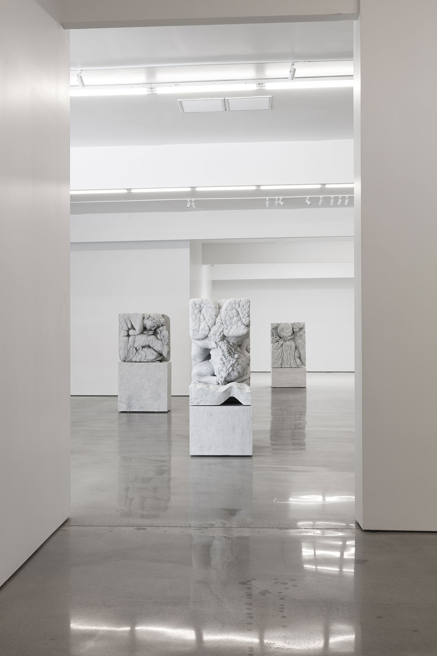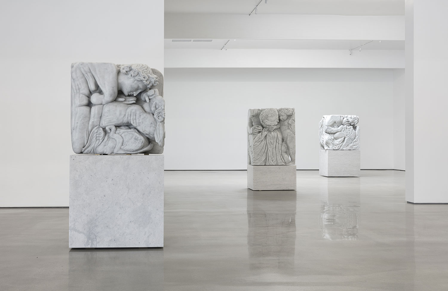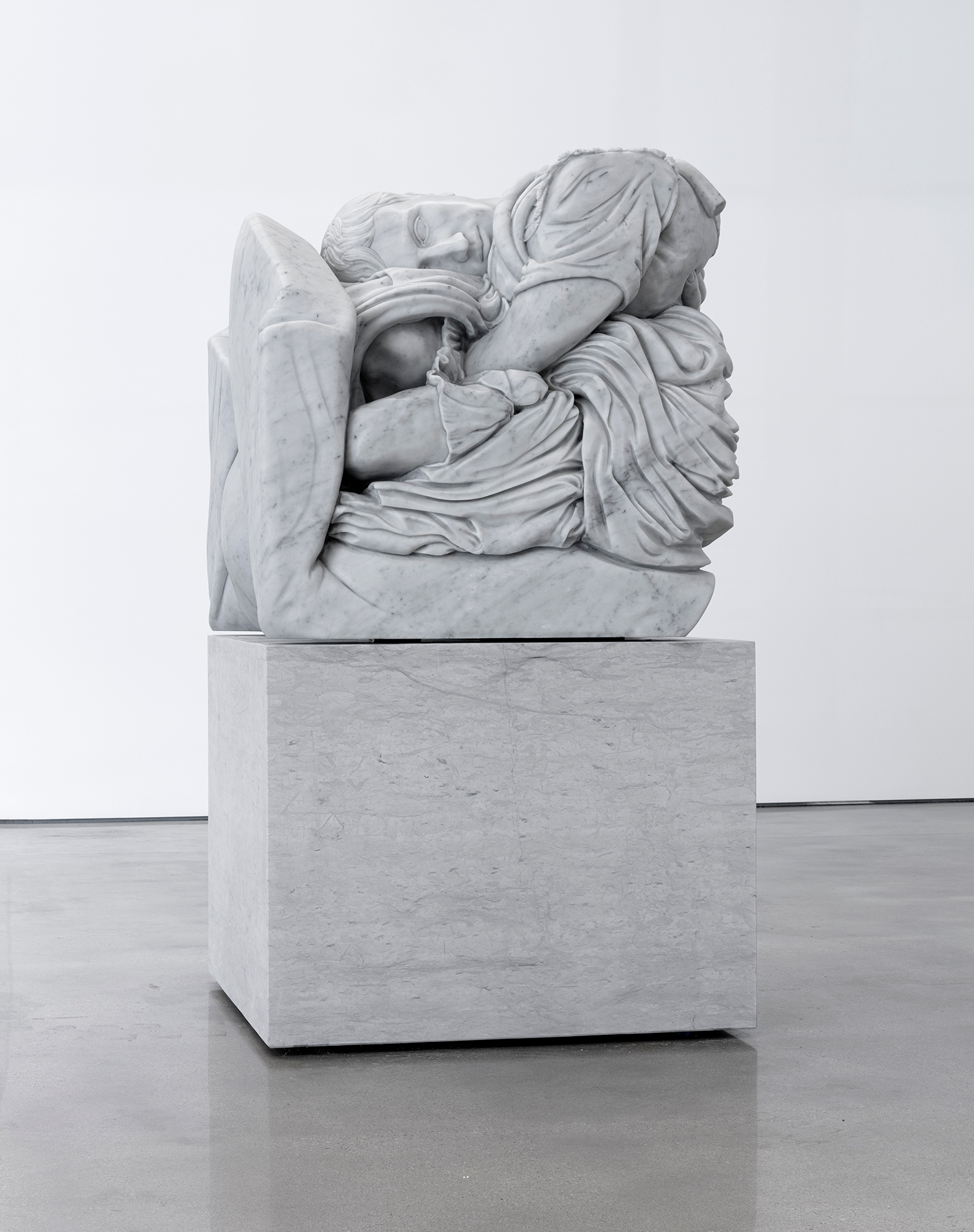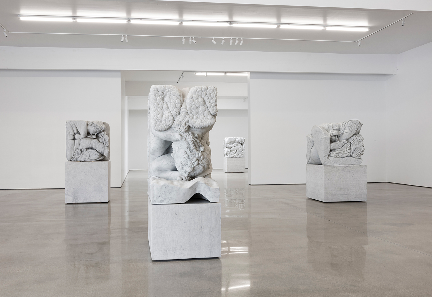 Standing, or resting, at one cubic meter each, Smith’s new sculptures are at first glance both instinctively recognizable and bizarrely different – it’s as though the canon of classical statuary has been put through a trash compactor. The artist – working with a team of master carvers, a seven-axis reductive robot, and the digital research teams at museums like the Uffizi – has rendered some of the greatest hits of Hellenic sculpture in 3D modeling programs, before compressing each of them into a compact cube, painstakingly chiseled out of a Carrara marble block. The ancient stone draws a material through-line between the sculpture Smith has chosen for his antic homage – Apollo of Belvedere, Cupid Triumphant, Bernini’s David, and others – the better to defamiliarize these paradigmatic works as they appear before the viewer, radically reshaped.