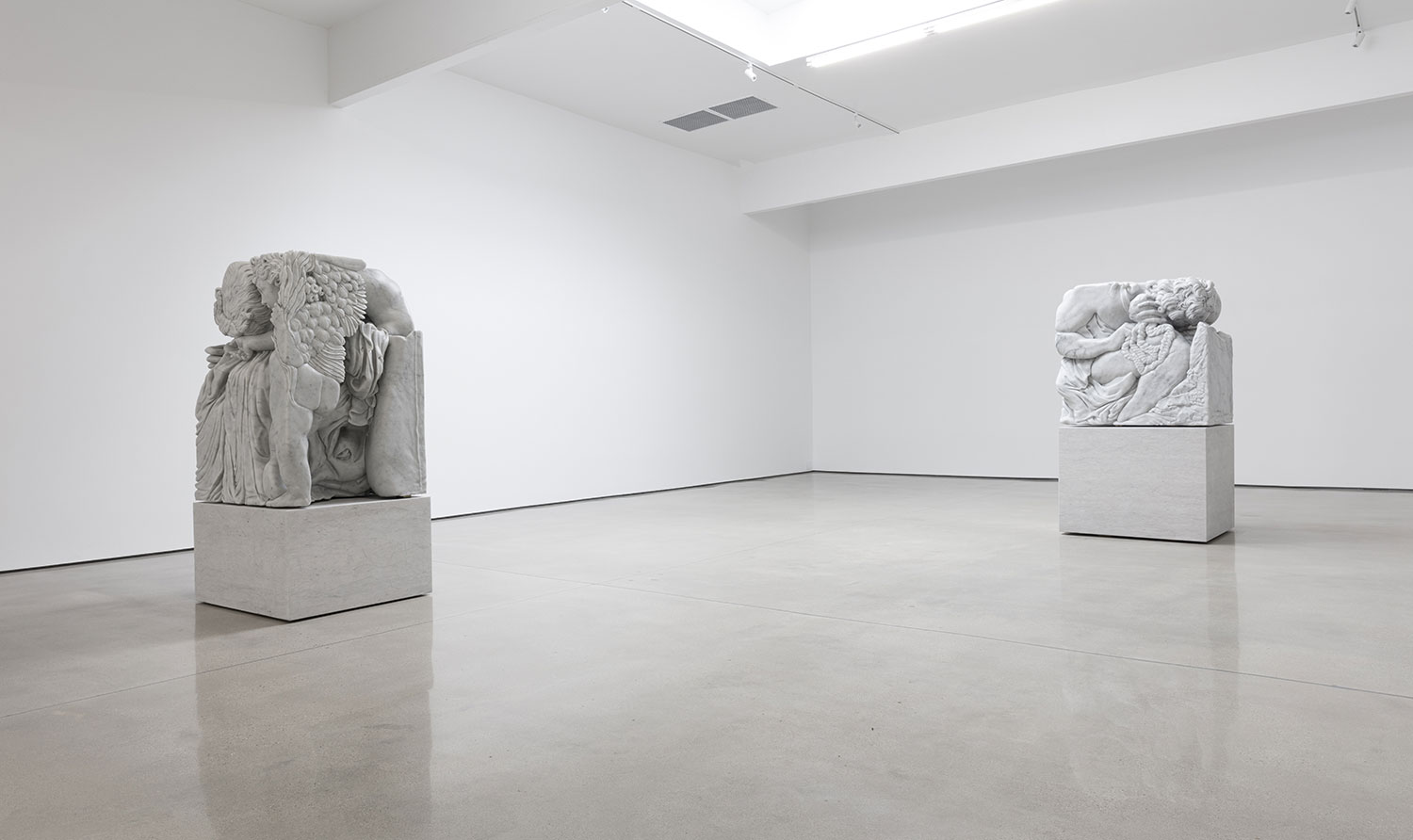 In addition to the effect of his refashioning, Crush also alludes to Smith’s complex feelings for these statues, which he first spent real time with while living in Rome. The artist notes that, whether in imitation of or response to these figure’s deific faces, ancient sculpture often inspires feelings of overwhelming adoration. We look at these perfect bodies as both an ideal and a similar; their scale and positioning suggests that we might attempt to see them eye-to-eye. In Crush, Smith is doing something else, concentrating these forms into blocks so that specific objects collapse to the form of a unit – the kind that might be shipped, stocked, counted or measured. As he has demonstrated elsewhere with Giambologna’s three-figure Rape of the Sabines, such canonic blocks are stackable. In doing so, he interrupts the admiration and ardor we impose on such forms, allowing us to see them in a profoundly new way.