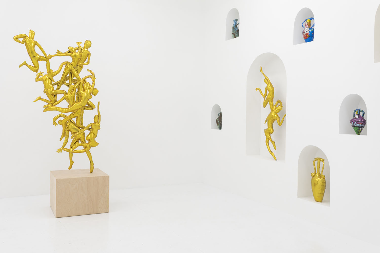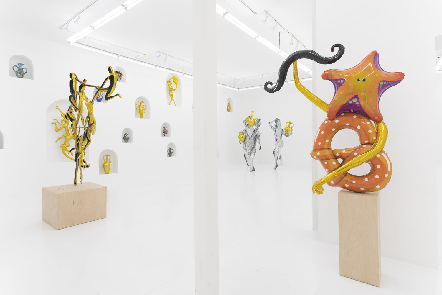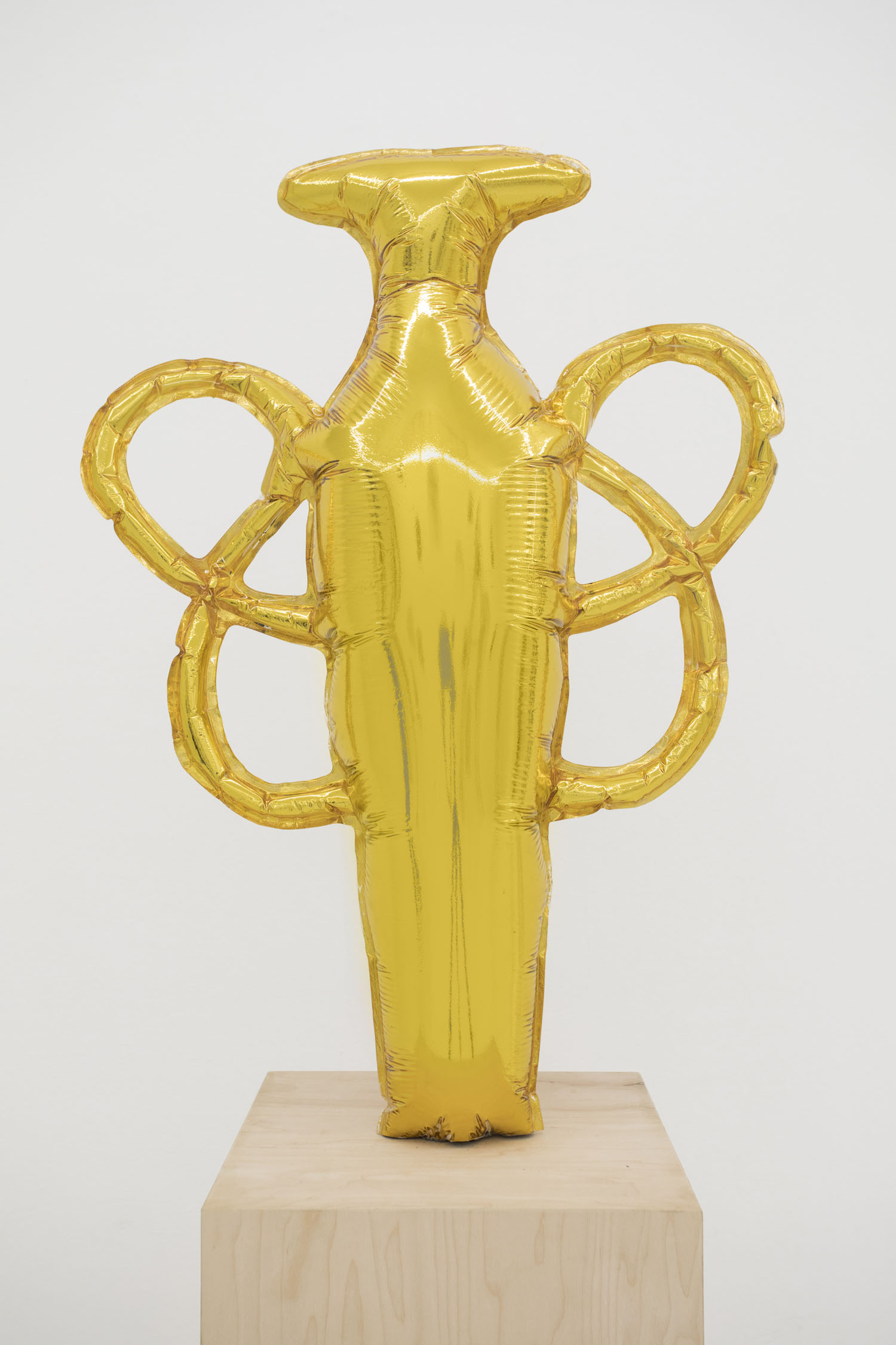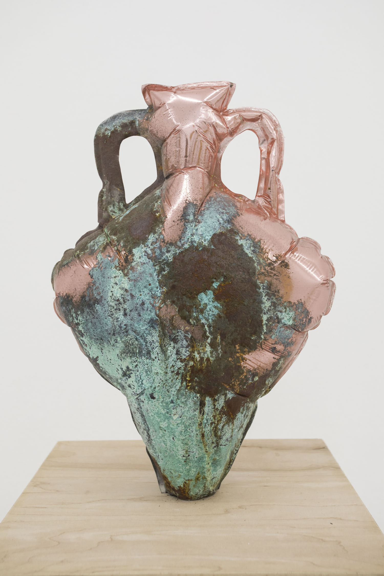 In the first room of the exhibition, groupings of customized mylar balloon shapes are remixed into Spartan warriors, Odysseus, Prometheus or other Greek tropes. Fifteen Greek vases fill an alcoved wall of the rear gallery, many of which are faux-bronzed to look recently unearthed from some sort of dig. Equal parts Met Museum and 99cent store, this display of baffling objects in a stylized presentation collapses centuries of sensibility. In the above piece, EVA foam is printed in faux-marble, fake bronzed on the back and then shaped into three undulating female figures holding vases. Is it a playful allusion to the impermanence of Classical materials and the oft-idealized historical representations of the female body, or is it a bizarre new sales approach at the vase store?