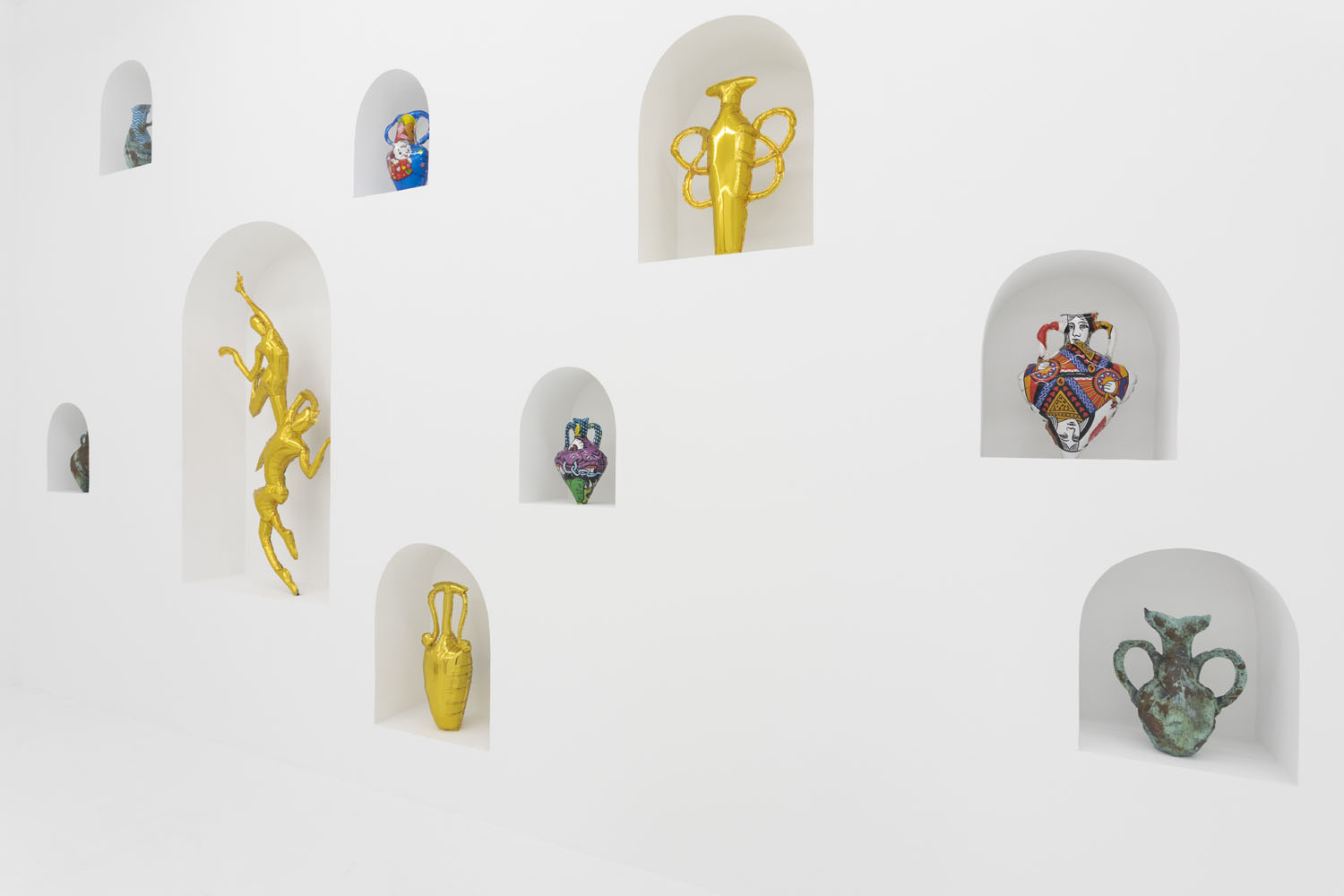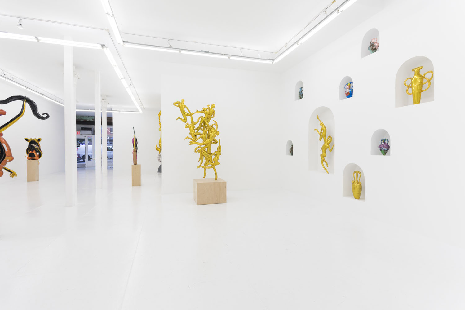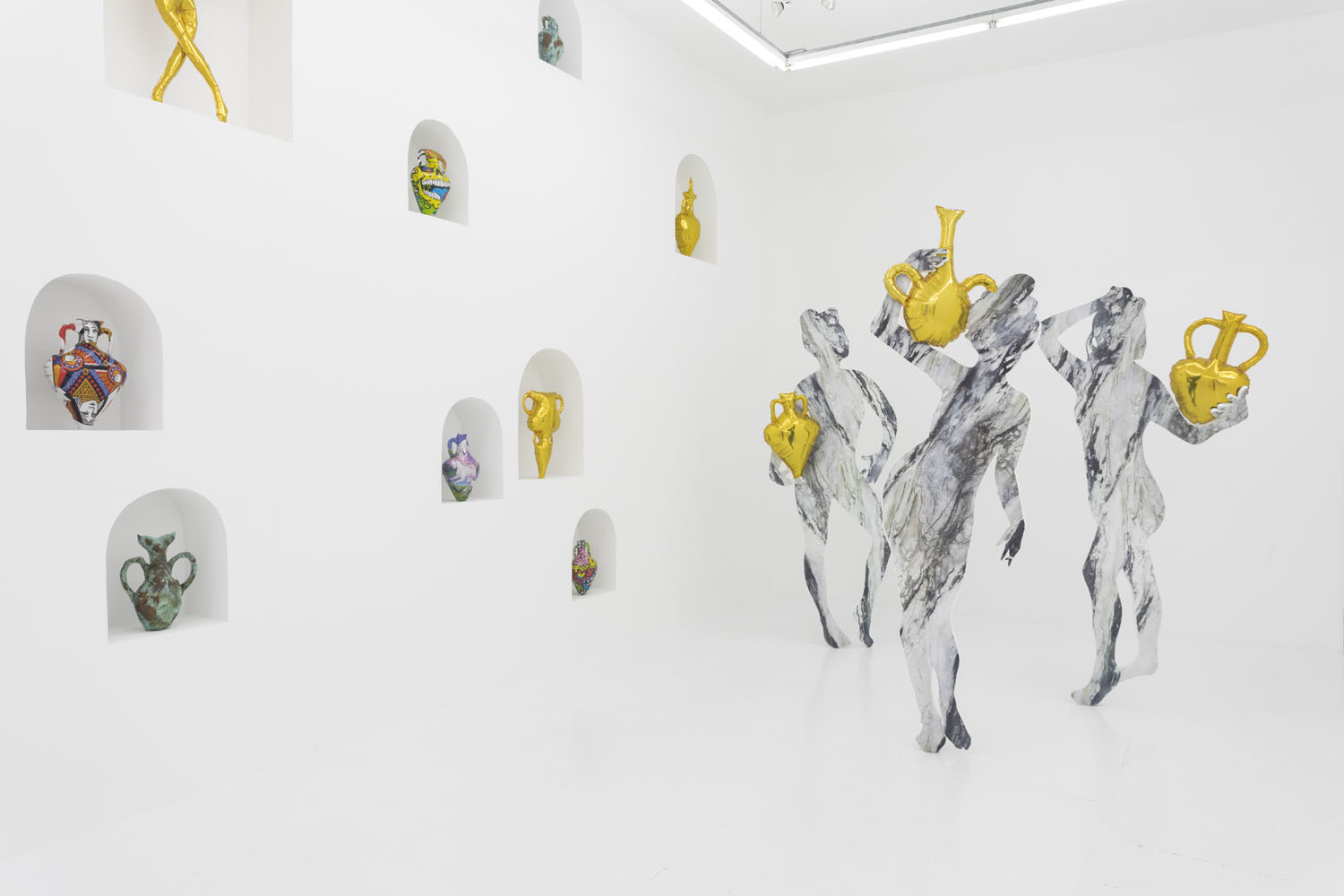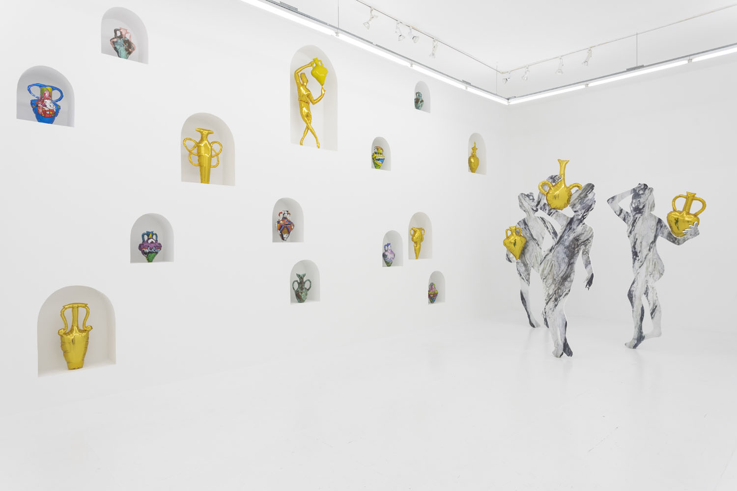 In the first room of the exhibition, groupings of customized mylar balloon shapes are remixed into Spartan warriors, Odysseus, Prometheus or other Greek tropes. Fifteen Greek vases fill an alcoved wall of the rear gallery, many of which are faux-bronzed to look recently unearthed from some sort of dig. Equal parts Met Museum and 99cent store, this display of baffling objects in a stylized presentation collapses centuries of sensibility. In the above piece, EVA foam is printed in faux-marble, fake bronzed on the back and then shaped into three undulating female figures holding vases. Is it a playful allusion to the impermanence of Classical materials and the oft-idealized historical representations of the female body, or is it a bizarre new sales approach at the vase store?