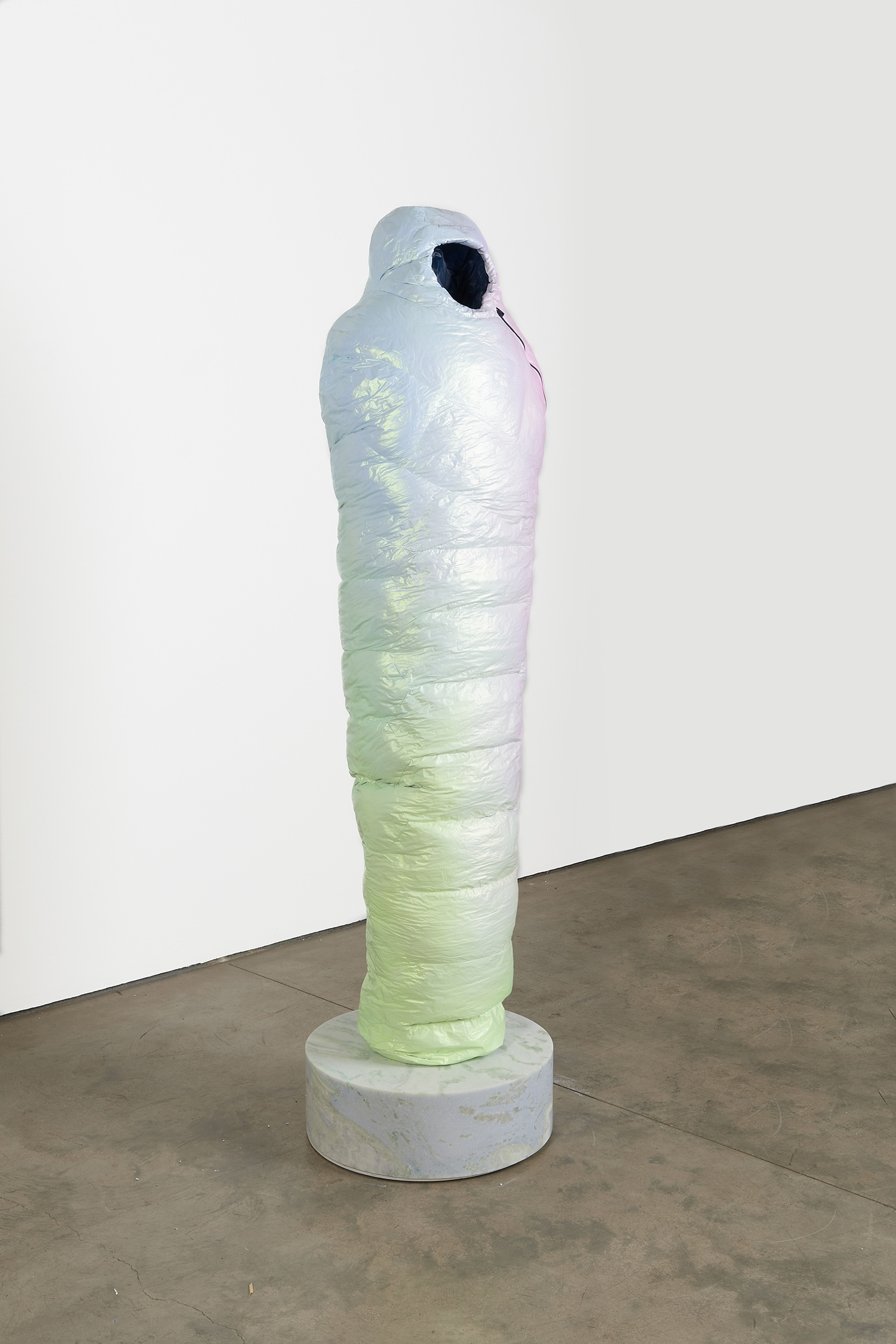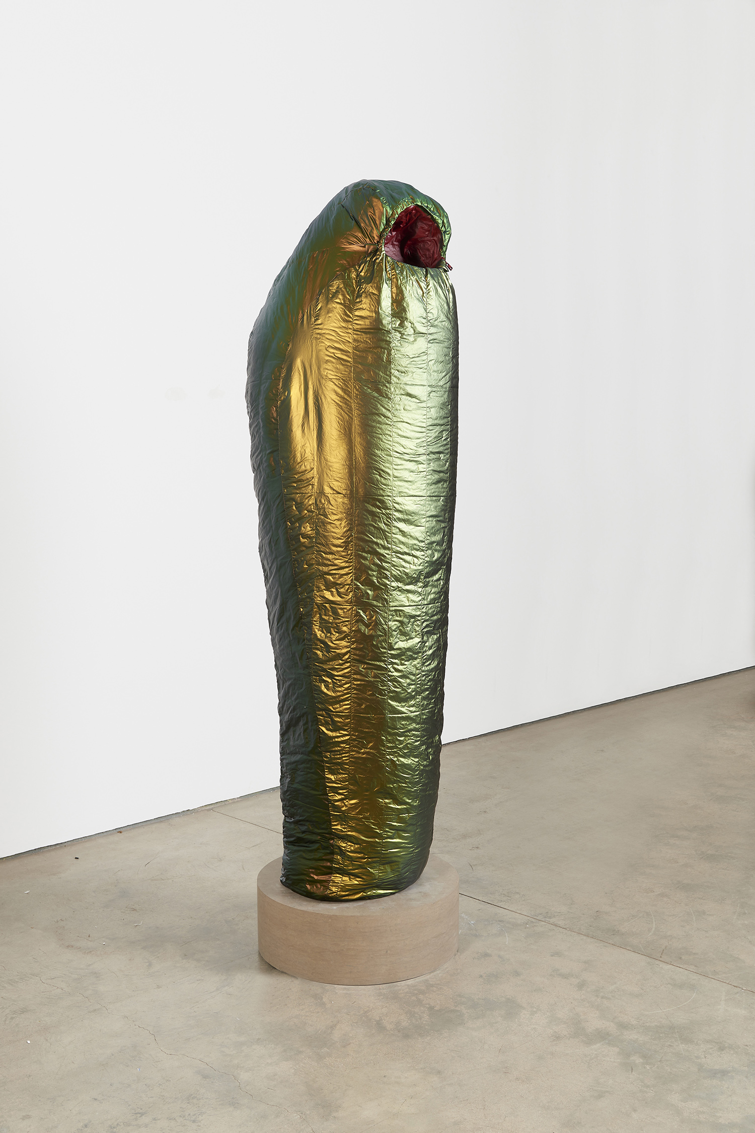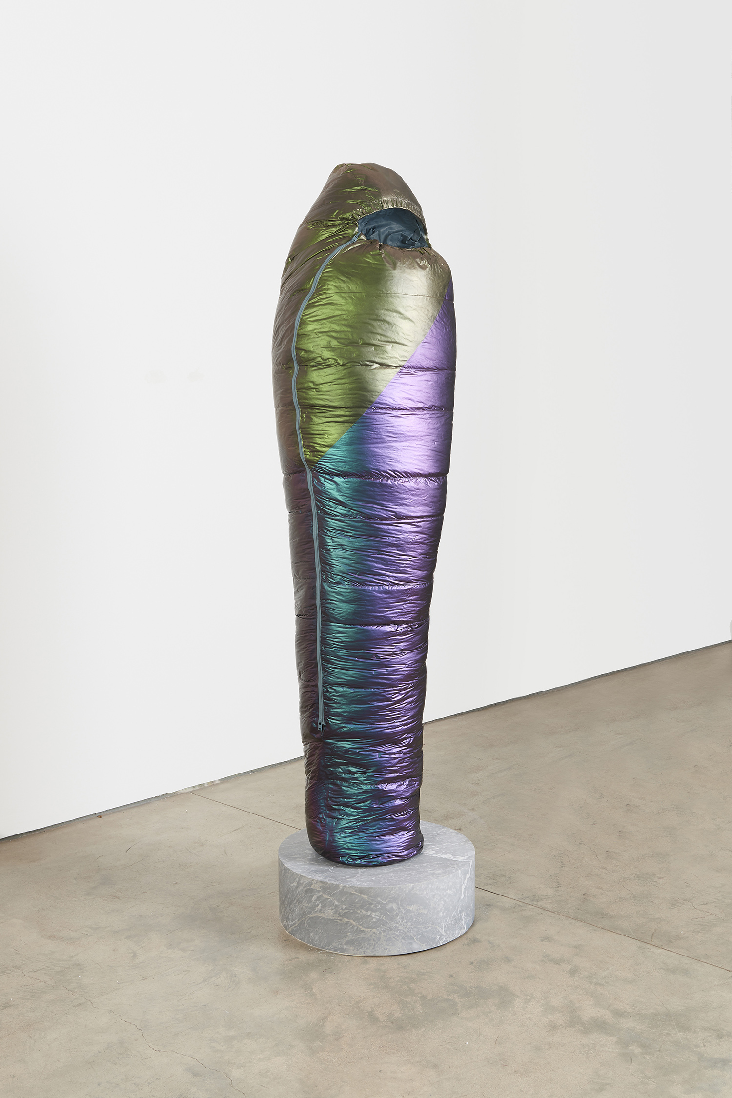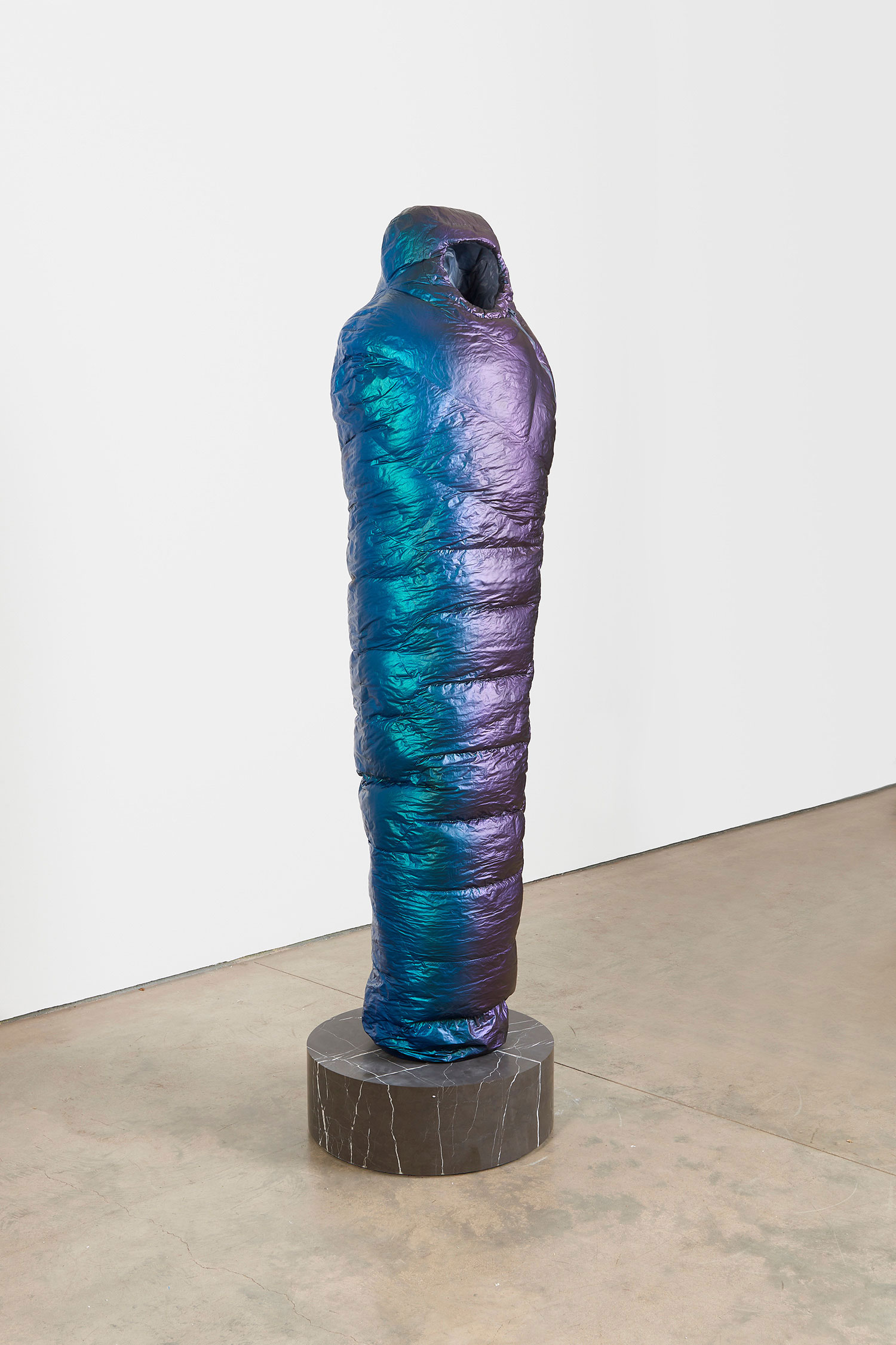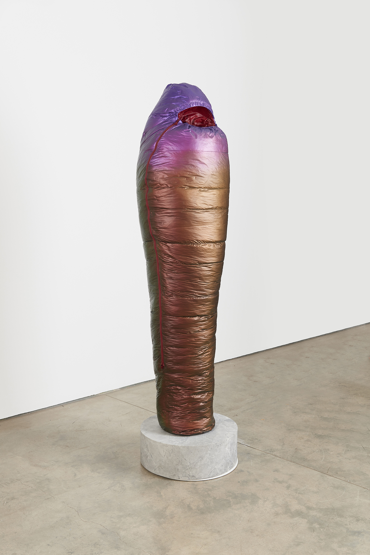 Sarcophagus (Copper to Purple), 2021. Resin, catalyzed urethane, steel, fiberglass, marble. Sleeping bag: 77.5 x 19 x 12.5 inches, 197 x 48 x 32 cm. Base: 8 x 24 x 24 inches, 23 x 61 x 61 cm.