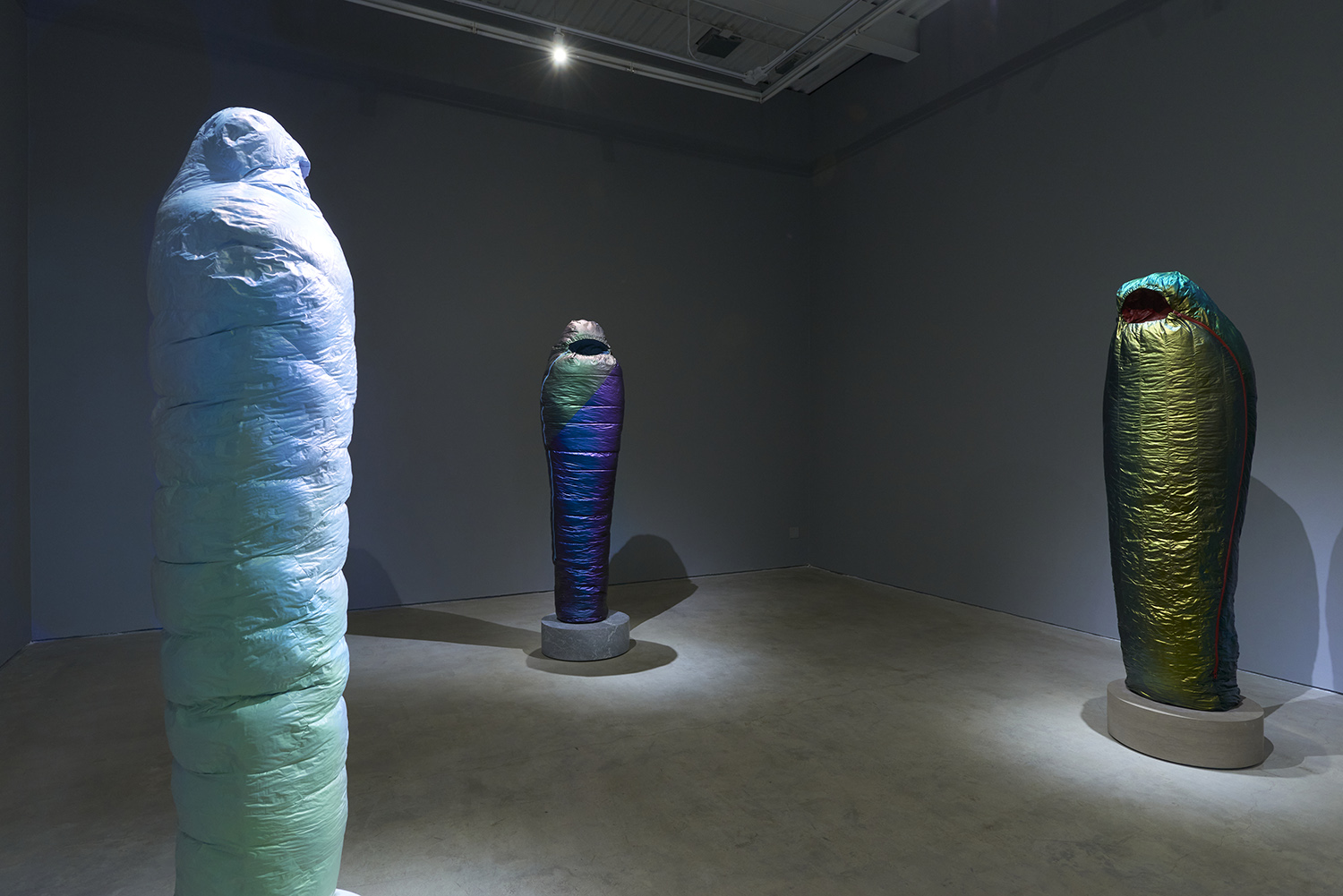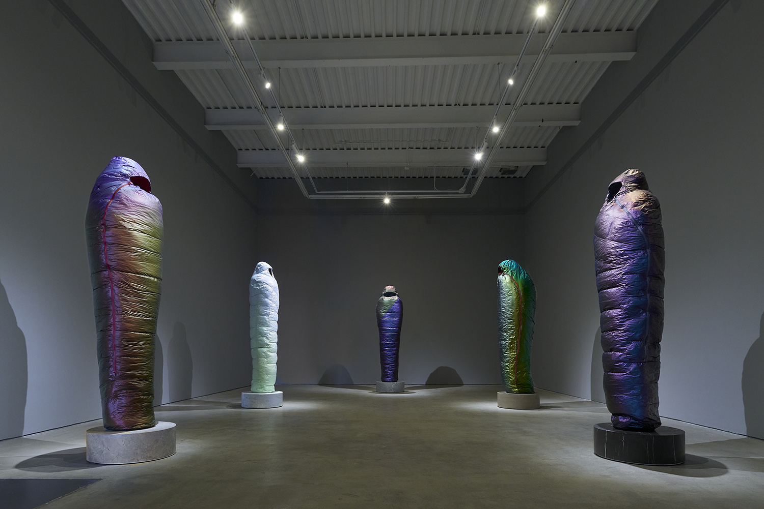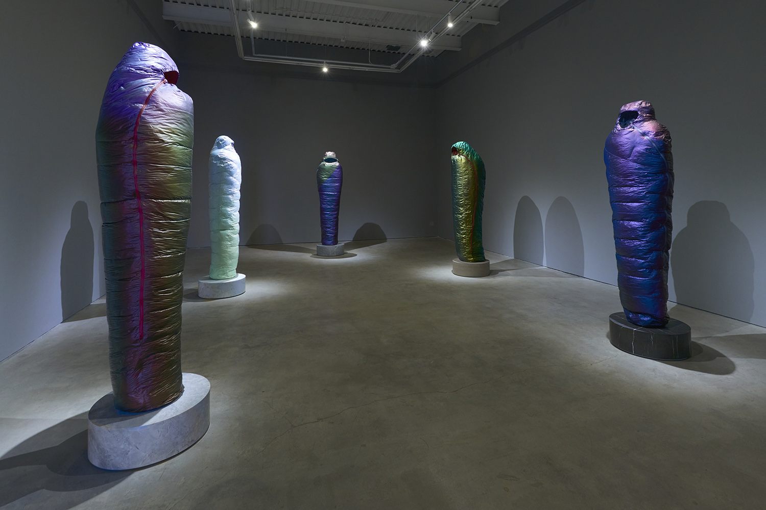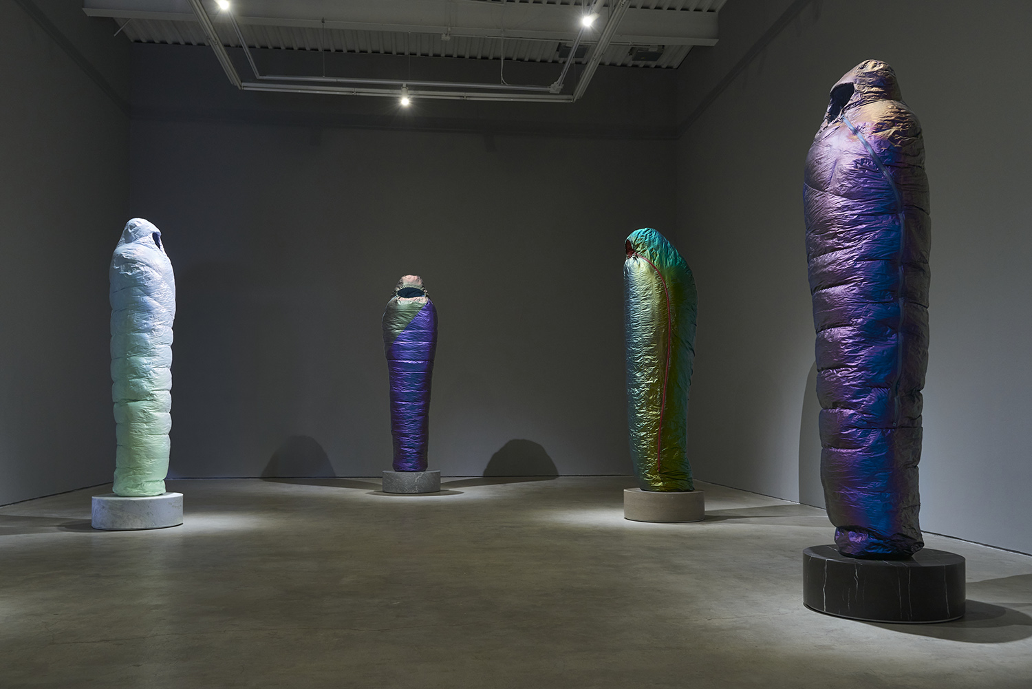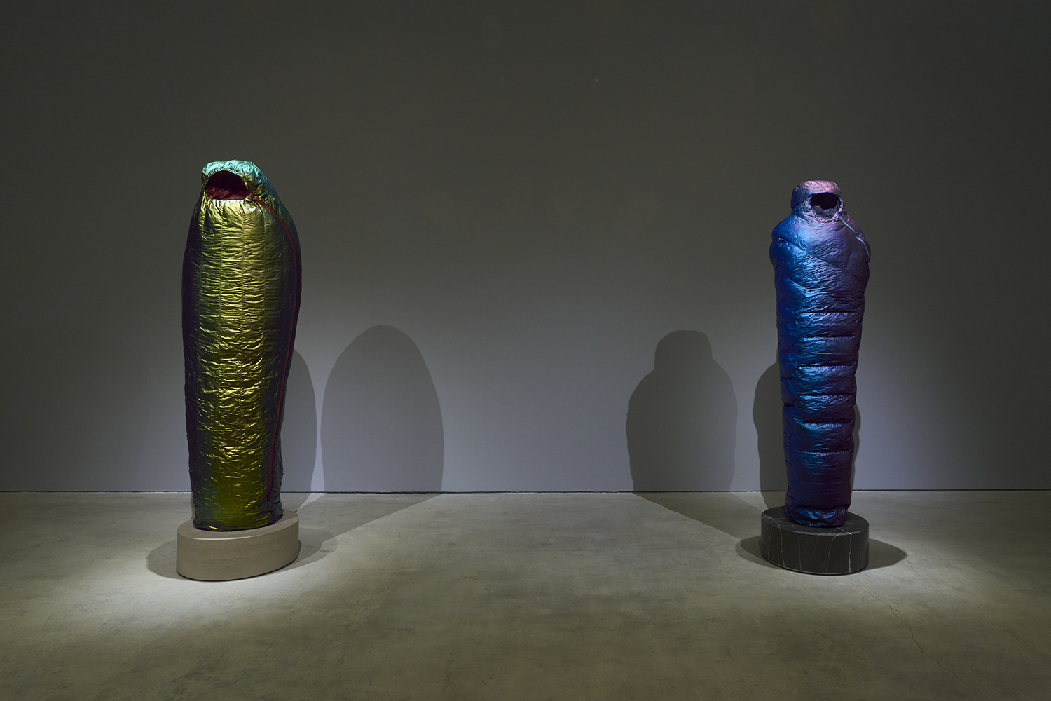 Sarcophagus (Copper to Purple), 2021. Resin, catalyzed urethane, steel, fiberglass, marble. Sleeping bag: 77.5 x 19 x 12.5 inches, 197 x 48 x 32 cm. Base: 8 x 24 x 24 inches, 23 x 61 x 61 cm.