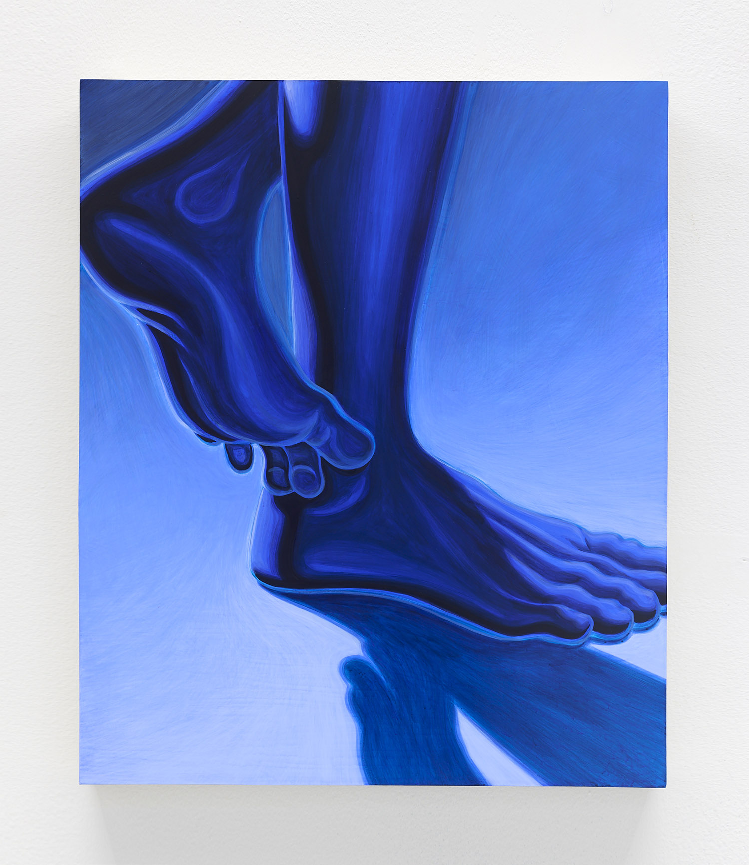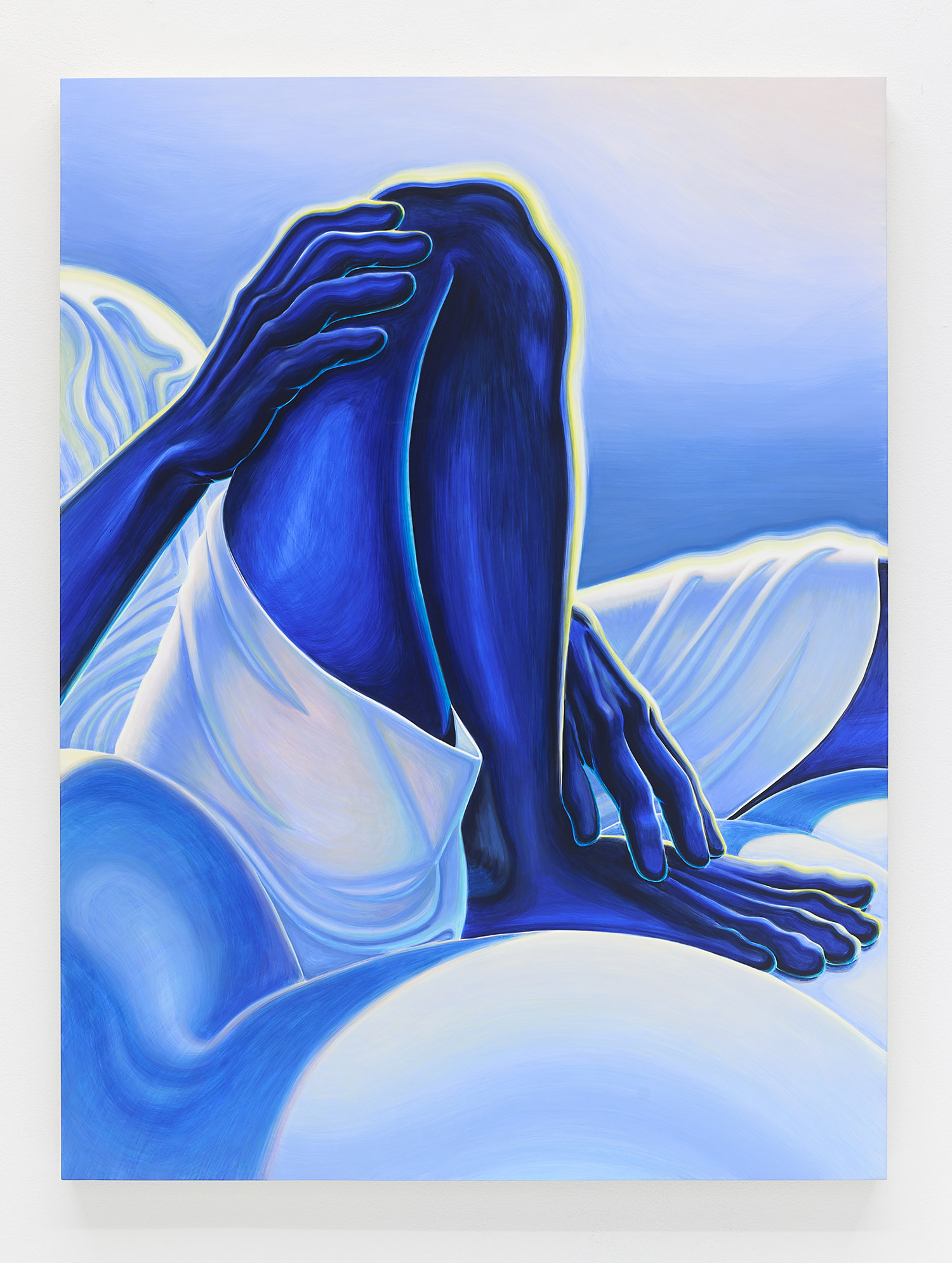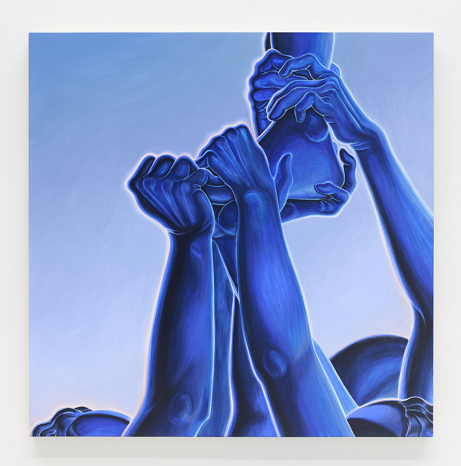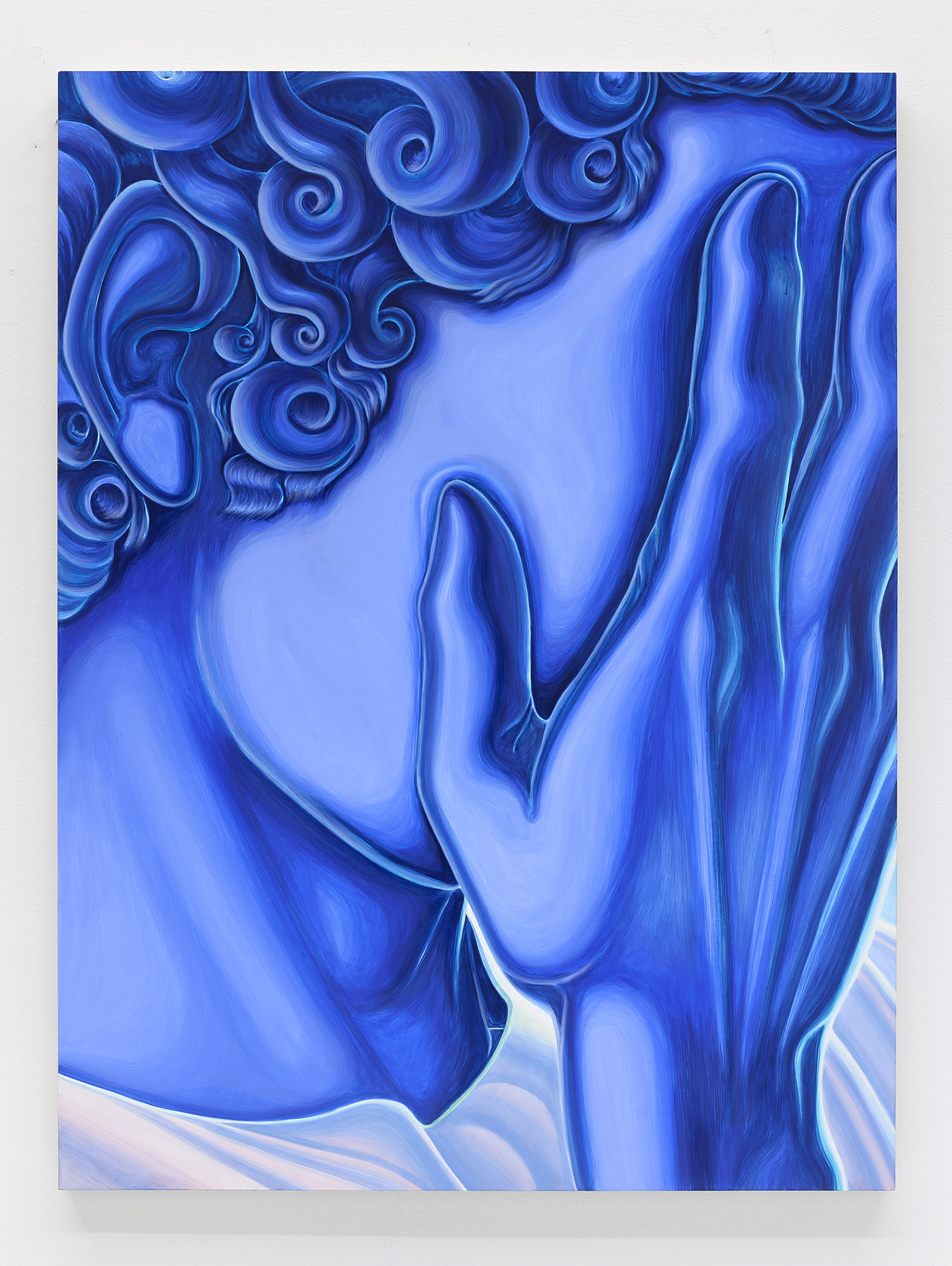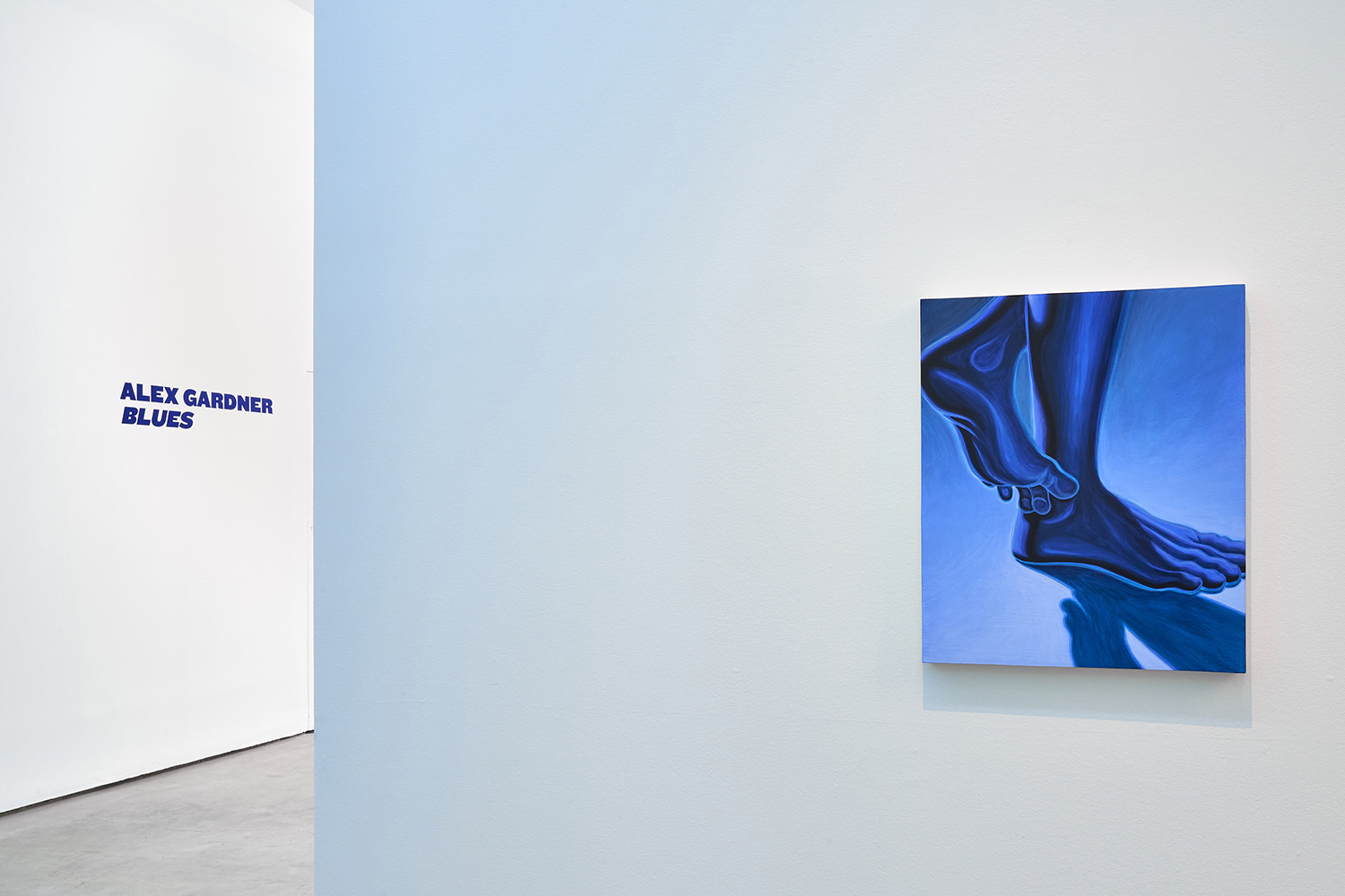The paintings presented in BLUES are acrylic, a departure from the conventional use of oil painting for figurative works. Gardner applied layers and layers of paint onto sanded gesso, saturating the surface of the canvas to produce a fresco-like texture. The paintings’ near-ceramic quality is especially apparent in the satiny blue of their figures’ smooth forms—a tactile effect that comes from mixing a myriad of shades with calculating precision. Equally, certain fields of the paintings are left shambolic: the paint is applied in thin washes, dripping visibly, the record of their technique left out on view.