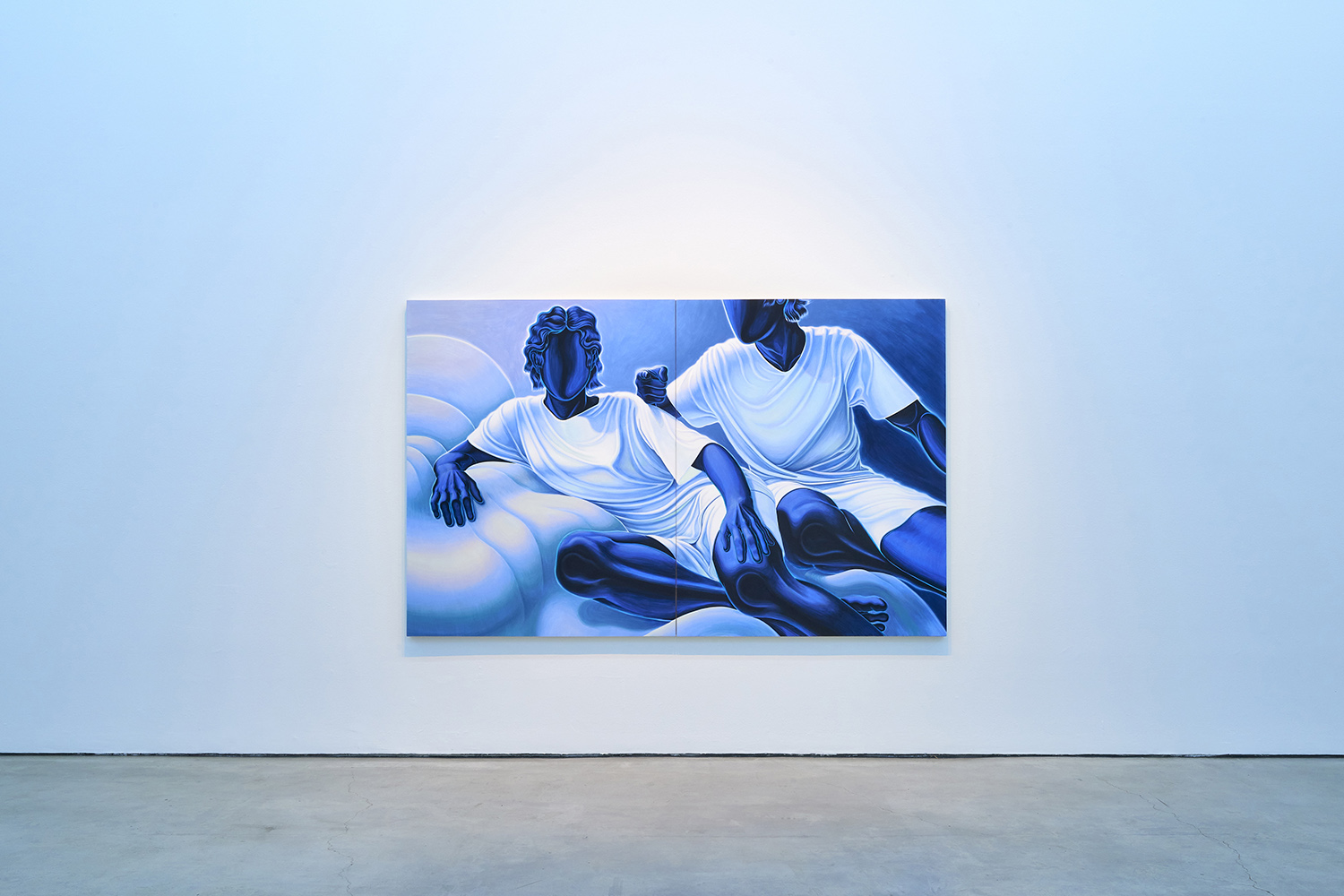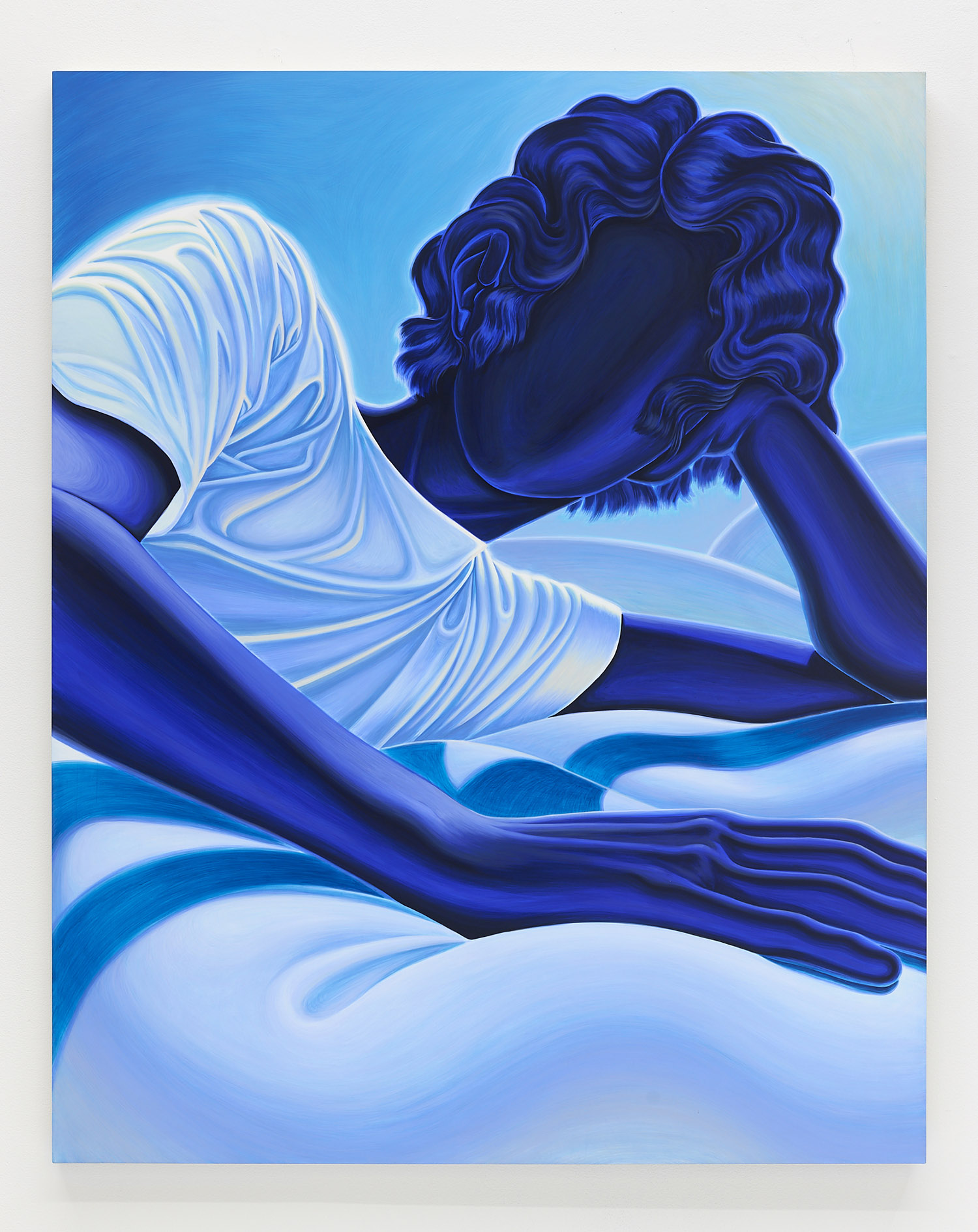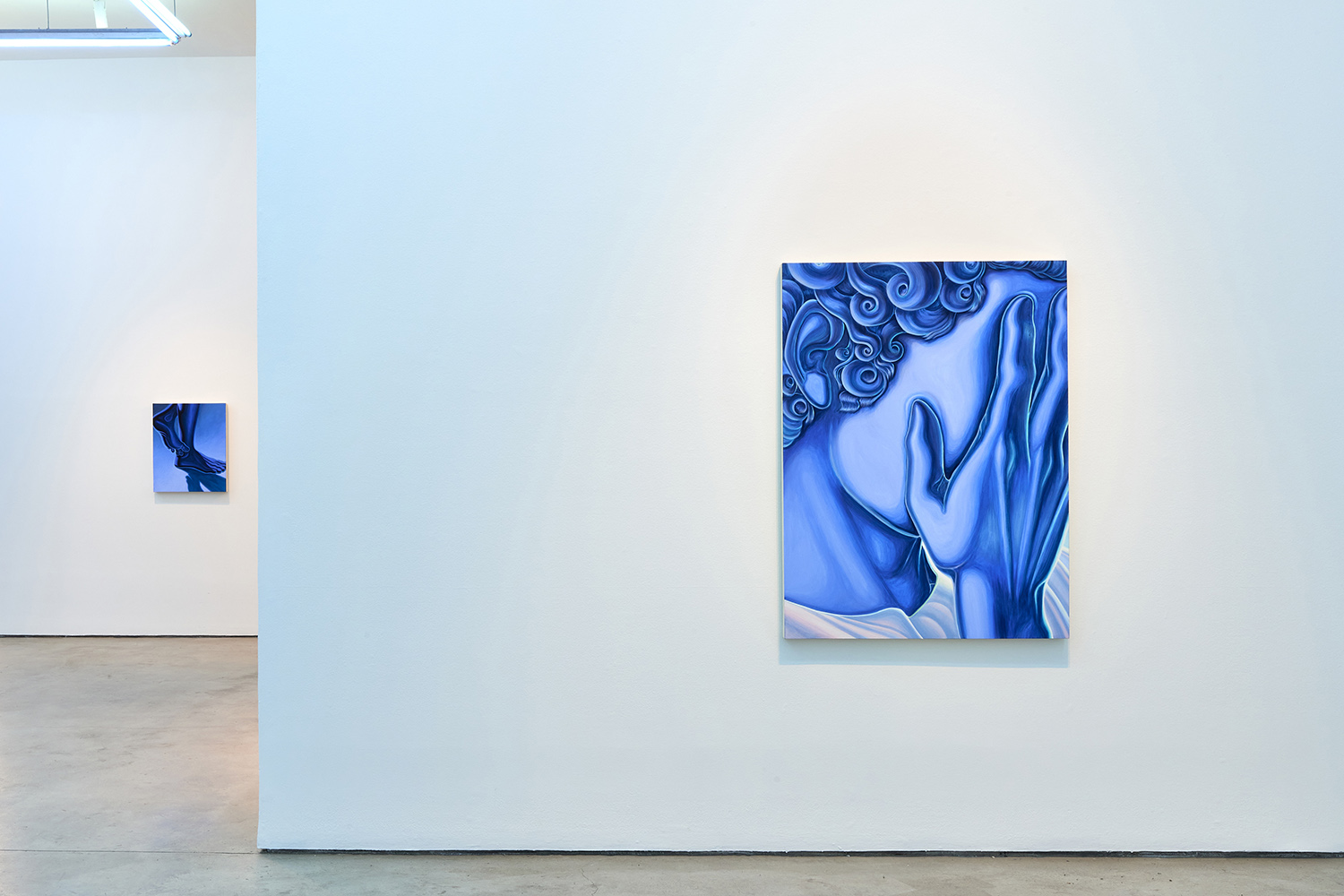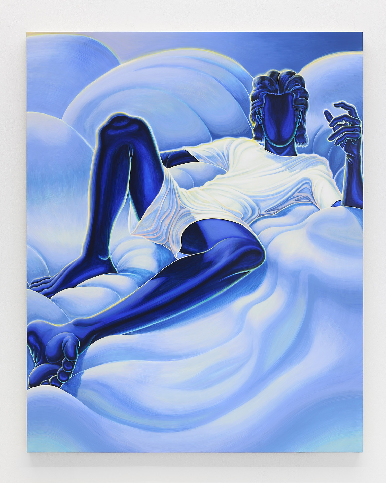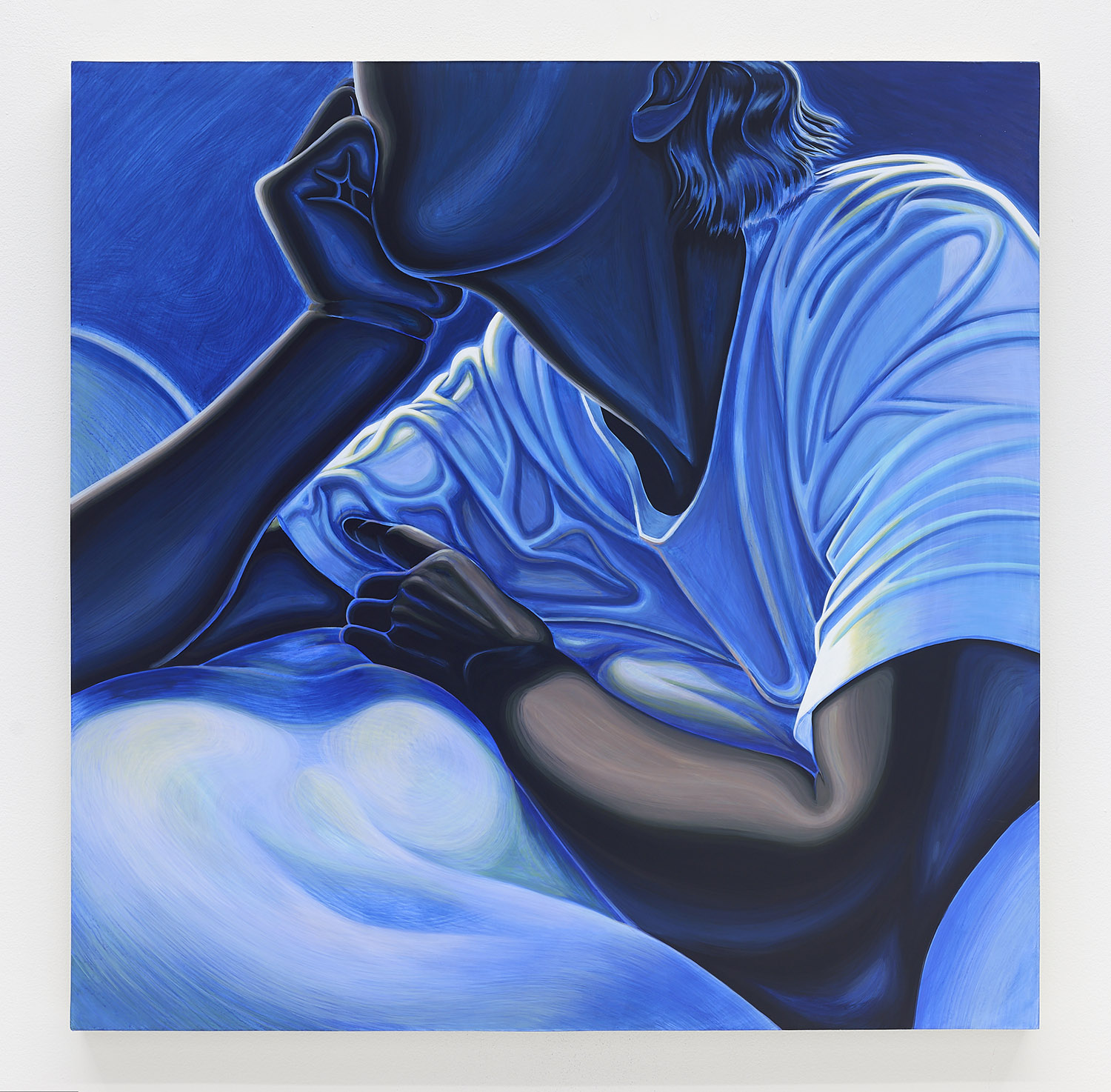 The paintings presented in BLUES are acrylic, a departure from the conventional use of oil painting for figurative works. Gardner applied layers and layers of paint onto sanded gesso, saturating the surface of the canvas to produce a fresco-like texture. The paintings’ near-ceramic quality is especially apparent in the satiny blue of their figures’ smooth forms—a tactile effect that comes from mixing a myriad of shades with calculating precision. Equally, certain fields of the paintings are left shambolic: the paint is applied in thin washes, dripping visibly, the record of their technique left out on view.