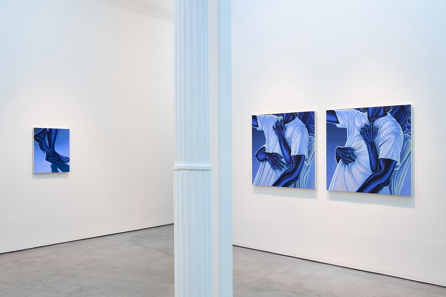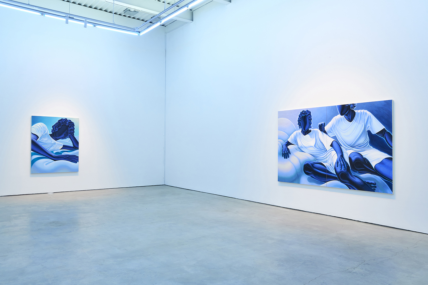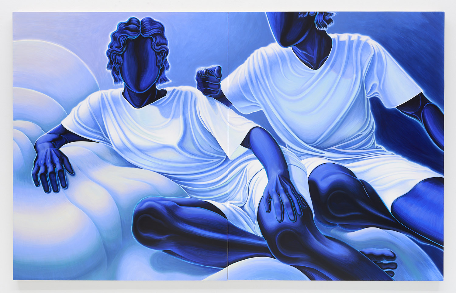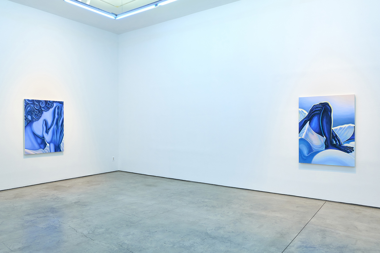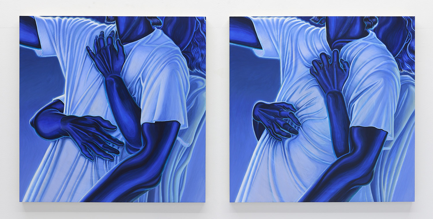 The paintings presented in BLUES are acrylic, a departure from the conventional use of oil painting for figurative works. Gardner applied layers and layers of paint onto sanded gesso, saturating the surface of the canvas to produce a fresco-like texture. The paintings’ near-ceramic quality is especially apparent in the satiny blue of their figures’ smooth forms—a tactile effect that comes from mixing a myriad of shades with calculating precision. Equally, certain fields of the paintings are left shambolic: the paint is applied in thin washes, dripping visibly, the record of their technique left out on view.