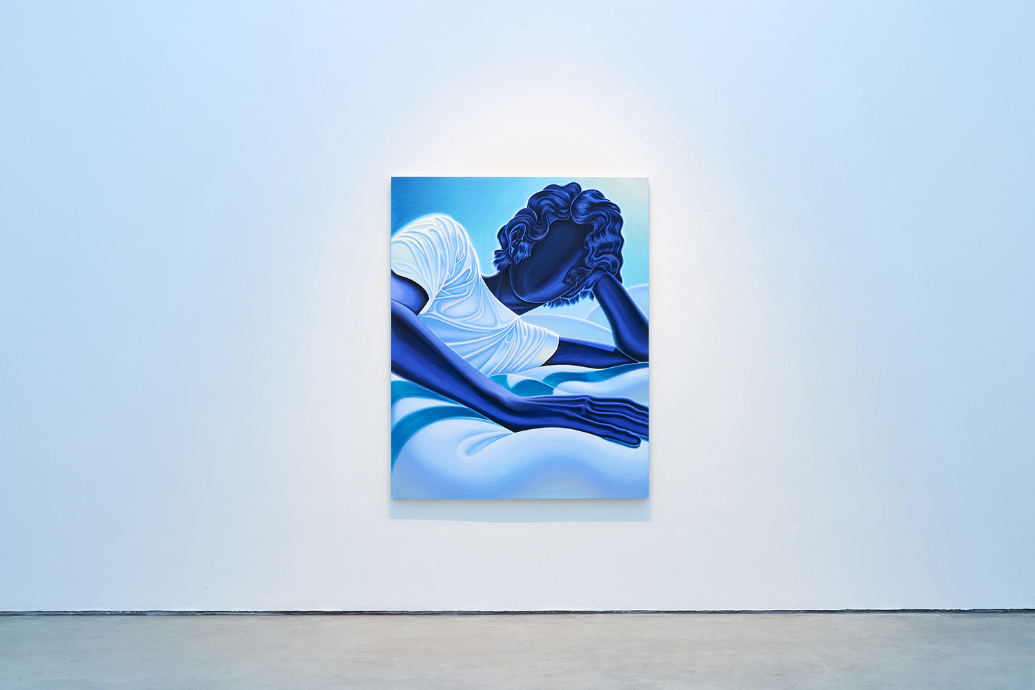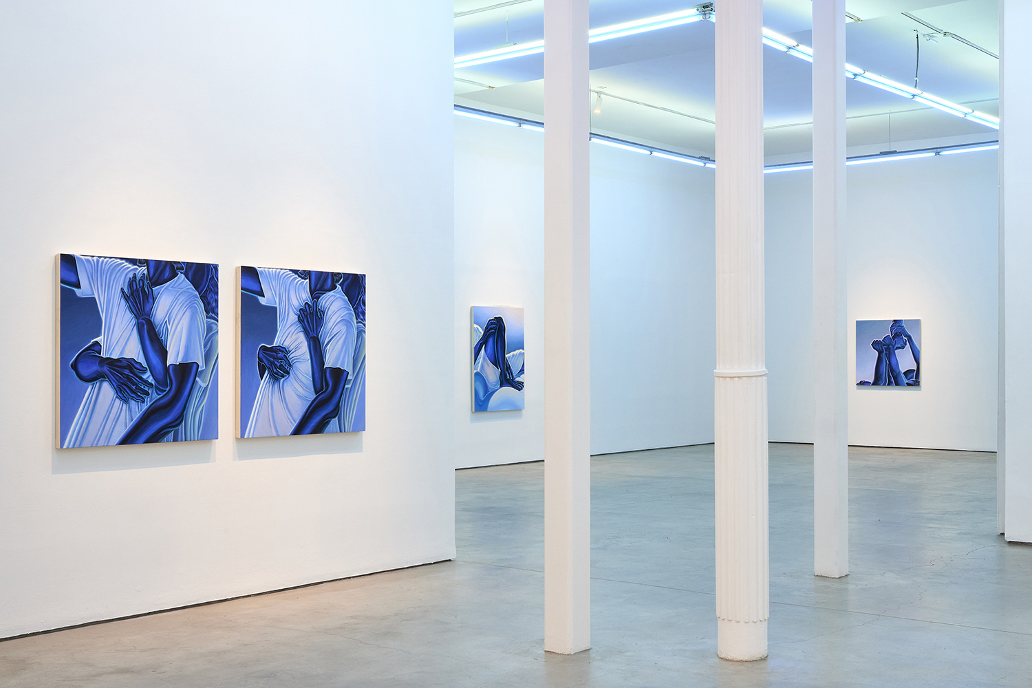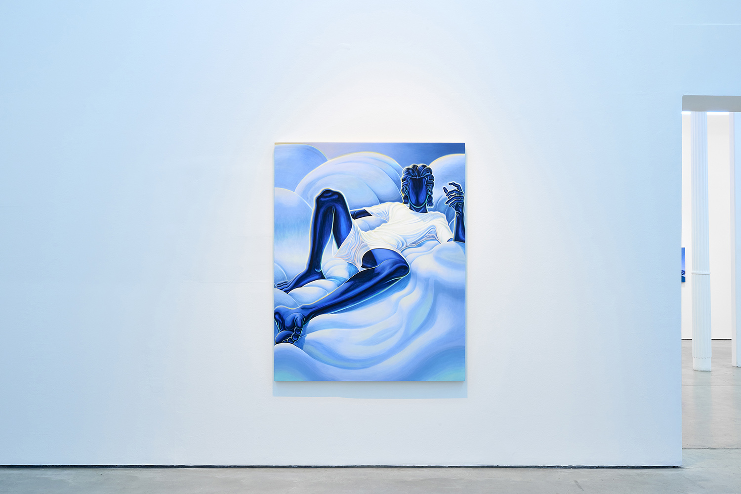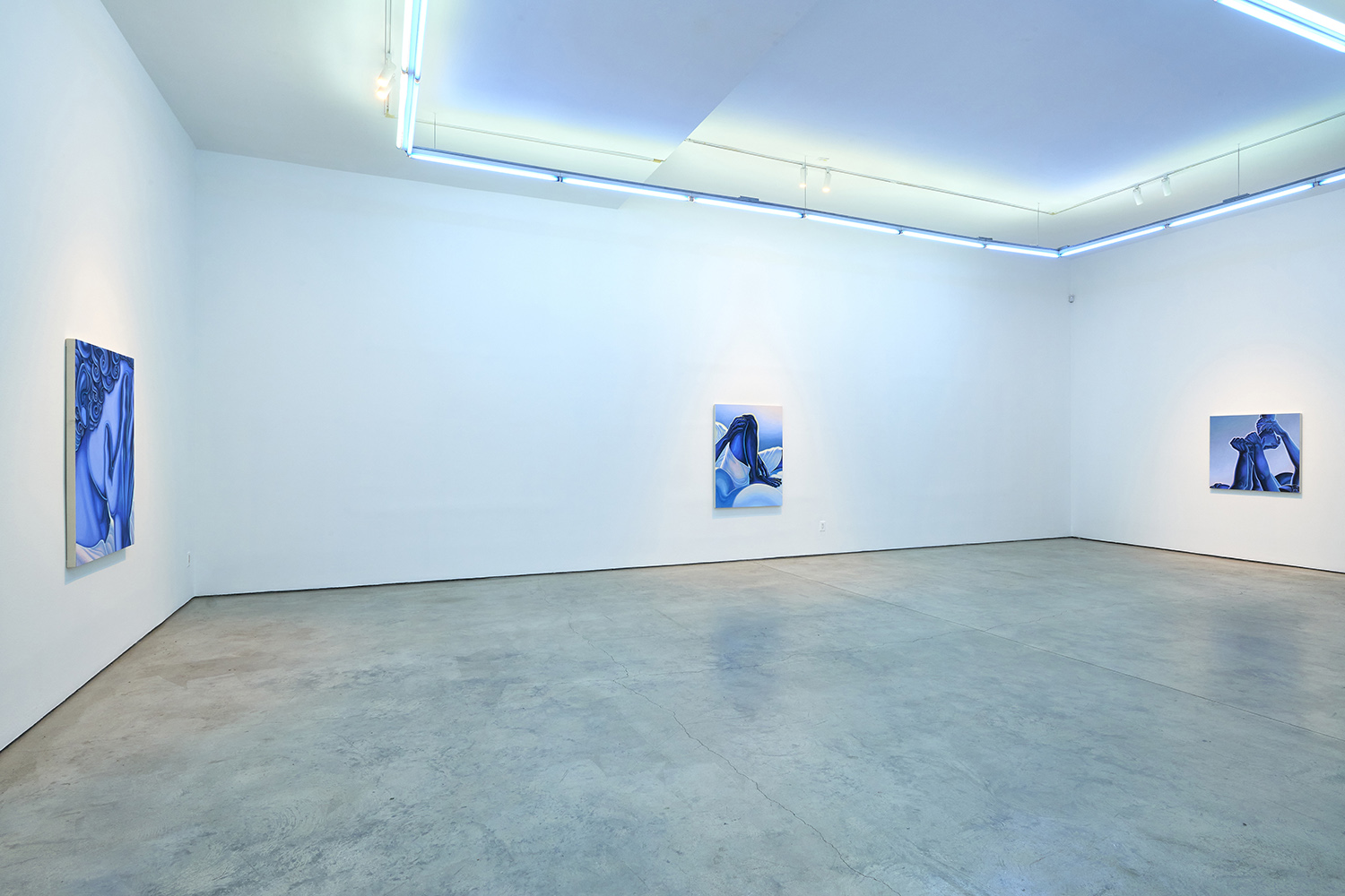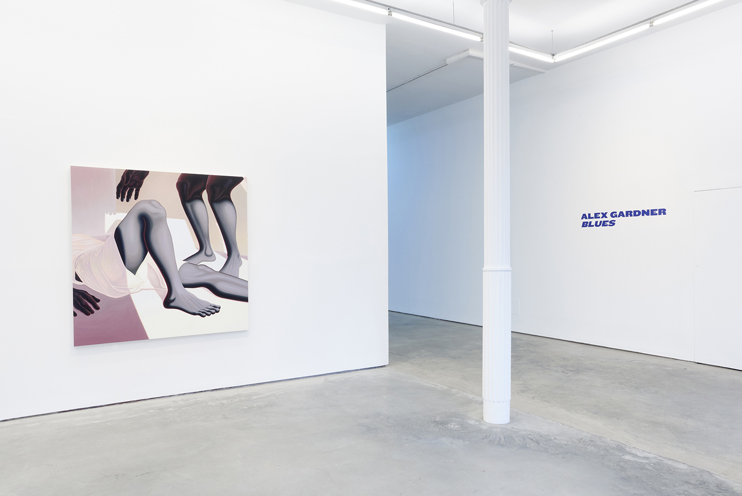 The paintings presented in BLUES are acrylic, a departure from the conventional use of oil painting for figurative works. Gardner applied layers and layers of paint onto sanded gesso, saturating the surface of the canvas to produce a fresco-like texture. The paintings’ near-ceramic quality is especially apparent in the satiny blue of their figures’ smooth forms—a tactile effect that comes from mixing a myriad of shades with calculating precision. Equally, certain fields of the paintings are left shambolic: the paint is applied in thin washes, dripping visibly, the record of their technique left out on view.