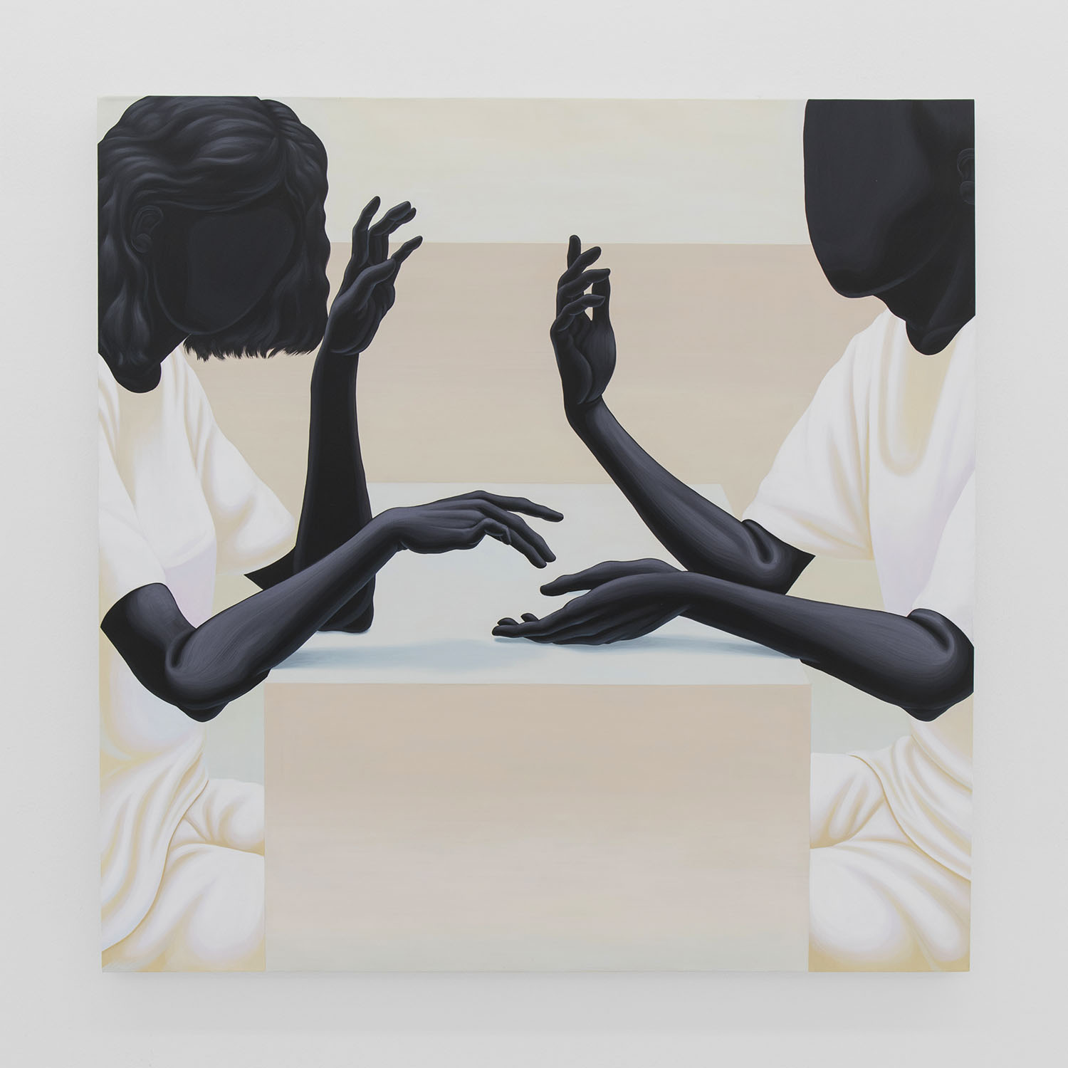 Welcome to Alex Gardner’s 1st solo show in New York, “RomCom”, featuring fourteen new acrylic on linen paintings by the Long Beach-based artist. His entangled ink-black bodies are draped with dramatically folding white cotton separates and posed in pastel environments where the reflections of color produce subtle gradients and thoughtful tonal shifts.