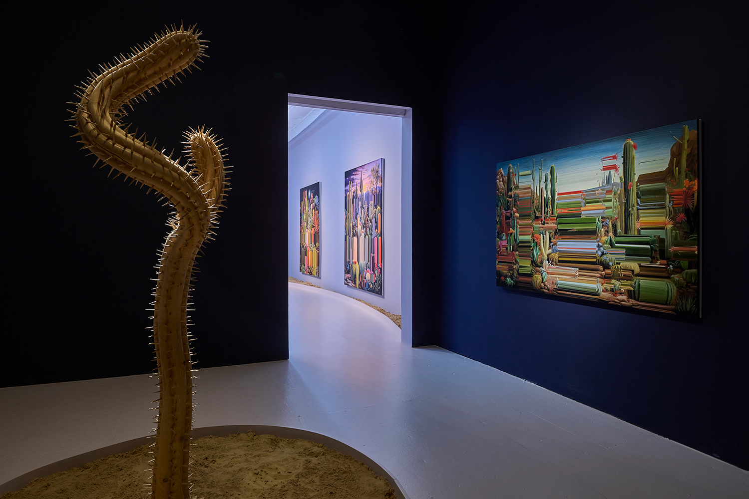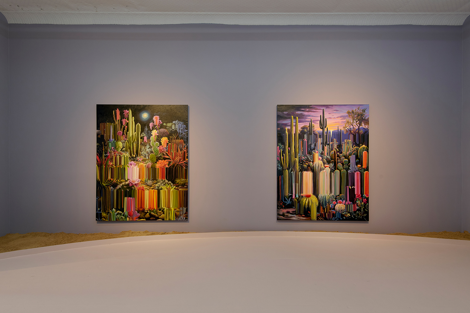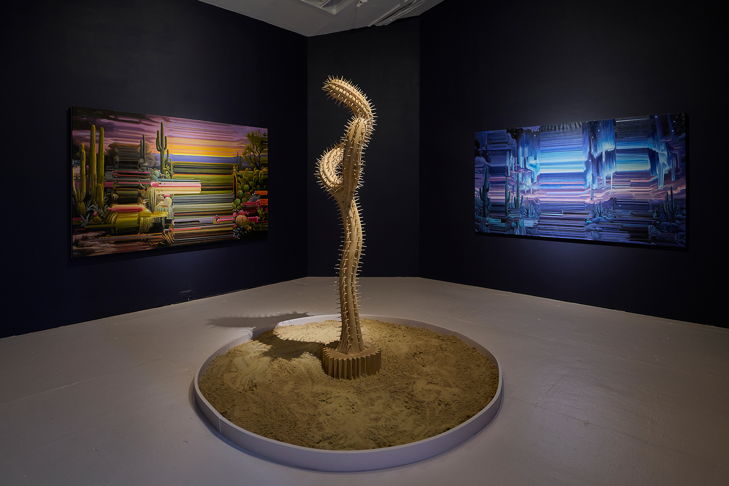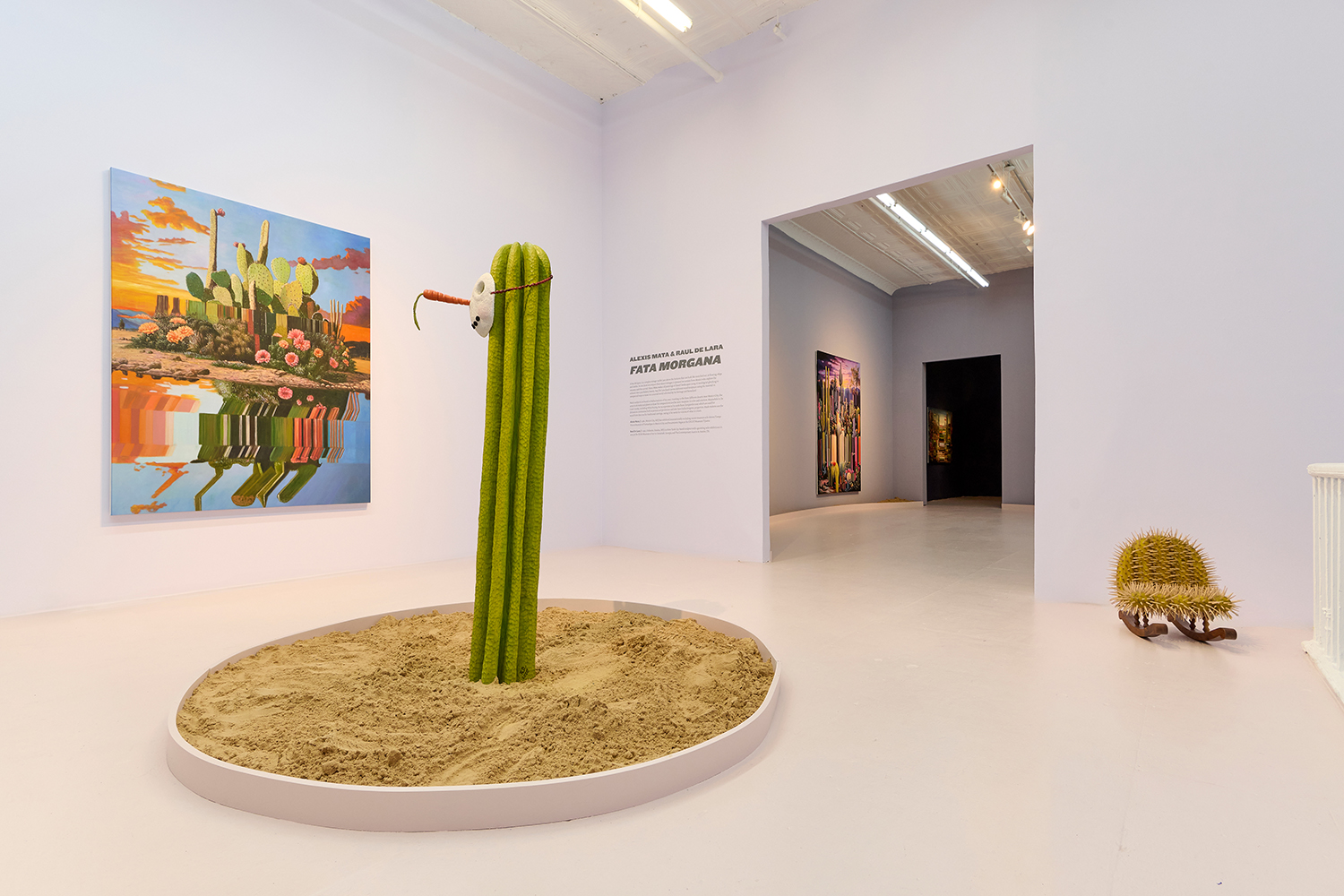 For this exhibition we juxtapose seven new oil paintings by Mexico City-based artist Alexis Mata with seven sculptures by New York-based Mexican artist Raul De Lara. The works are hung on increasingly dark walls as the sun sets and the sculptures are nestled in sand pits: as the show provokes your imagination, a mirage of the desert might appear.