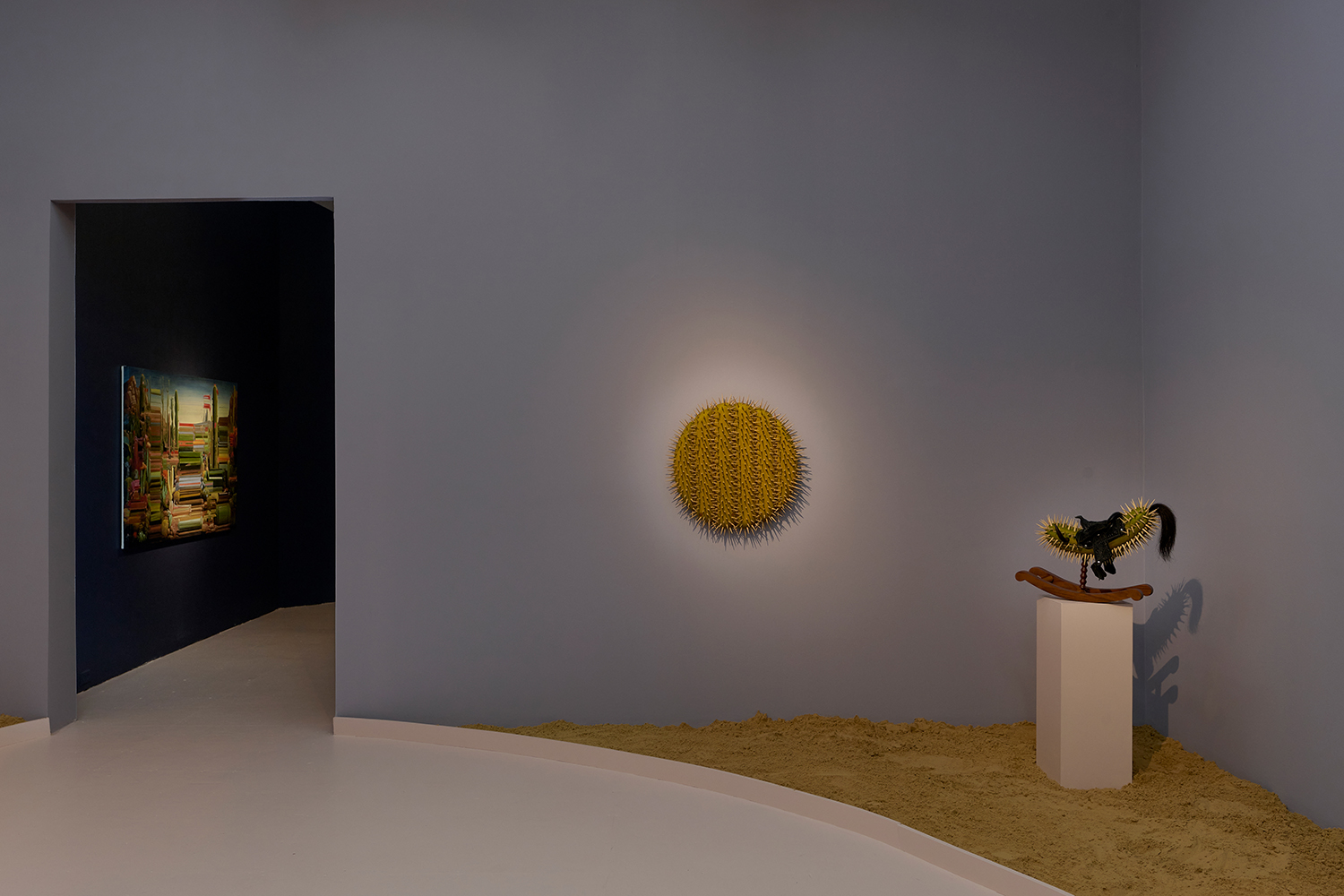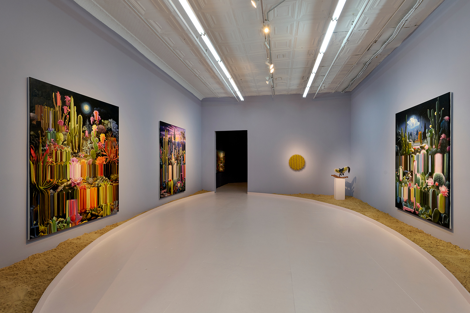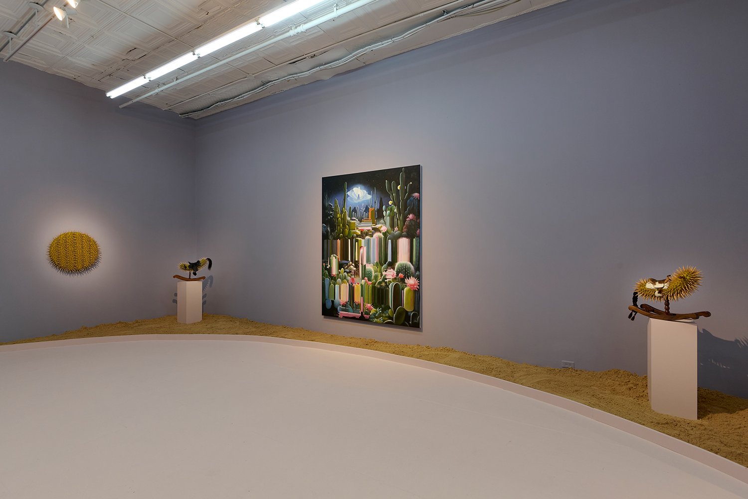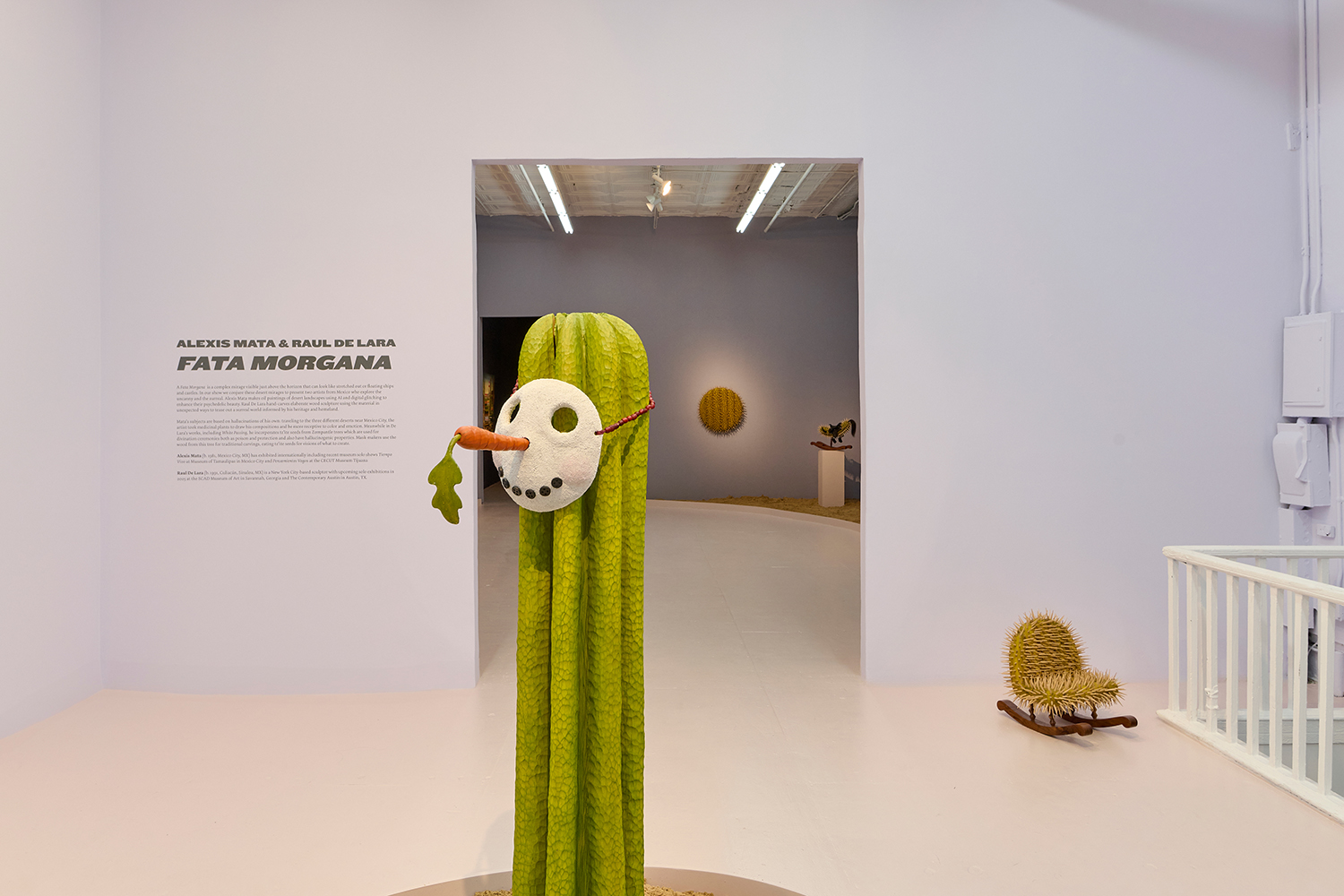 For this exhibition we juxtapose seven new oil paintings by Mexico City-based artist Alexis Mata with seven sculptures by New York-based Mexican artist Raul De Lara. The works are hung on increasingly dark walls as the sun sets and the sculptures are nestled in sand pits: as the show provokes your imagination, a mirage of the desert might appear.