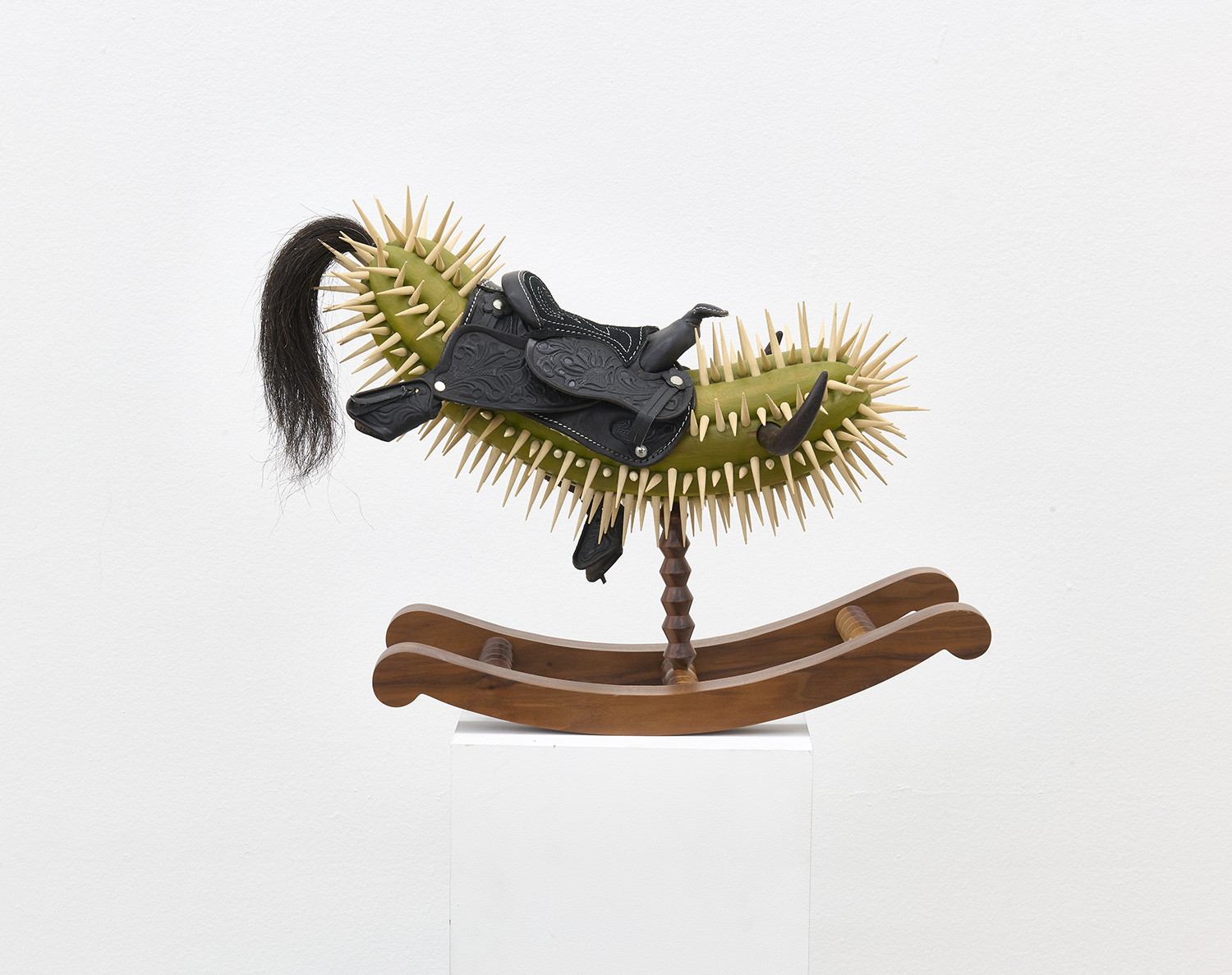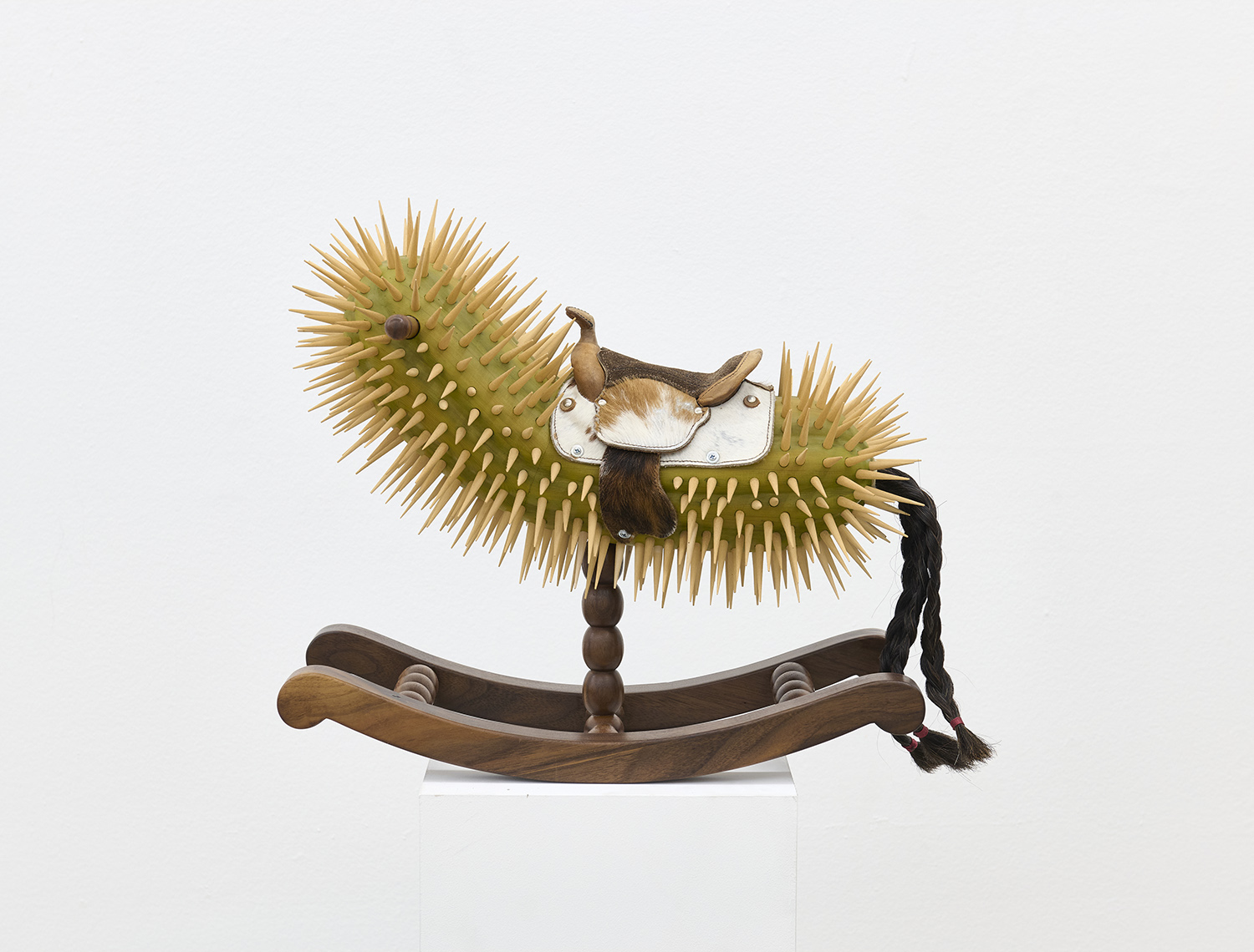 Raul De Lara, Torito, 2021, Cedar, walnut, wenge, pine, leather, horse hair, lacquer, acrylic, 17 x 24 x 10 inches, 43 x 61 x 25.4 cm.