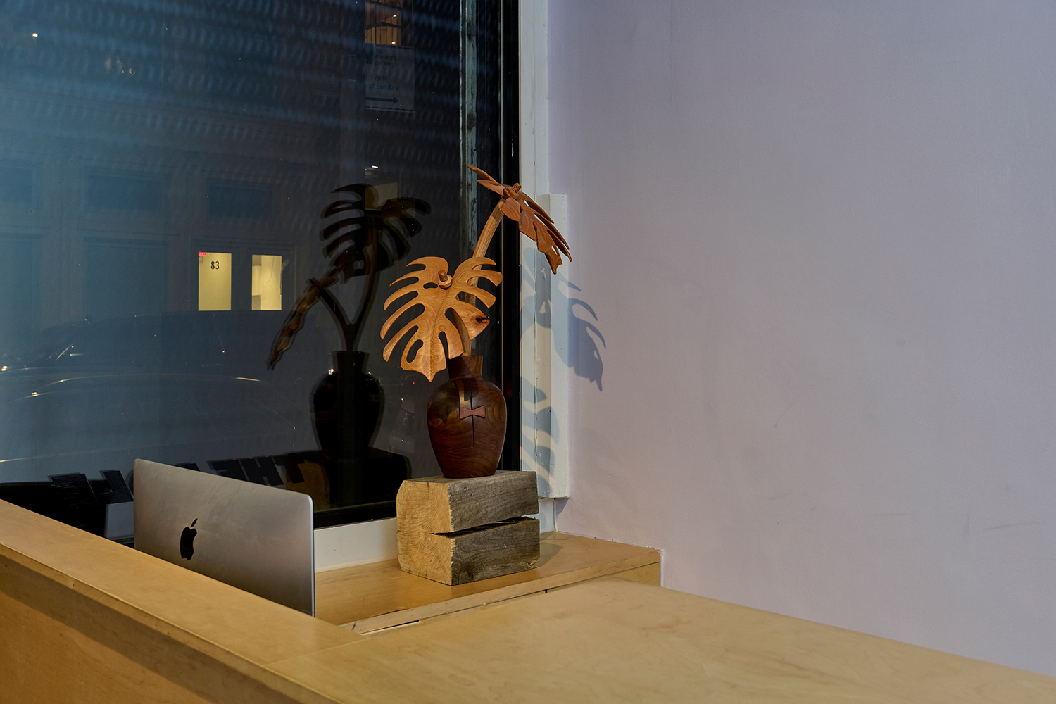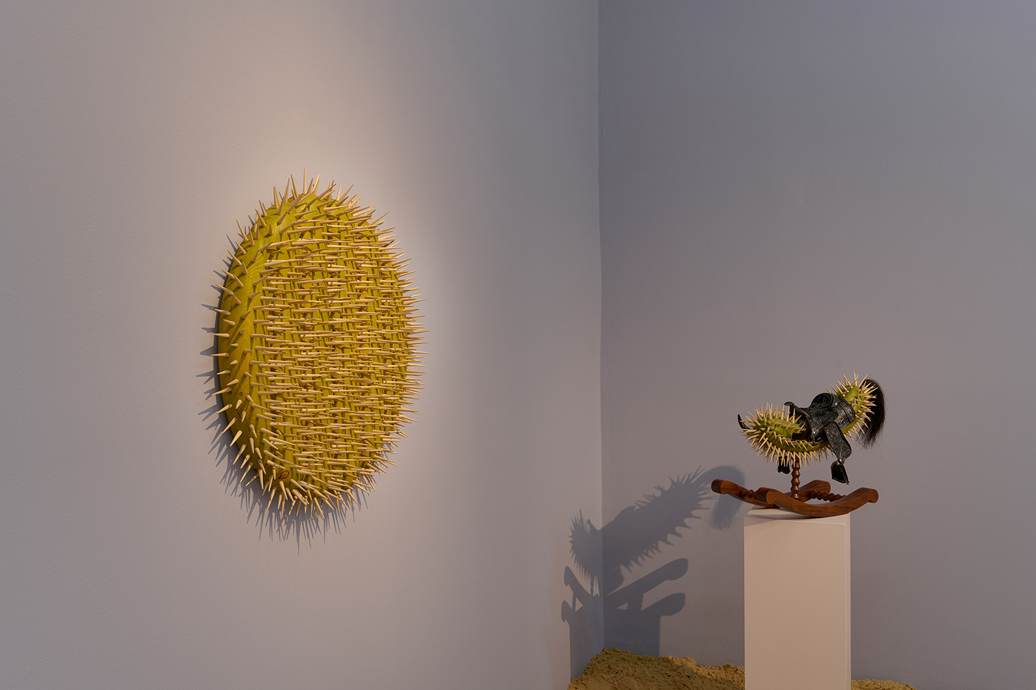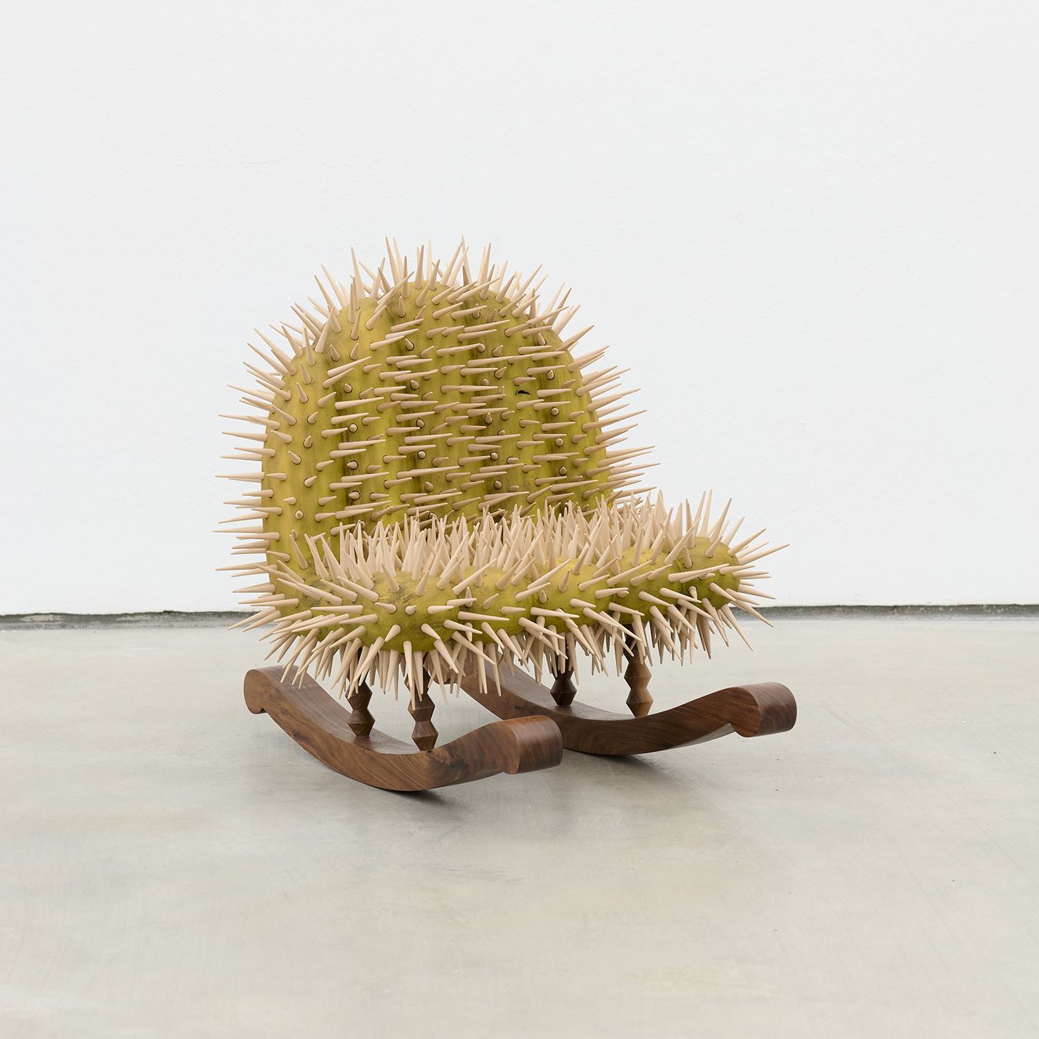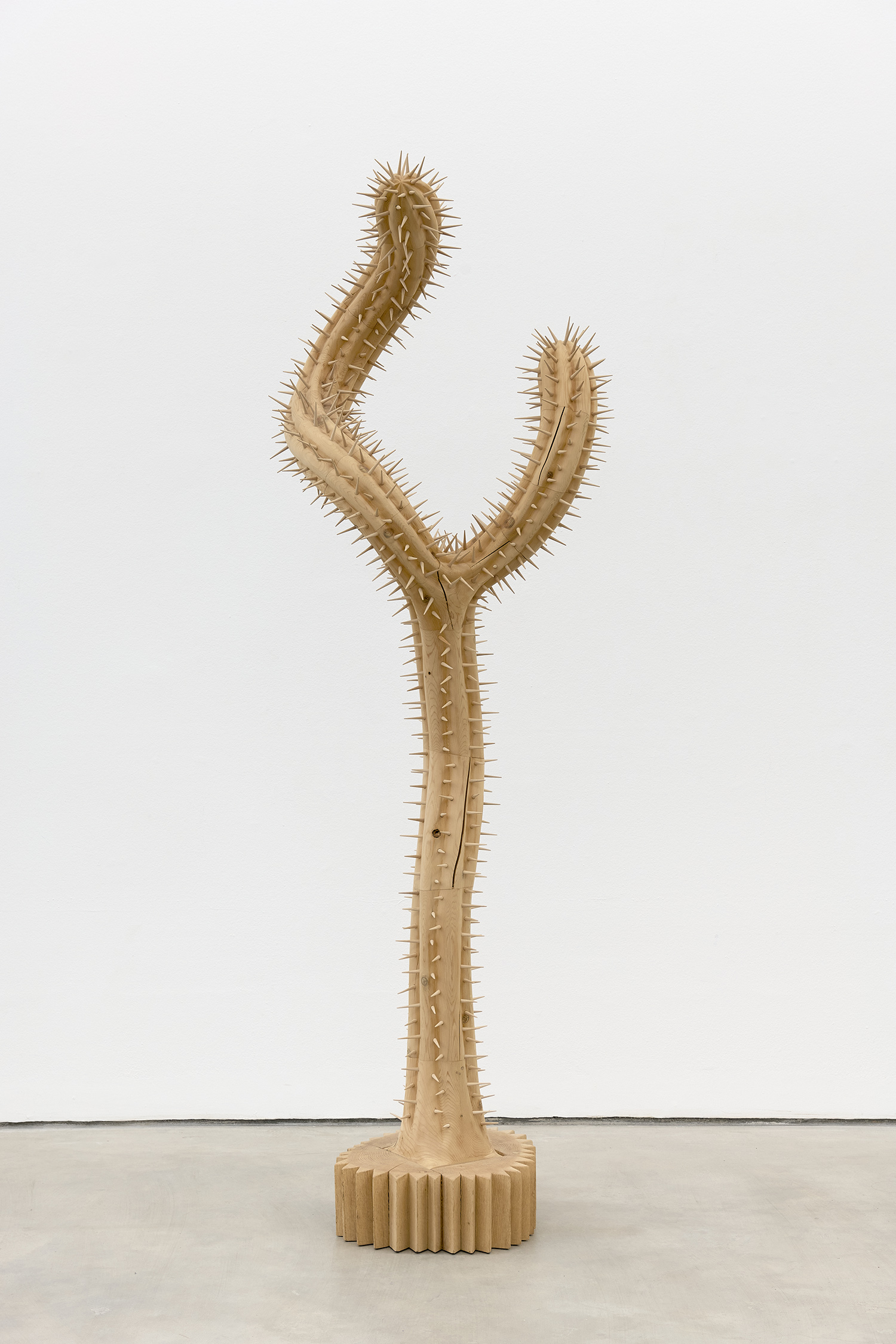 While the exhibition plays tricks with your eyes, De Lara’s technical prowess is palpable, utilizing a myriad of highly labor intensive traditional wood carving techniques to cut, carve and sand each detail manually. The artist’s hand and knowledge are evident, unlike the output of CNC we tend to see; in Saguaro #2 eleven hundred tantalizing hand-carved spikes make a splinter appealing. De Lara was in a woodshop by the age of 10 and has worked with woodworkers and taught in shops throughout his career. Only recently he has begun using tools to digitally draw his sculptures in space, sketches that allow him to visualise the work in advance before gravity gets involved.