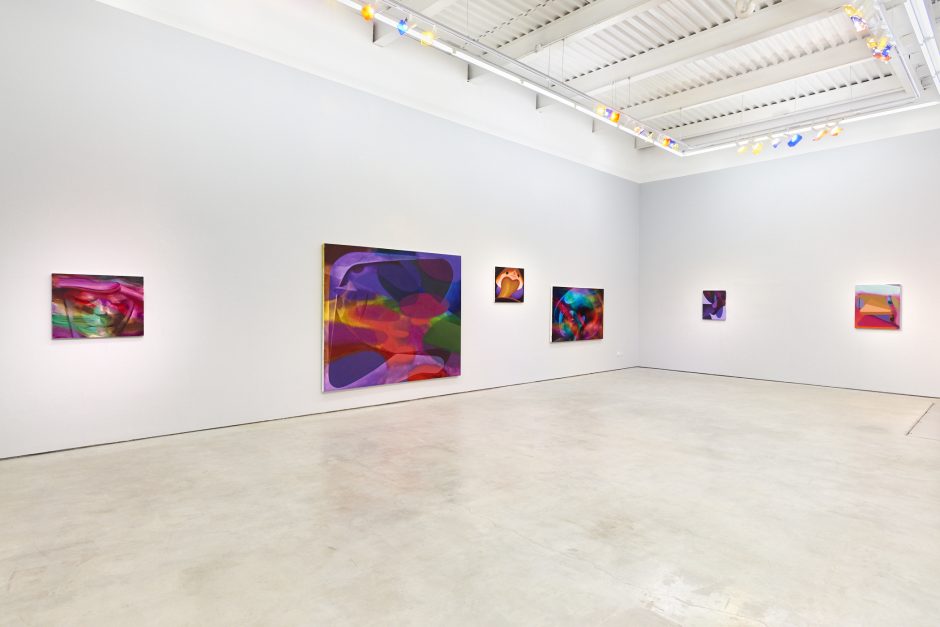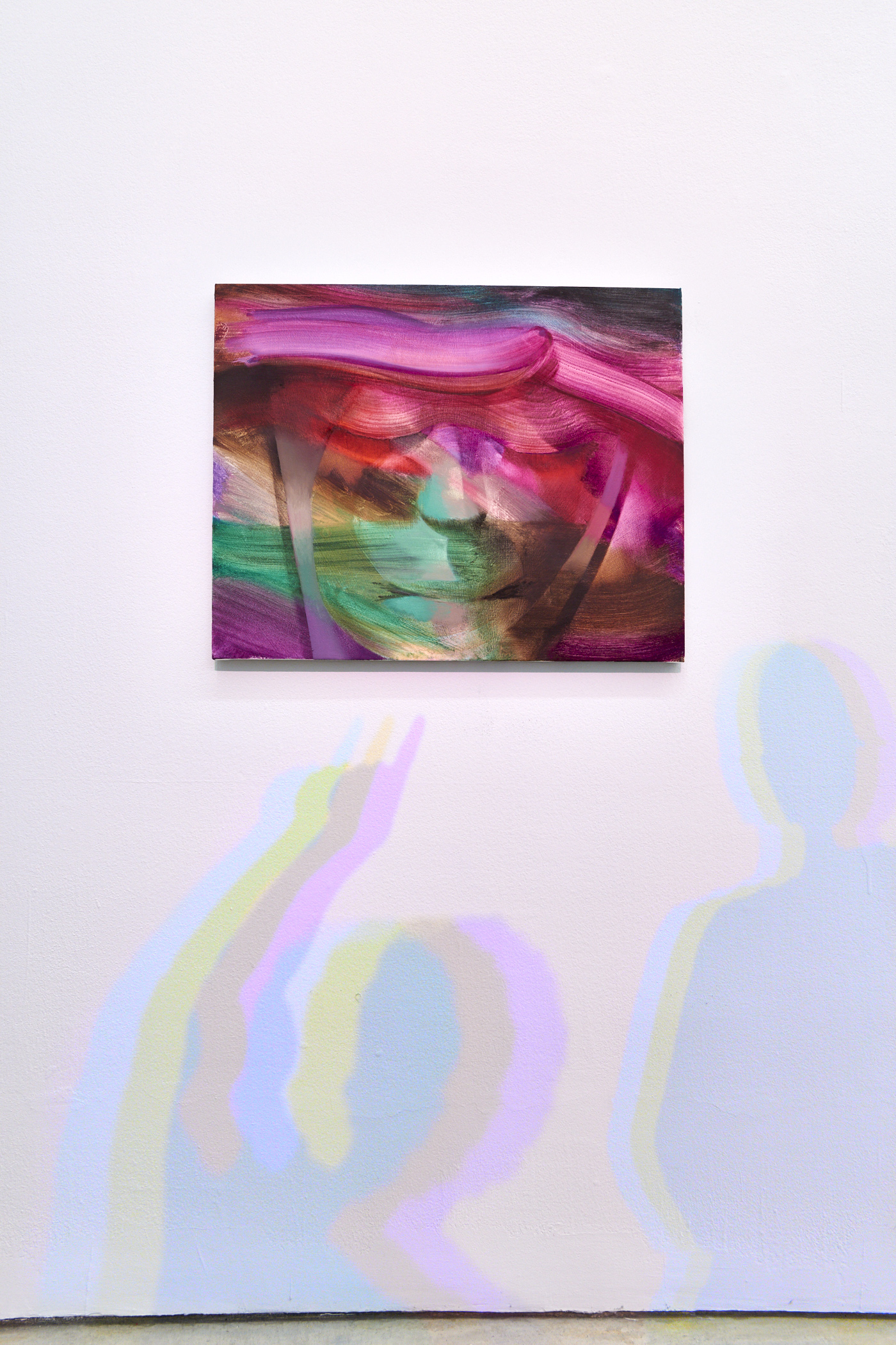 Like the above painting, and like another mainly-white work in the show, the artist also includes color separation paintings where the white is split into the spectrum. Like these paintings, the exhibition design highlights subtractive color mixing, where a floating shadow of pink and one of green hover on the wall behind some of the works. The screenic overlays of the mesh curtain colors further overlay your sight lines as you walk around the exhibition.