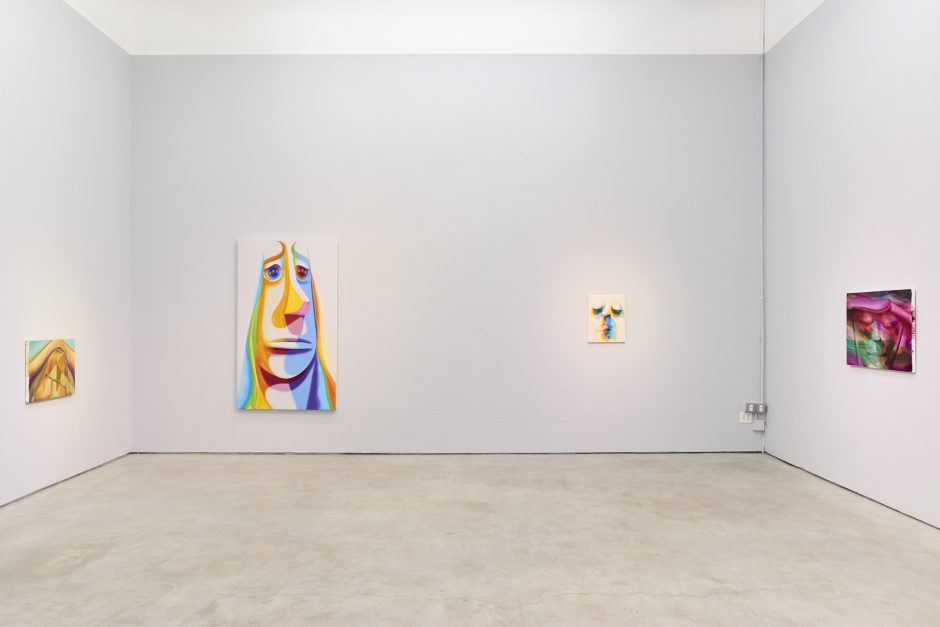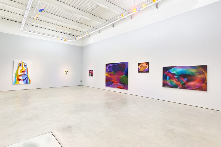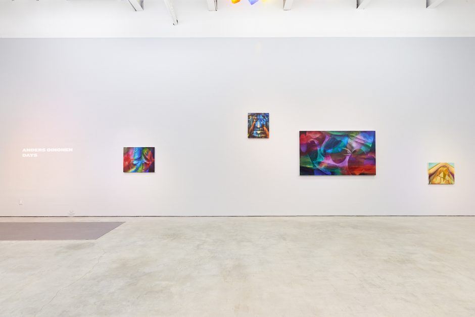 This exhibition includes works in his signature style of abstracted faces, sometimes reclining into a landscape, sometimes curling up like a cat or rippling away like water. Shadows and shapes, linework and paint washes are selectively deployed to pull the familiar out of the colorful ether. New for the exhibition are a series of works where paint is more removed than applied: like Francis Bacon is famous for, Anders is toweling off puddles of paint to show where colors have been subtracted as opposed to added. These smoky, misty paintings have a darker palette of greens, reds and purples.