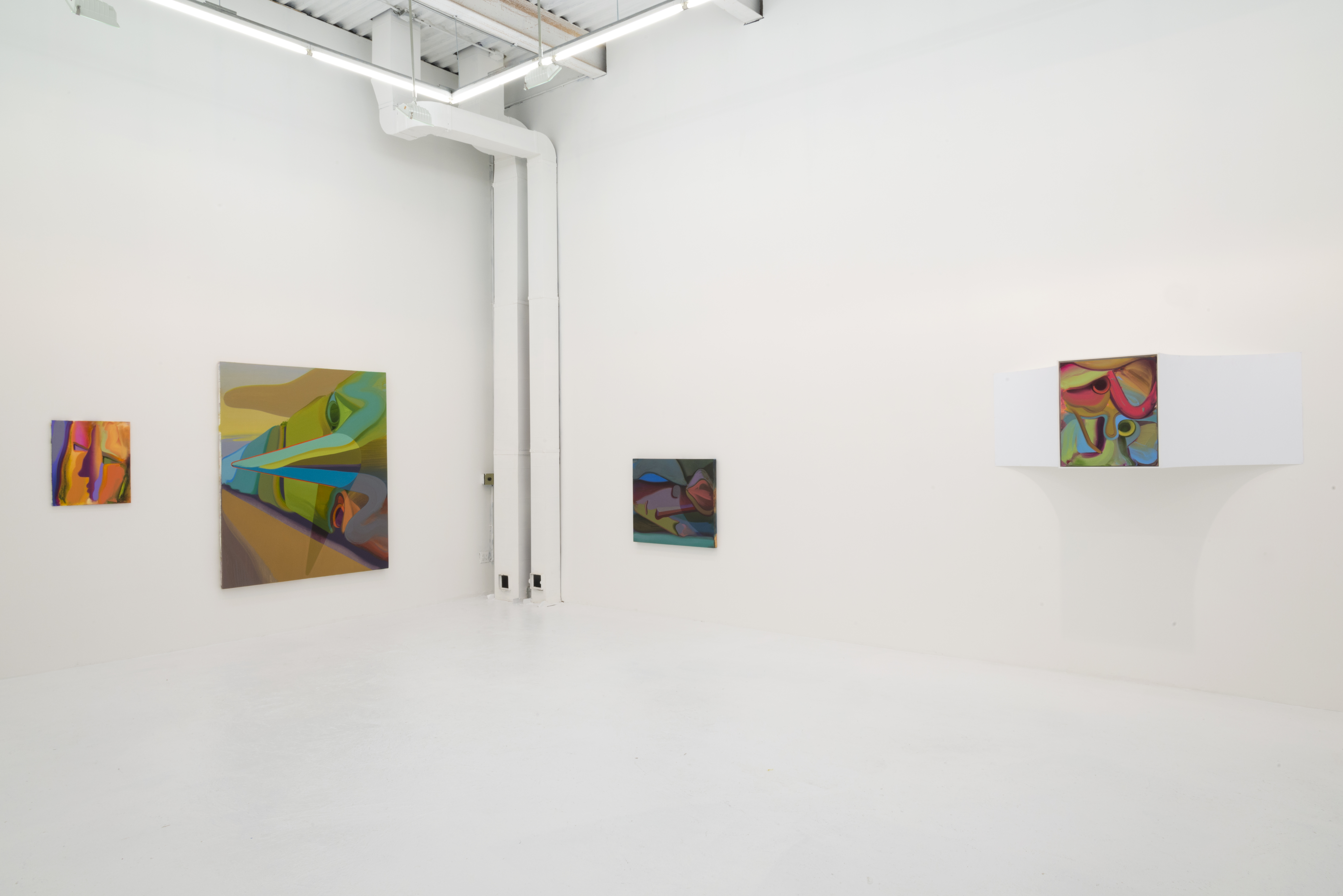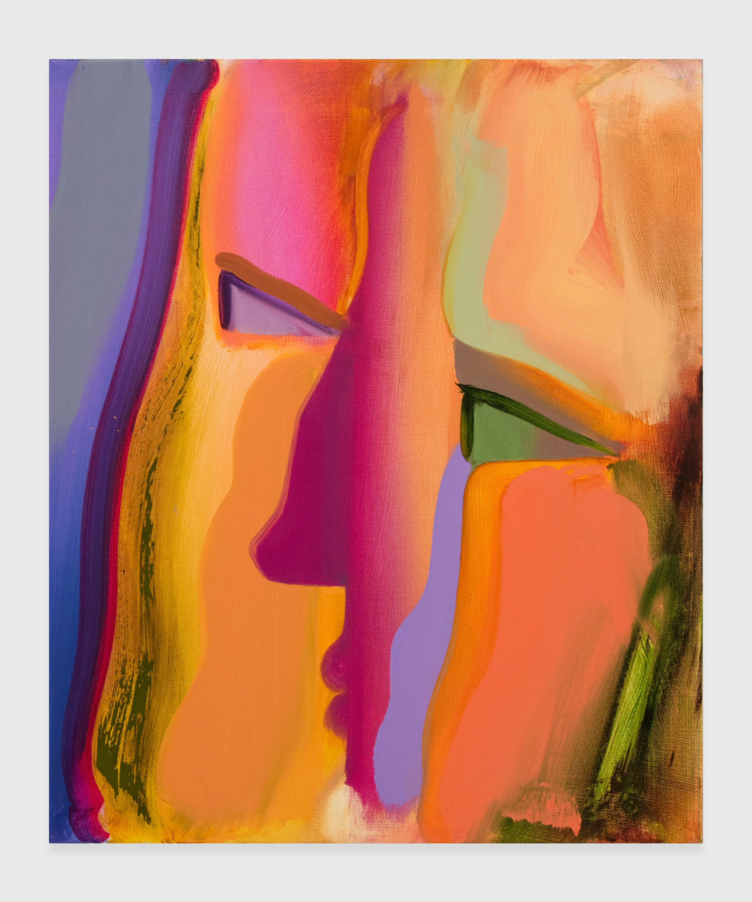 An openness to multiple readings is fundamental to me. These faces are meant to be open to interpretation; as a being, thing, landscape, abstraction, or even just paint. The faces sometimes have a blank or contemplative stare, often outside the picture plane, away from the viewer to allow for a less confrontational examination. The act of looking as the subject is meant to suggest that both painting and viewer, who are immersed in the same activity, are perhaps one and the same. The communicative goal is empathic in that I would like the viewer to feel caught in a loop of looking at a looker. This is meant to raise the awareness of the viewer enabling them to perhaps partake in the same emotion as the depiction, projecting a sentience onto the work. Within this facial framework I am abstracting and composing relationships of colours and shapes to generate illusionistic spaces suggesting further associations.”