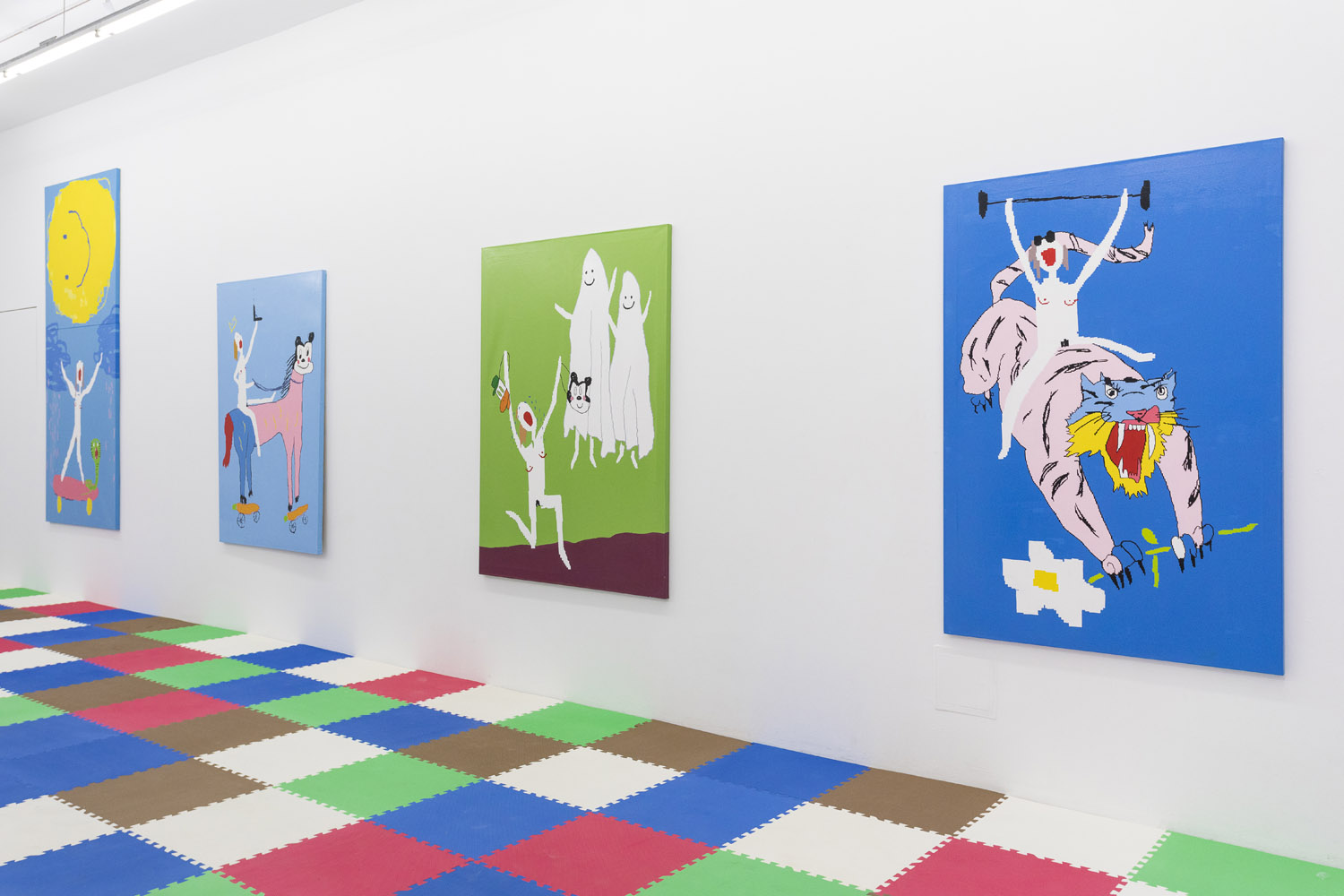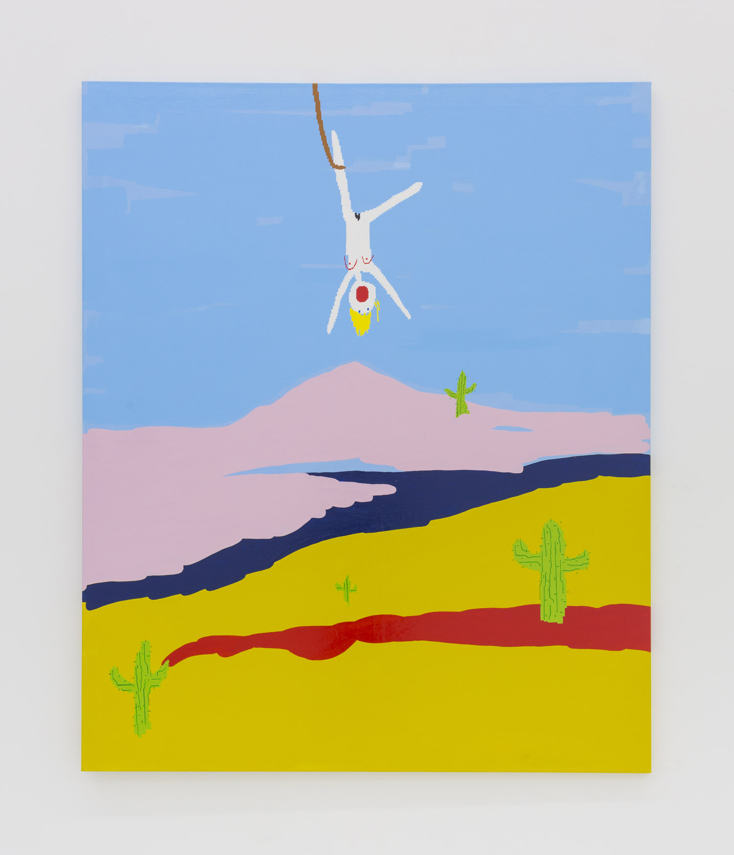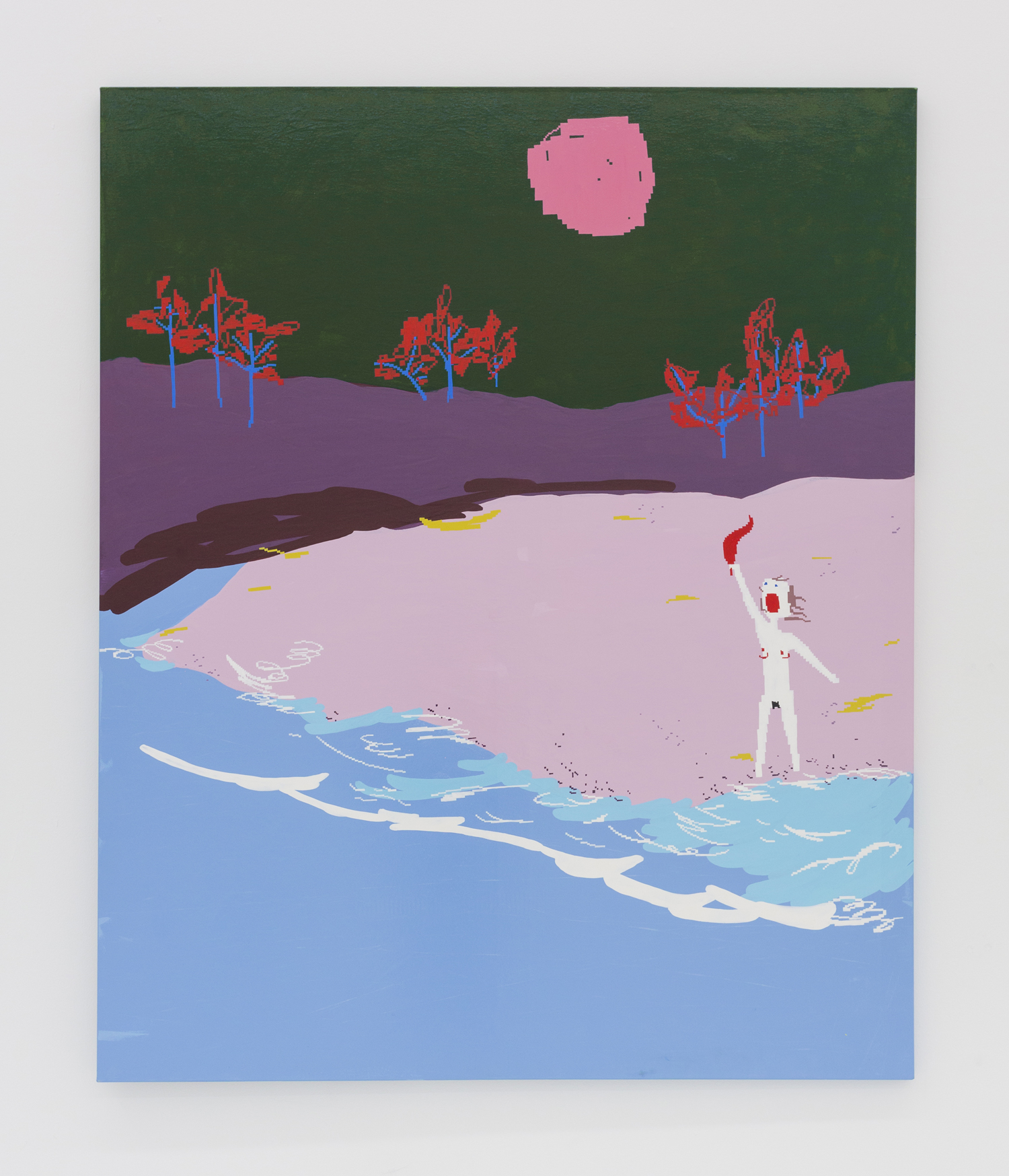 In Maja Djordjevic’s work, the female figures are much more rudimentary, barely a collection of early computer game pixels; a nude form with a little scratch of vagina and dotted on boobs, howling mouths. Like Pettibon’s VAVOOM children these figures seem to be connected to something primal, and loud. Djordjevic paints these rectilinear shapes by hand, sketched out in an early kind of MacPaint program, where squares of color are so large as to prevent too much detail. The anonymous women that populate her paintings are used as symbols of feminine power, pleasure and pain; and while being tiny and barely marked out as a girl, they explode with vitality and even positivity.