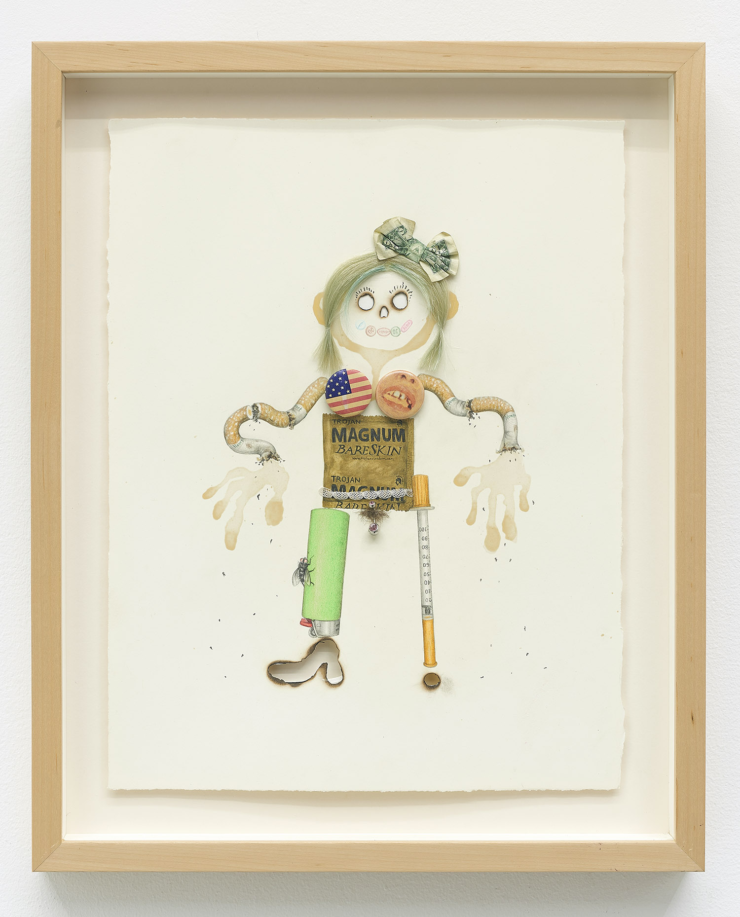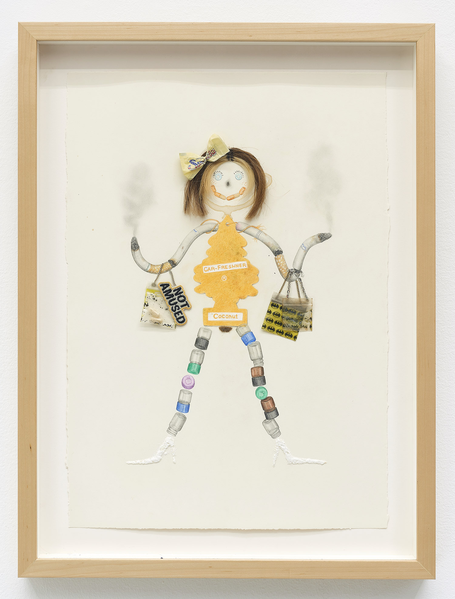 Drug Voodoo (Airfreshner), 2009. Color pencil, pencil, acrylic, beer, baking powder, human hair, plastic baggies, found drugs, Splenda wrapper, metal, archival glue on paper, Framed Dimensions: 23 x 17 inches, 58 x 43 cm