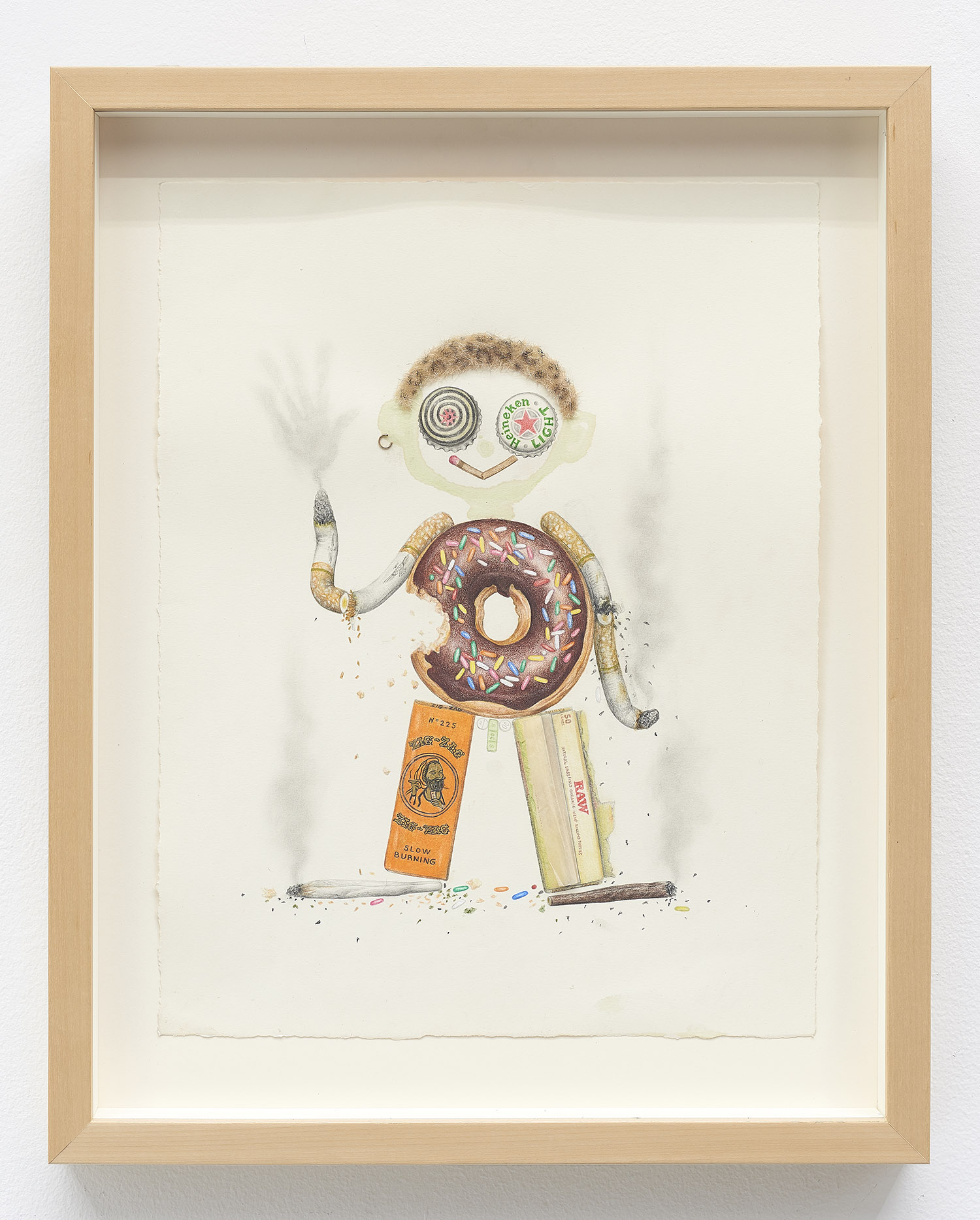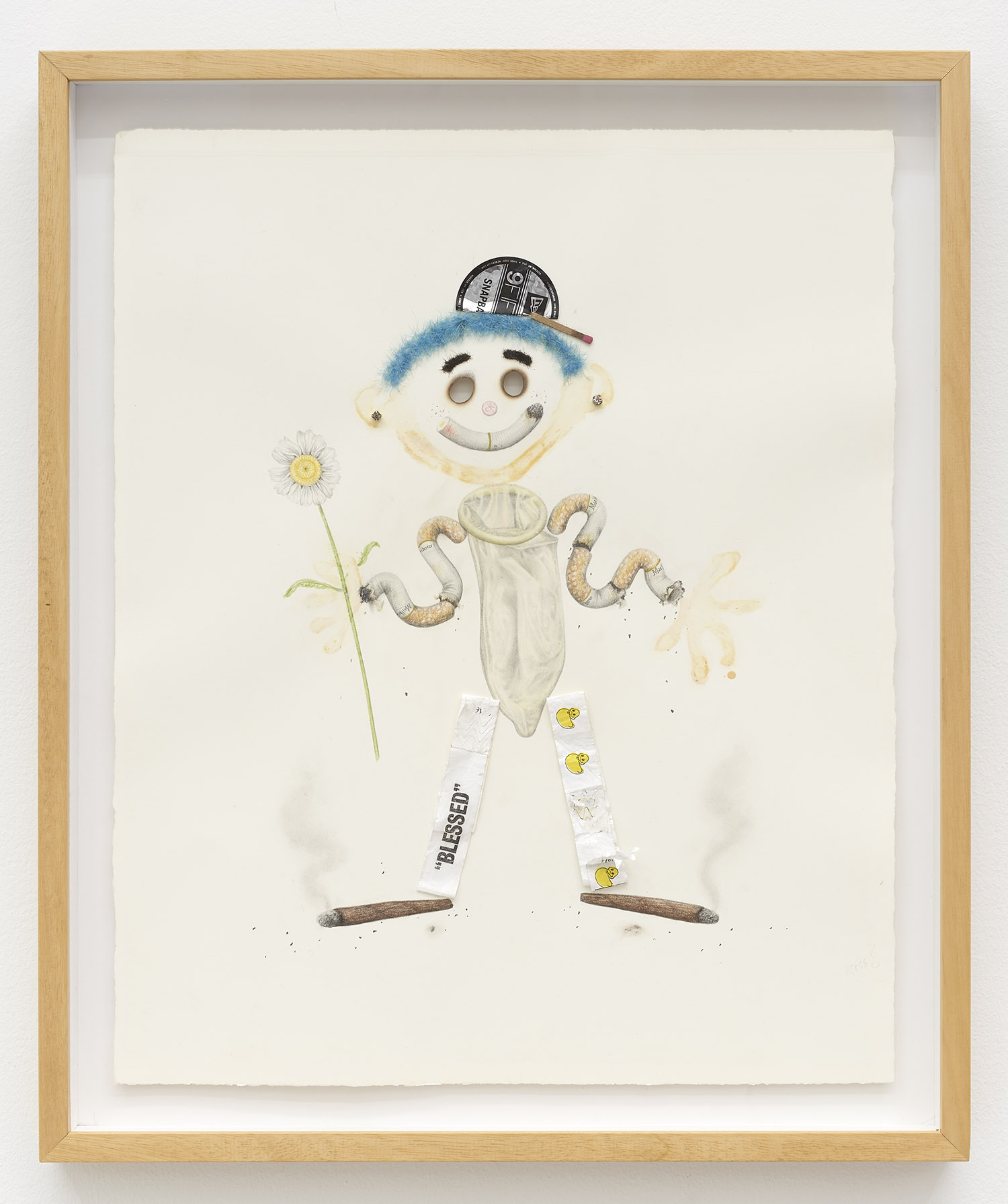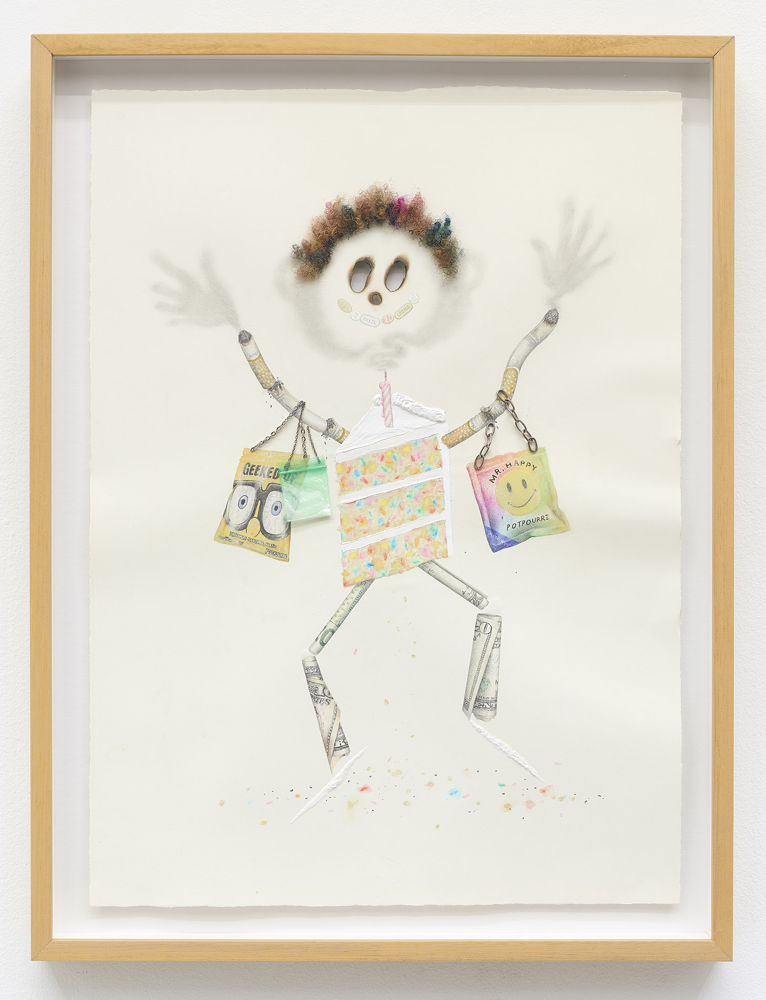 Drug Voodoo (Dohnut Boy), 2019. Color pencil, pencil, acrylic, sharpie, human hair, hemp rolling paper, metal, archival glue on paper, Framed Dimensions: 19 x 15.25 inches, 48 x 38 cm