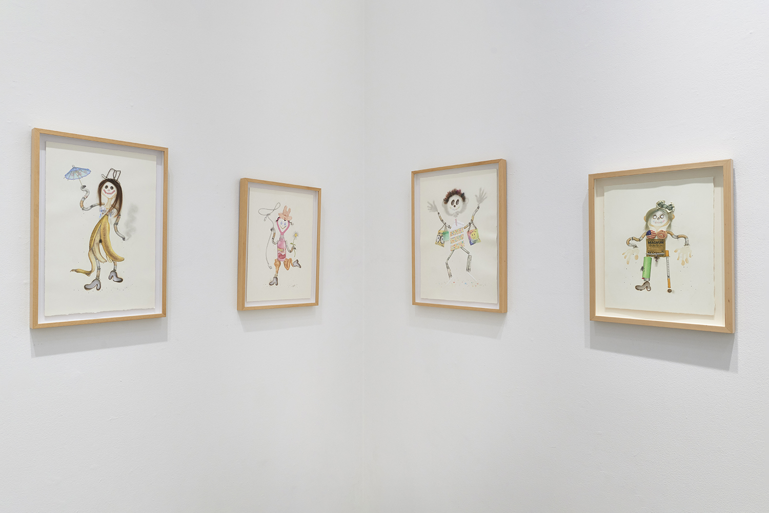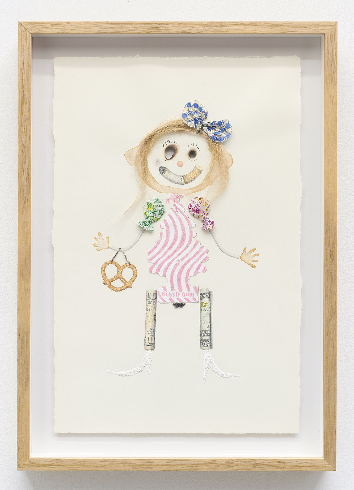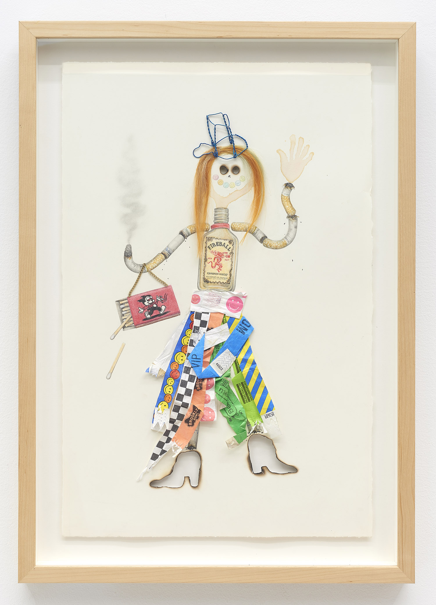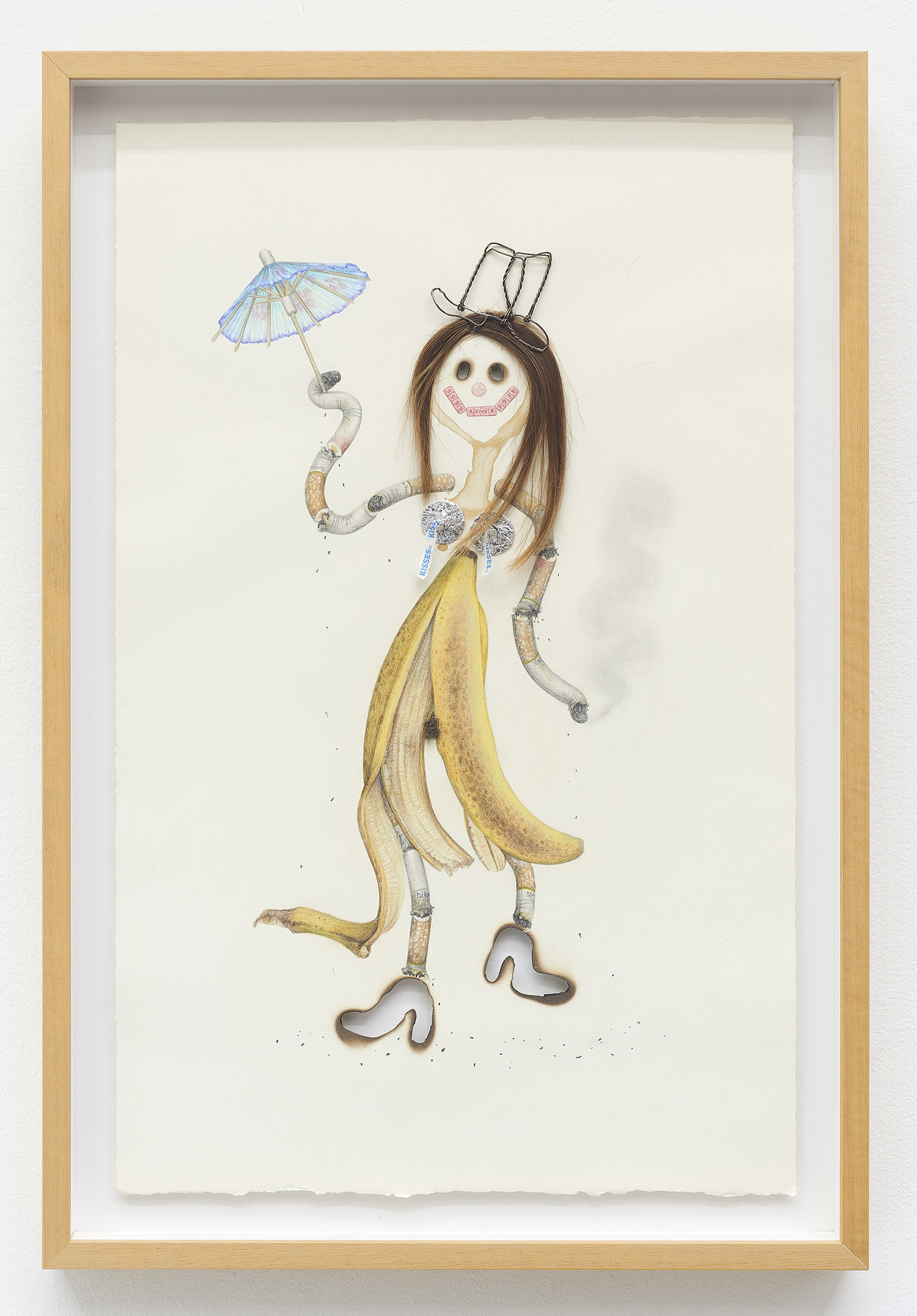 Drug Voodoo (Banana Girl), 2019. Color pencil, pencil, acrylic, beer, human hair, Hershey Kisses wrappers, metal, archival glue, burn holes on paper, Framed Dimensions: 25 x 17 inches, 64 x 43 cm