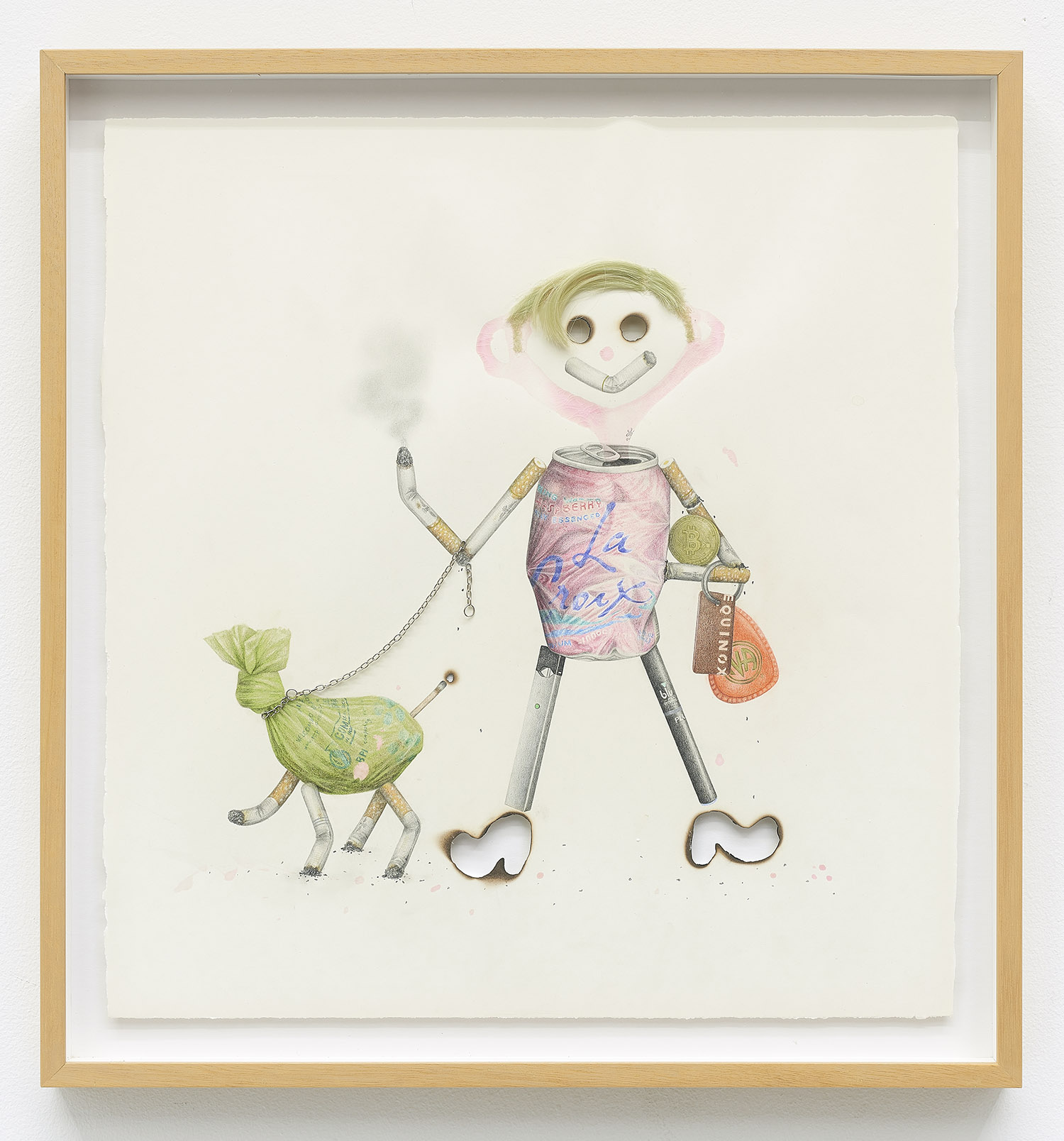 Drug Voodoo (LaCroix), 2019. Color pencil, pencil, acrylic, gouache, human hair, metal, archival glue, burn holes on paper, Framed Dimensions: 23.75 x 22.5 inches, 60 x 57 cm