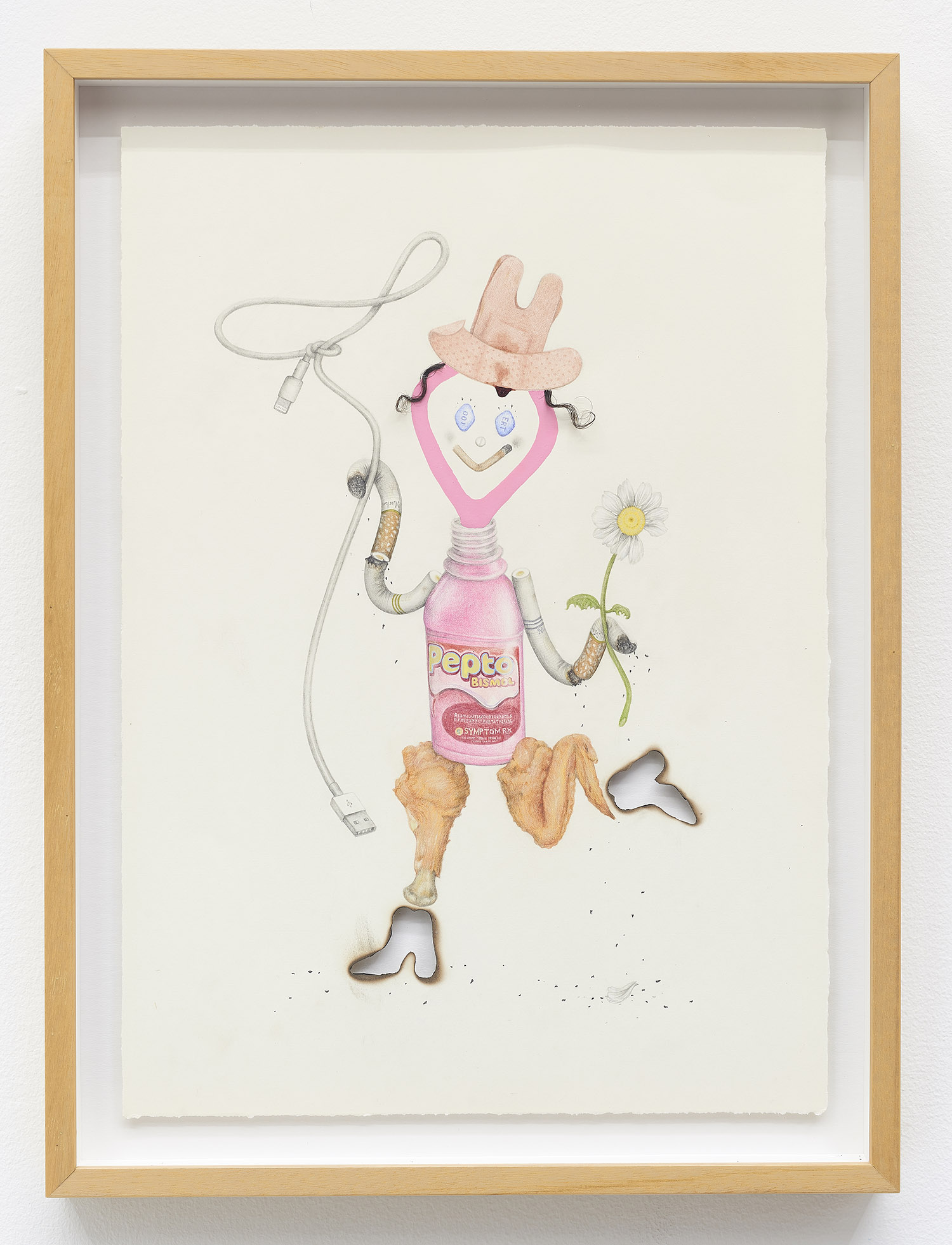 Drug Voodoo (Pepto Cowboy), 2019. Color pencil, pencil, acrylic, human hair, blood, archival glue, burn holes on paper, Framed Dimensions: 22 x 16.25 inches, 56 x 41 cm