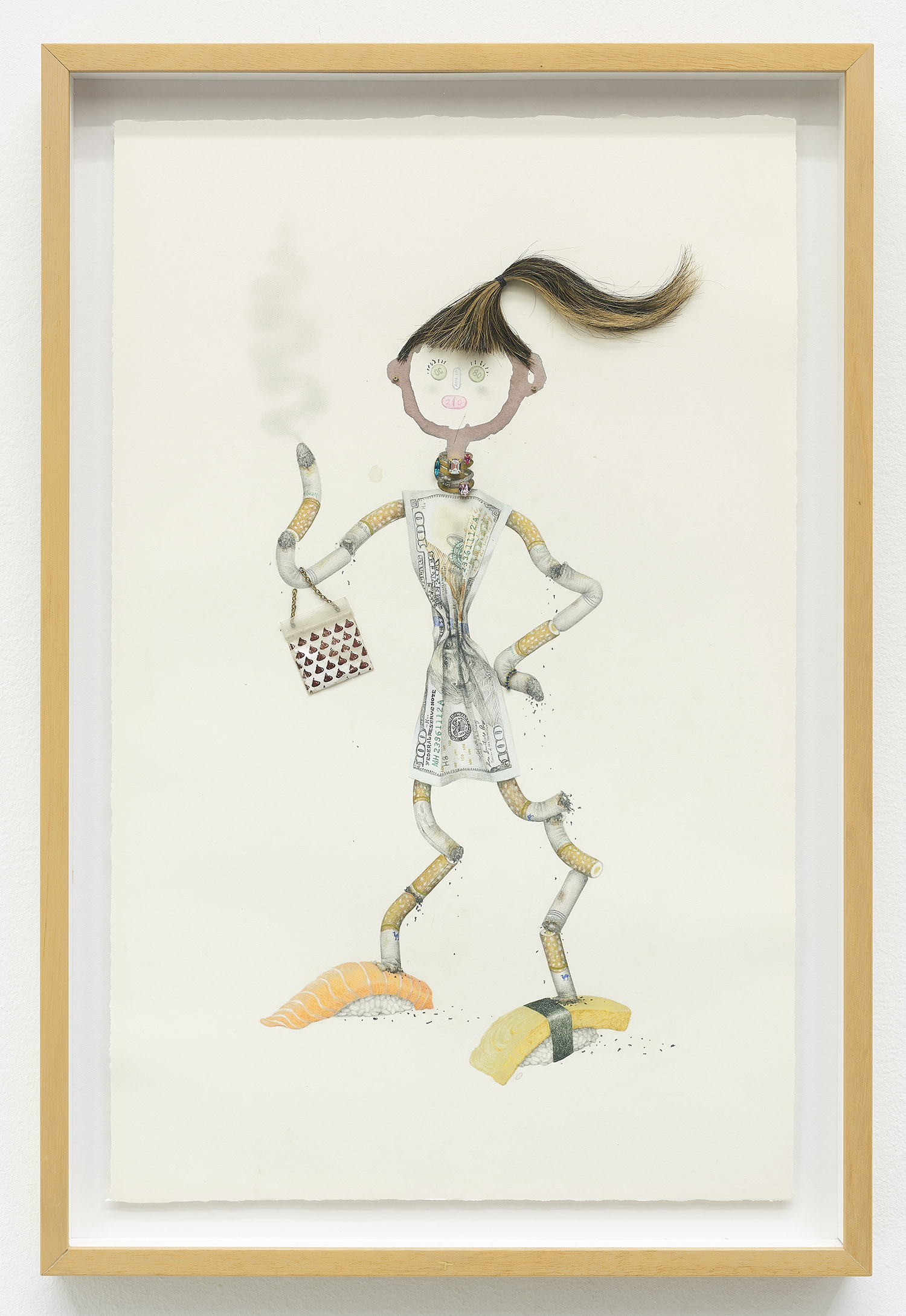 Drug Voodoo (Rich Bitch), 2019. Color pencil, pencil, acrylic, human hair, Swarovski Crystals, plastic baggie, metal, archival glue on paper, Framed Dimensions: 25.5 x 17 inches, 65 x 43 cm