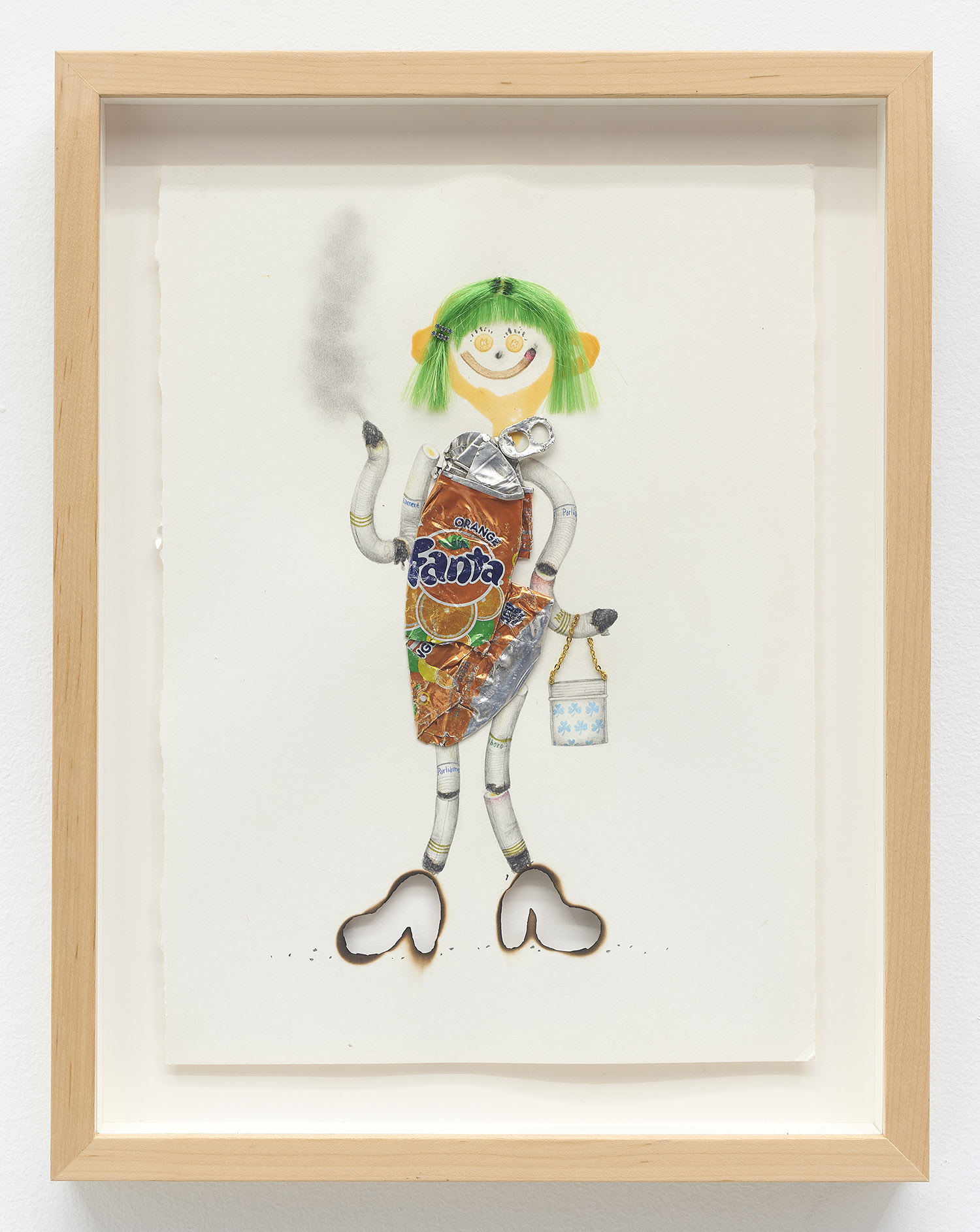 Drug Voodoo (Fanta), 2019. Color pencil, pencil, acrylic, crushed Fanta can, wig hair, Swarovski Crystals, metal, archival glue, burnholes on paper, Framed Dimensions: 19 x 15 inches, 48 x 38 cm
