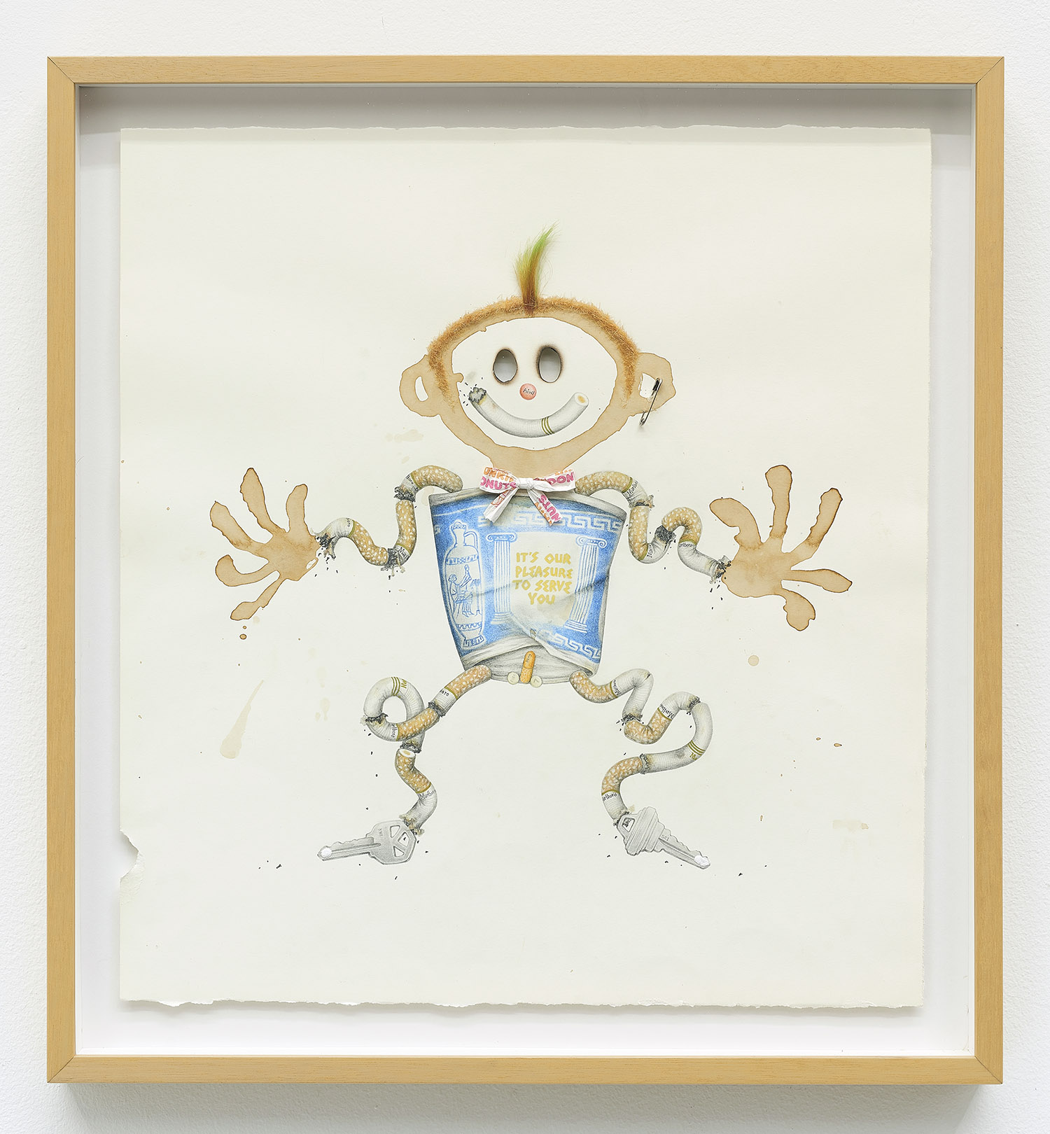 Drug Voodoo (Greek Coffee), 2019. Color pencil, pencil, acrylic, coffee, baking powder, human hair, safety pin, Dunkin Donuts wrapper, archival glue, burn holes on paper, Framed Dimensions: 21.5 x 20 inches, 55 x 51 cm