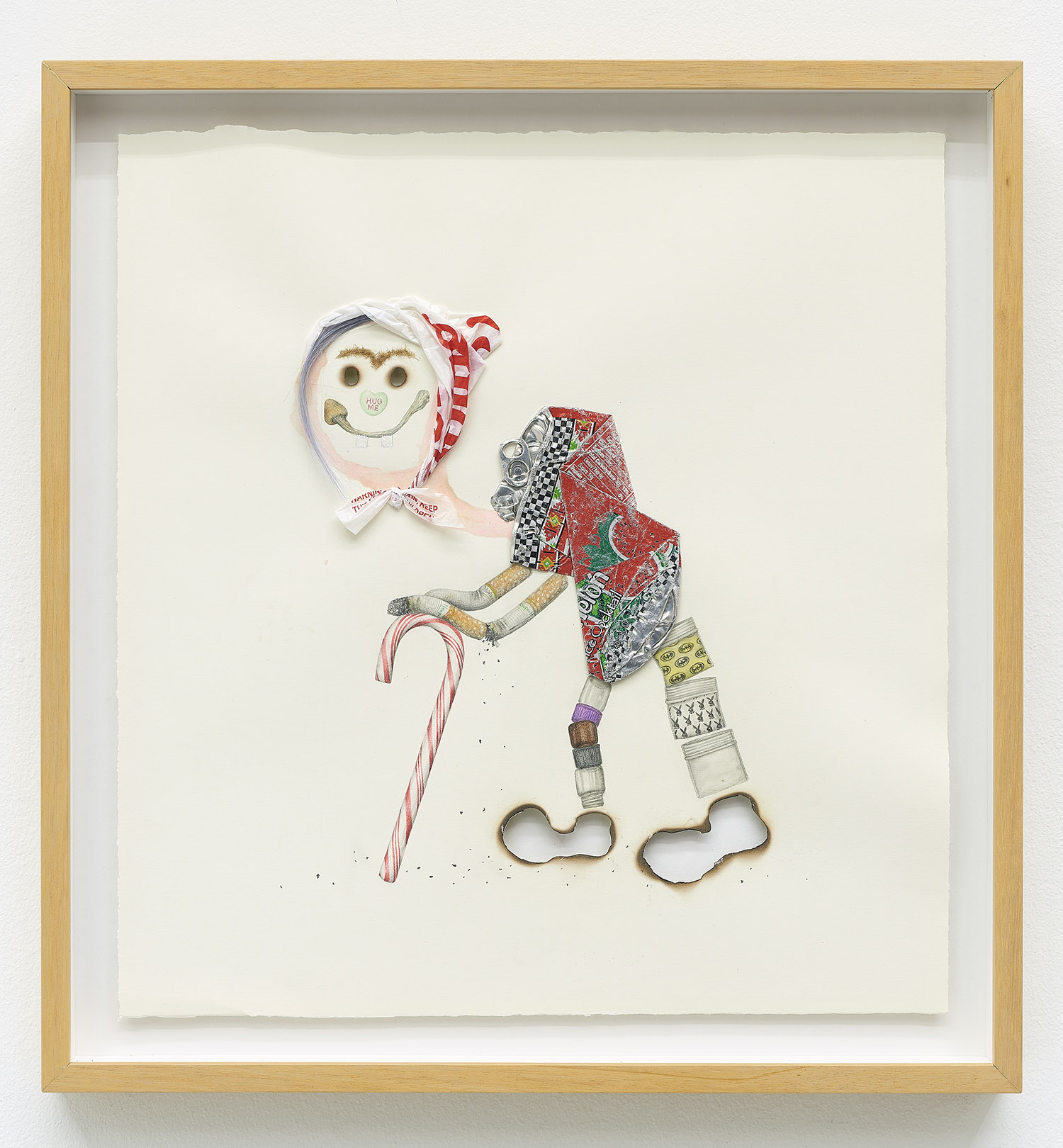 Drug Voodoo (Candy Cane), 2019. Color pencil, pencil, acrylic, human hair, blood, archival glue, burn holes on paper, Framed Dimensions: 20.5 x 19.25 inches, 52 x 49 cm