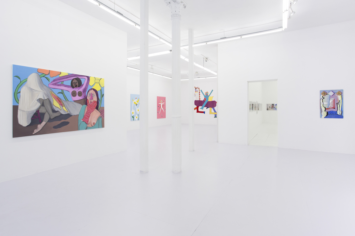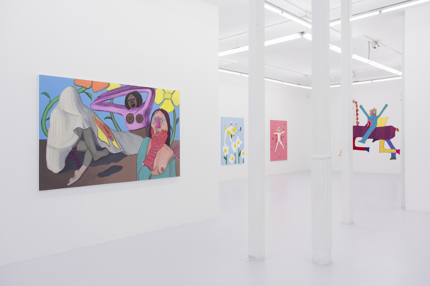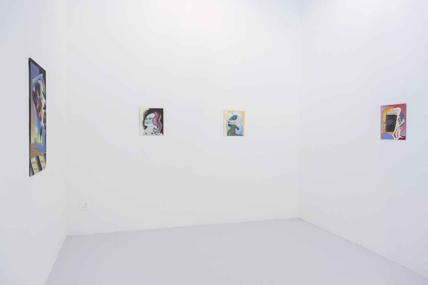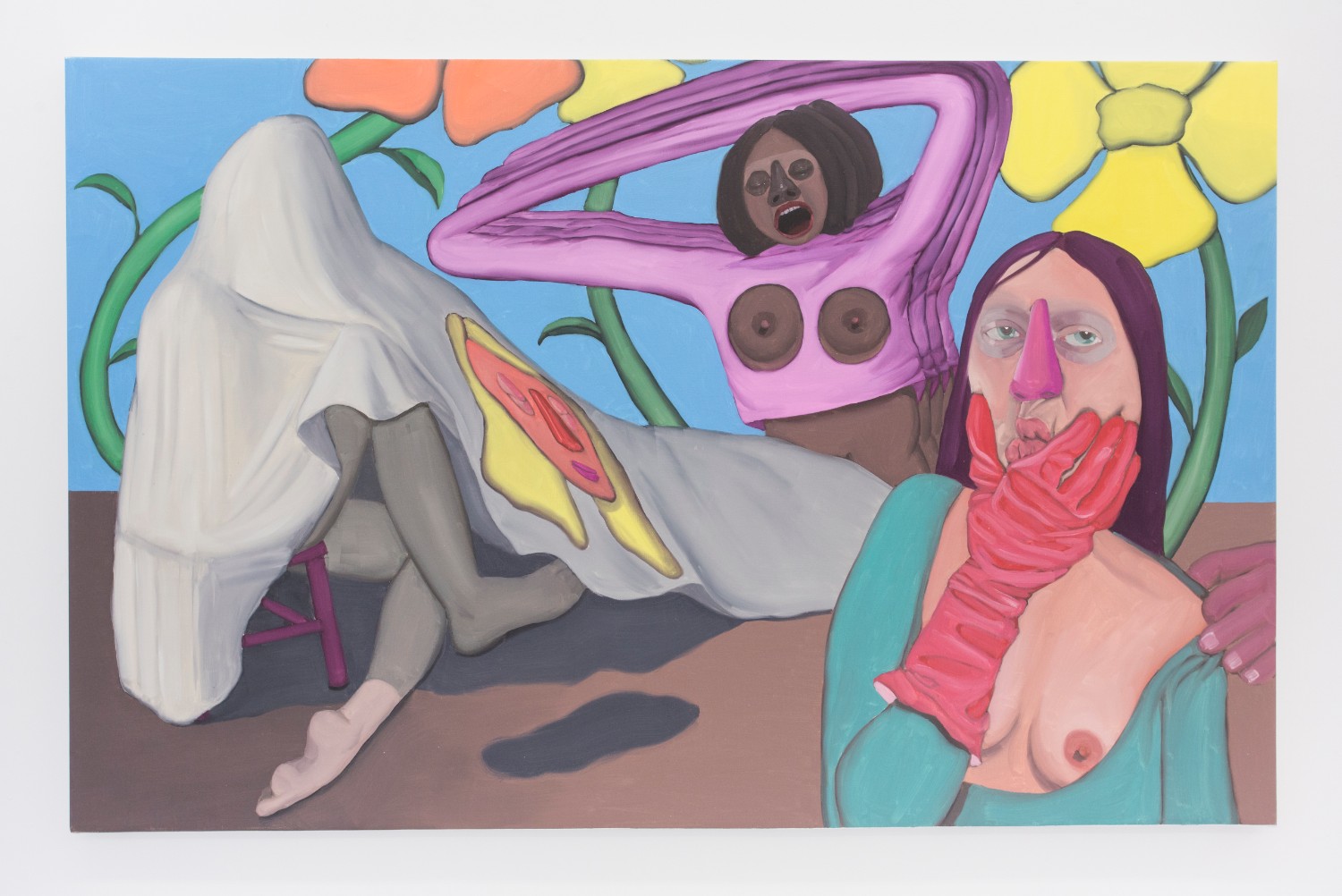 Lastly, Anja Salonen (b. 1994 LA) literalizes the push between figuration and flatness by including both in her expansive painting. Three fleshed-out figures of blended oil paint sit in a flat landscape with a canvas draped over one of them, on which a flat colored face is painted. Perhaps the most psychological work in the show–tho it has some competition in the “disturbed” department–the puzzlement on the foreground figure’s face just about covers it for me.