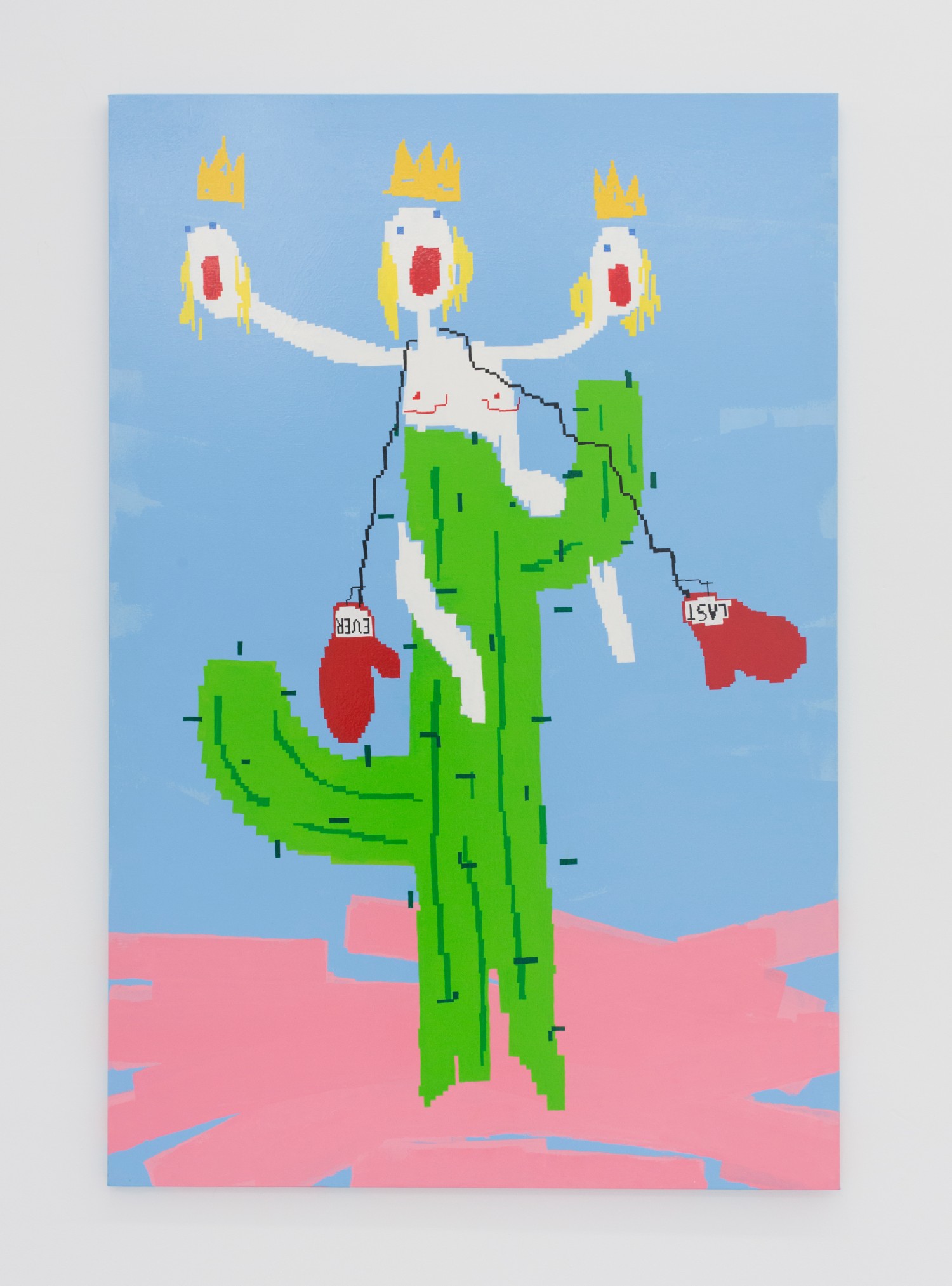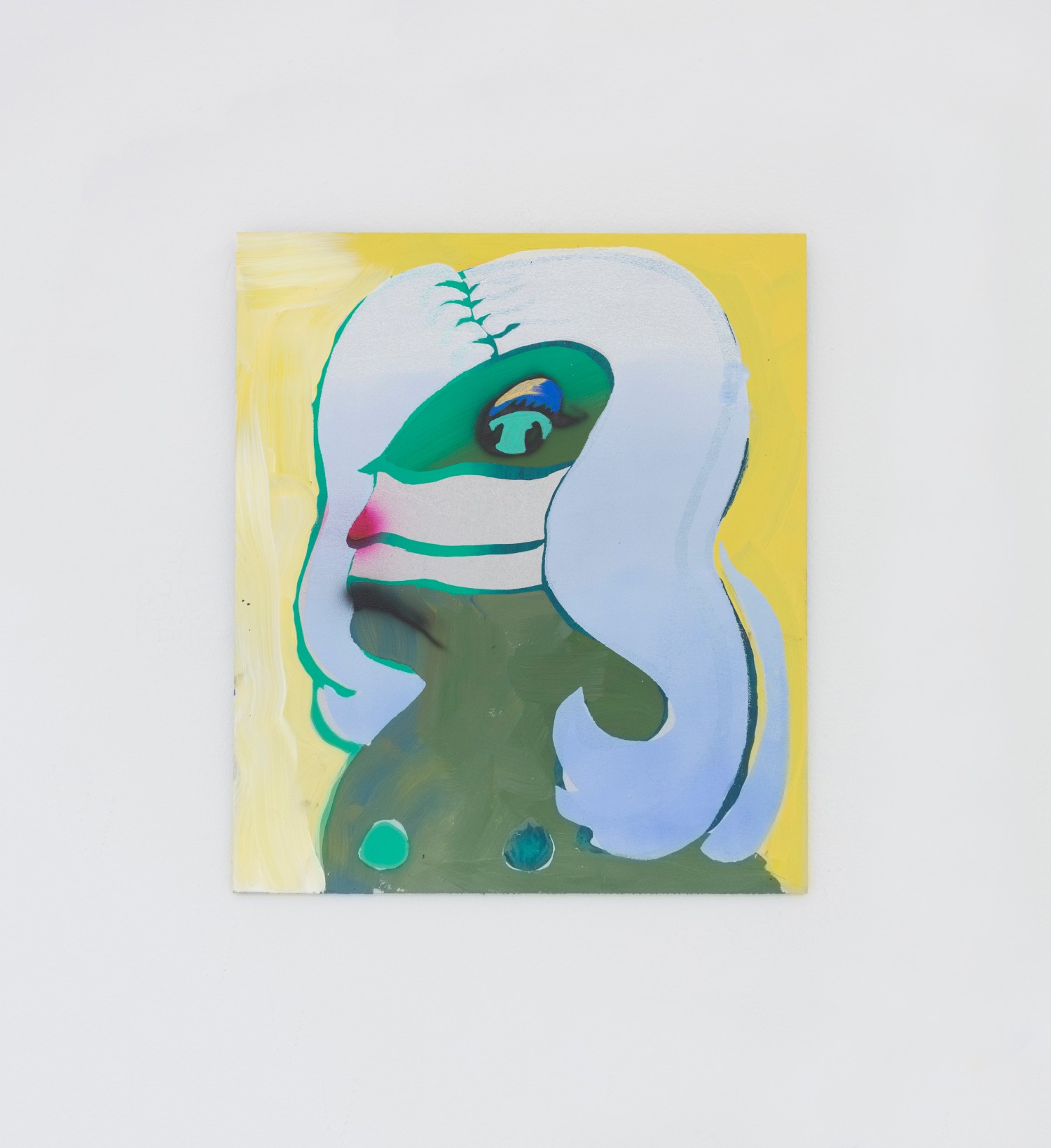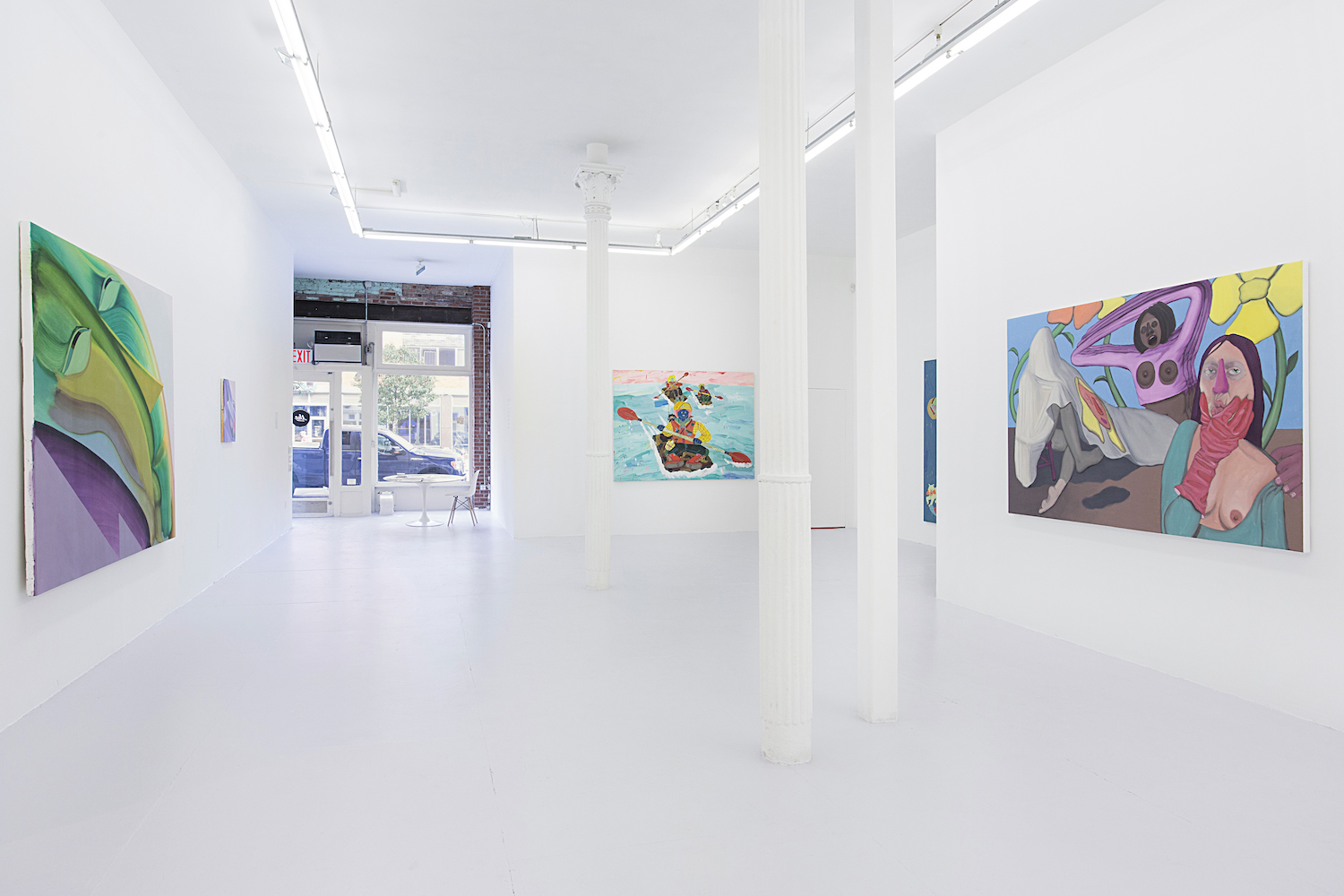 Works in this show take a flat approach to figuration (though we couldn’t call the show “Flatlands” because the Whitney show just did) and this abuttment of areas of color to produce the figure here is both rudimentary and nuanced. Maja Djordjevic (b. 1990 Serbia) paints large oil paintings that look like quick MS Paint sketch ups. The women have blue squares for eyes, a scribble of yellow for hair and a big jaggedy red mouth, always yelling. Though abject as anything I’ve ever seen, the paintings inexplicably have positive titles, as in the above, “Be Happy — I Love You”.