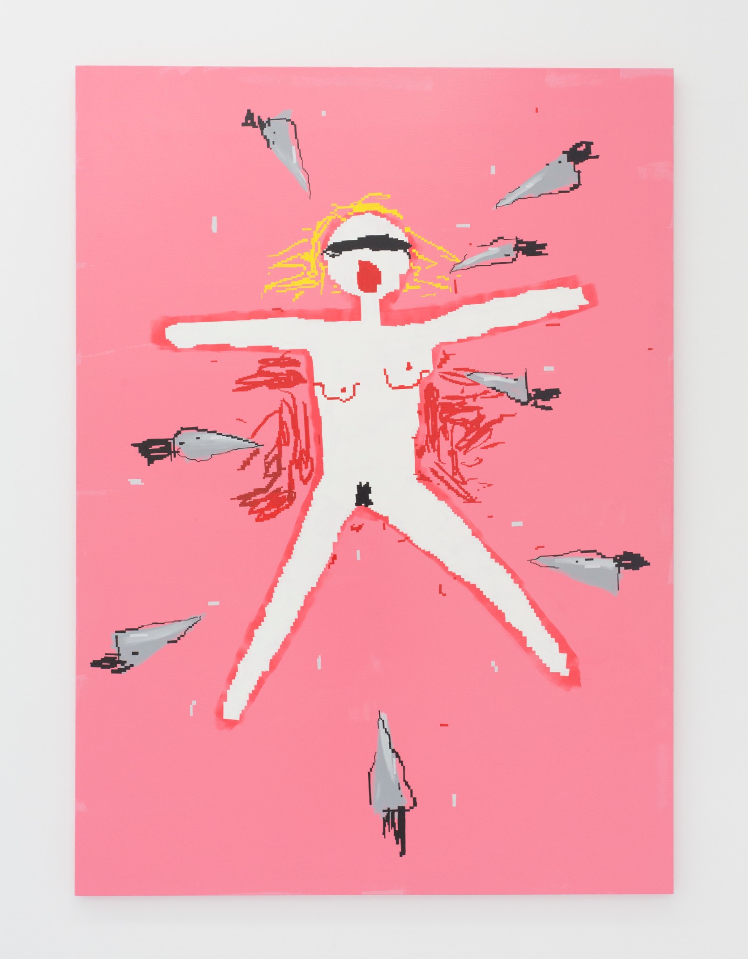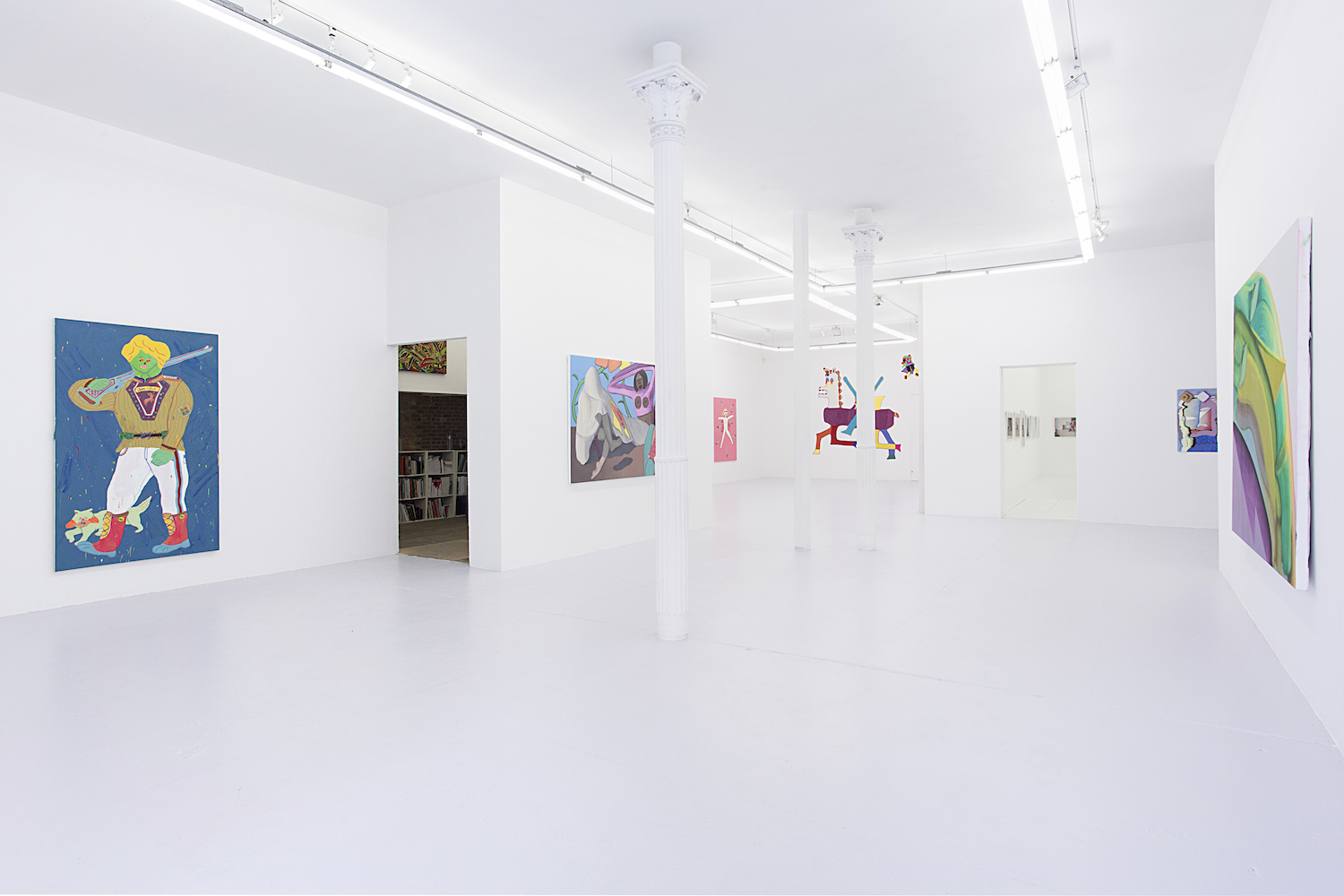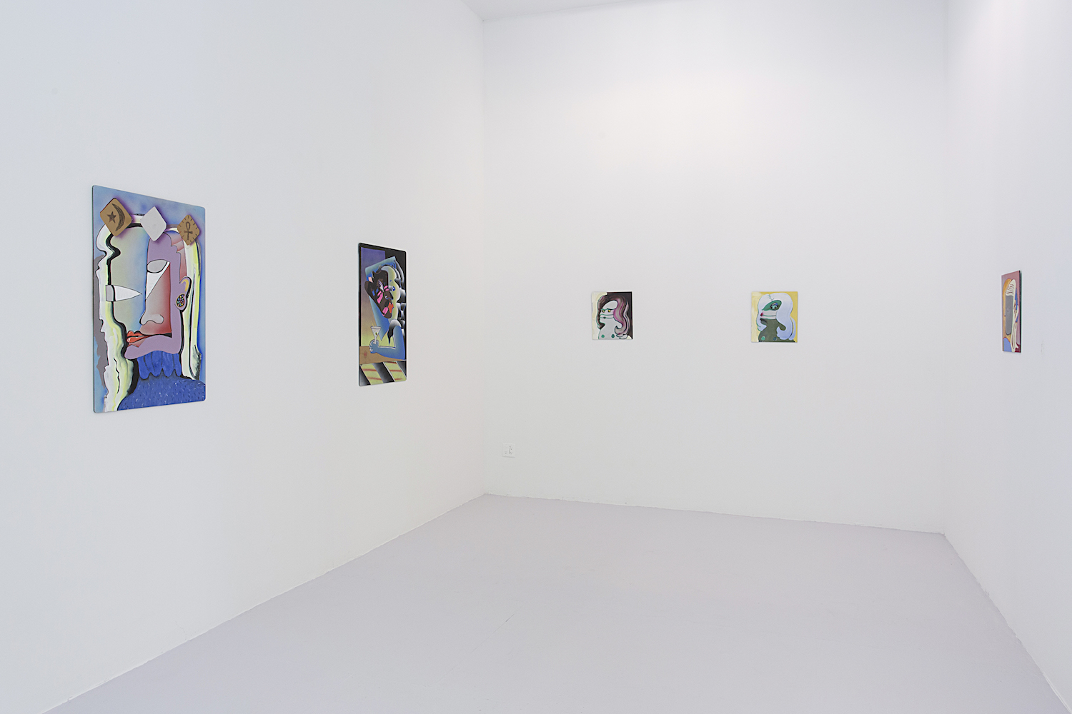 These flattened figures may not be flesh, hairy and sweaty but they do all carry some kind of intensity, some anxiety, exuberance. As sorta symbols of a human rather than a traditional figure painting, these bodies represent more than a fully-rendered human might. Djordjevic’s paintings for example only barely look like a person, you wouldn’t see yourself in their skin, you wouldn’t think they had a name, they are interchangably undifferentiated. But their lack of personalized feelings make them more effective conduits for communicating feeling somehow; the inchoate screams and gunshots reverberate with me, convey more poignantly a world that is out of control, howling and deranged. “Fried.” Maybe that would have been a good summer group show title….