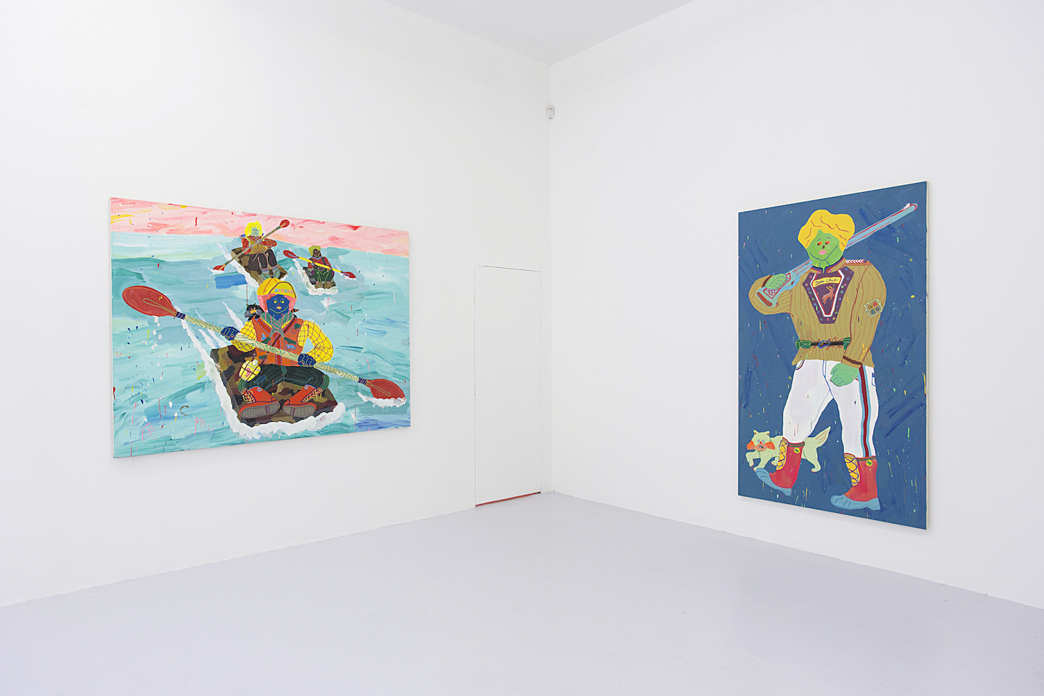 Misaki Kawai (b. 1978 Japan) gives us a hunting scene and a white water rafting scene, plus animals. These paintings come from a series of works that use matte medium to paste in areas of painted paper and fabric to make figures of creative skin tone and upended palette. From abstract brushy backgrounds down to meticulous detailed accoutrements, her summer campers are outfitted for some bizarro recreation.