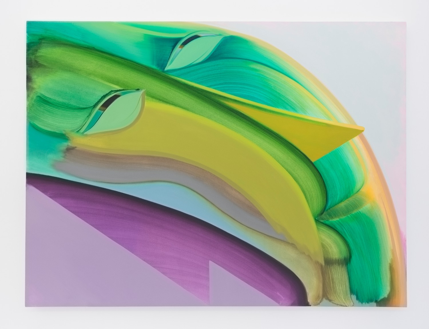 Joakim Ojanen (b. 1985 Sweden) exhibits two little creatures, from a cartooning realm but fussily shadowed and lit with little squiggly black or white paint lines. Tubular, lumpy, and duck-lipped the little guy “Looking / Hiding” would happily exist well as either a painting or a puppet. The artist is known for beautiful glazed clay sculptures and the paintings look like they were composed in the same manner, à la Mr. Potato Head, a clay shape with protuberances added on to customize.