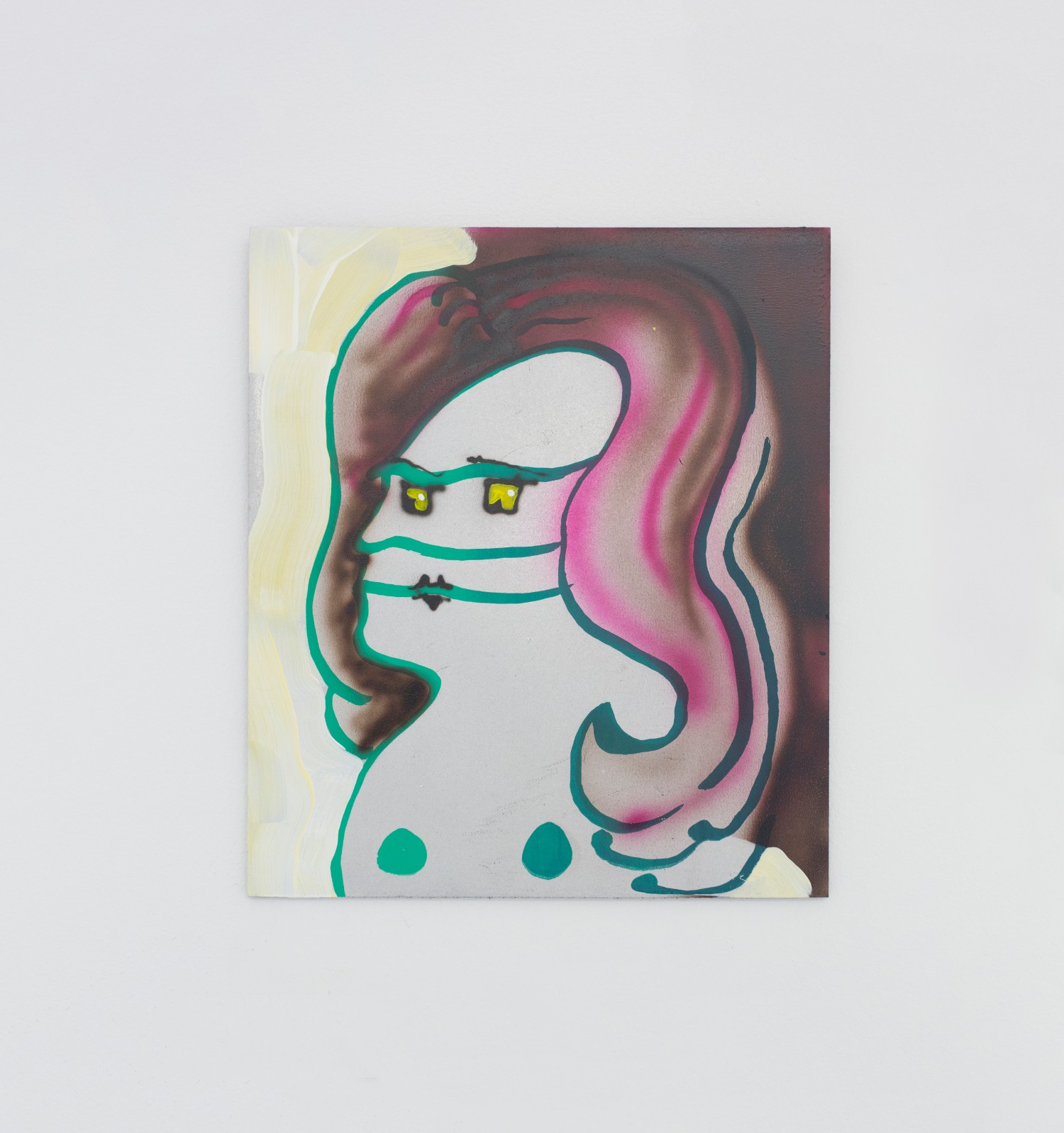 Similar in Jim Nutt-iness is Melissa Brown (b. 1974 New Jersey) whose ladies look a bit slicker with flashe and oil on aluminum but also get bedazzled a bit with scratch-offs, silkscreen and gradients. She exhibits five females; busts, let’s say, and lets also say “enigmatic”. We think that is the sphinx-like intent, with titles like “Matriarch” and “Mixed Messages”.