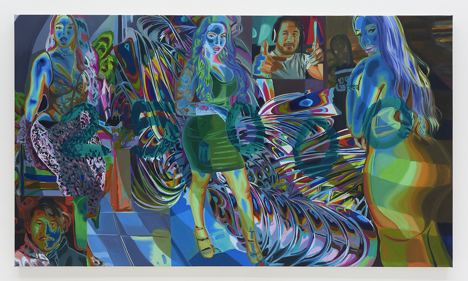 Cherry’s paintings feature larger-than-life subjects in striking color: Black femme figures, familiar composites drawn from an image culture that thrives on appropriating these women’s likeness while rarely crediting their creativity. Sustaining her engagement with the subjects of the previous show, which depicted the women employed at a Brooklyn cabaret, Cherry now paints dancers, bartenders and Instagram models working at cabarets and as online influencers. Across her recent work, these women’s bodies are overlaid with cryptic alphanumeric symbols—kaleidoscopic incursions that refer back to the codes and algorithms that power our media landscape, fueling the algorithmic tools of Black culture’s dissemination and extraction.