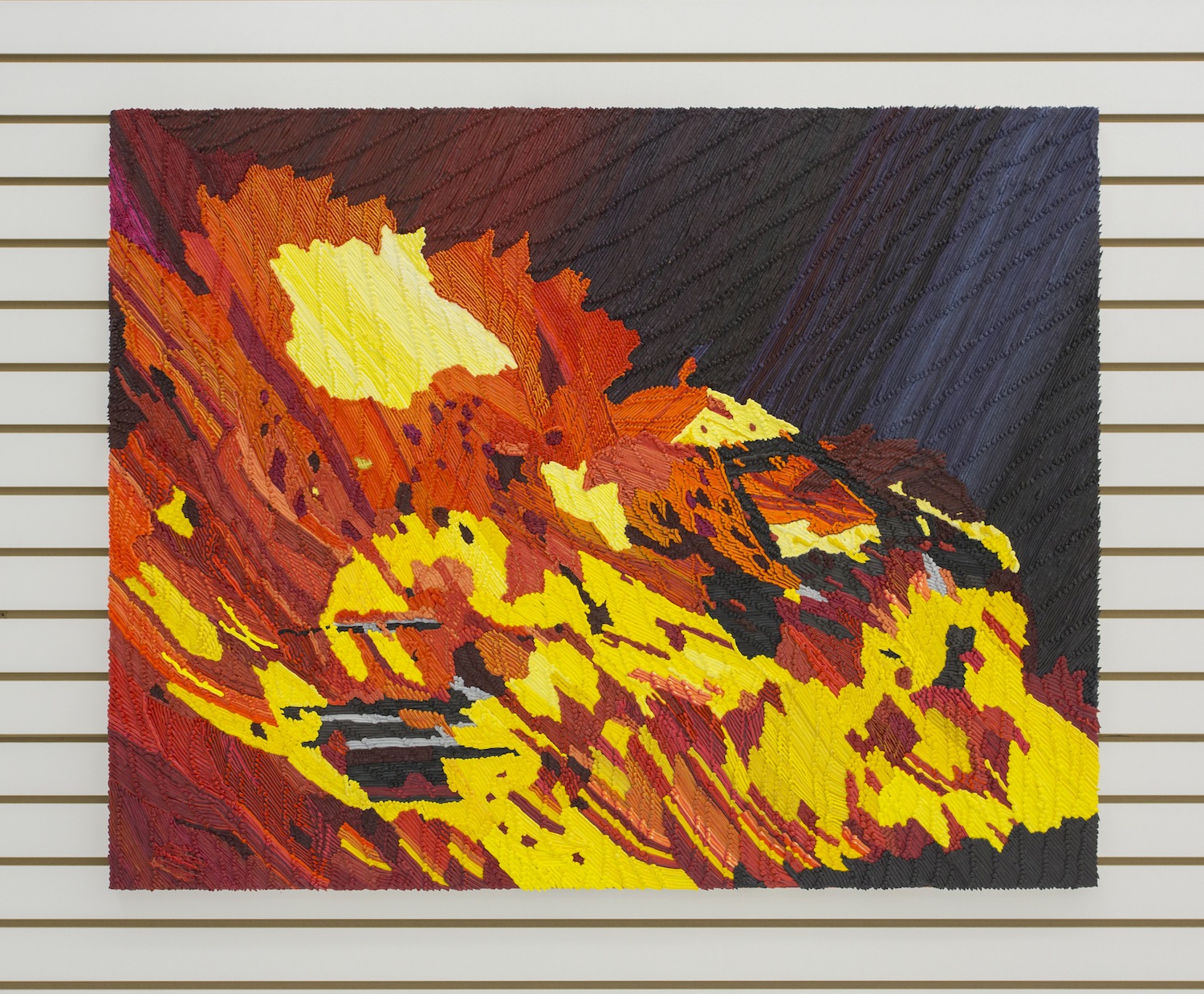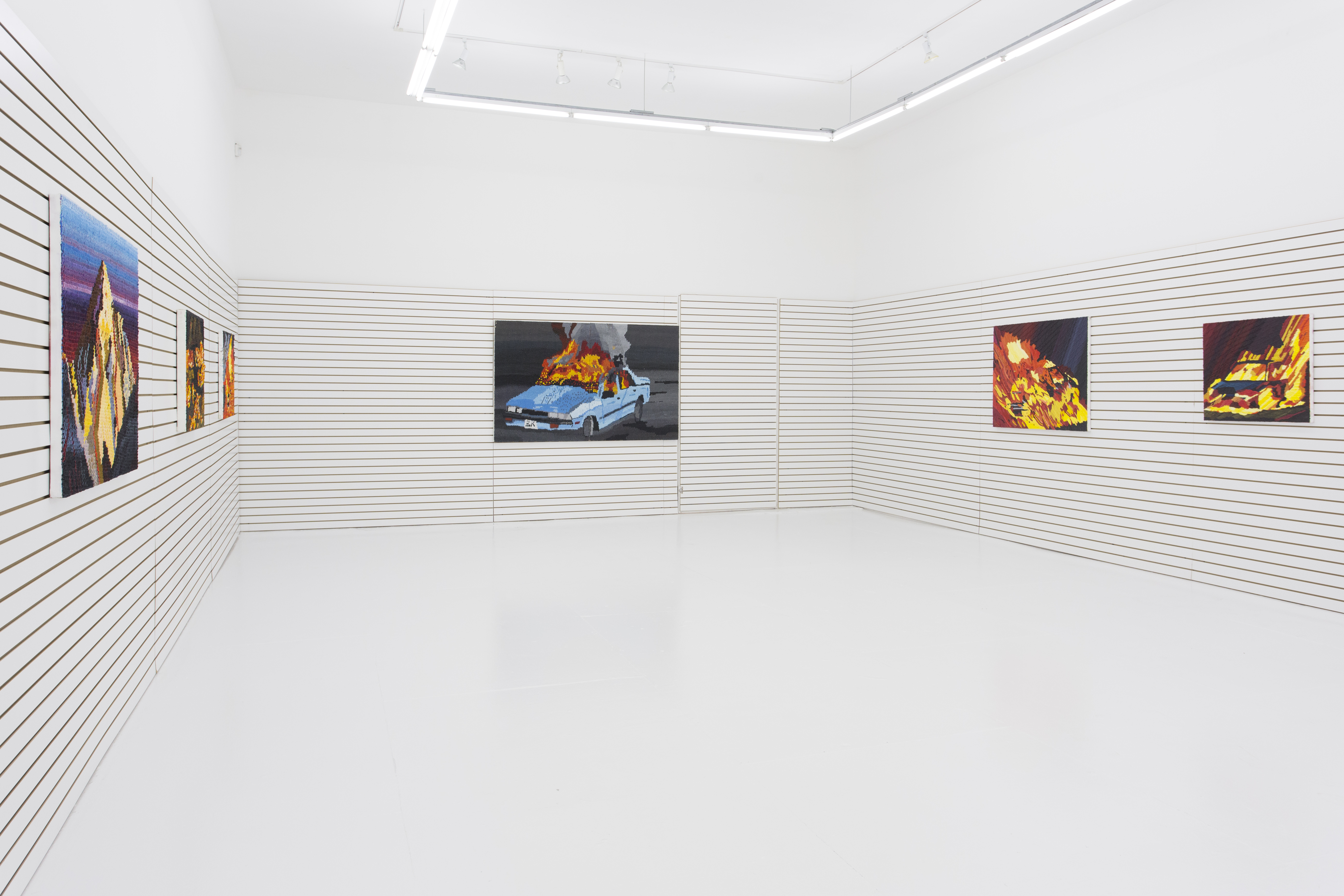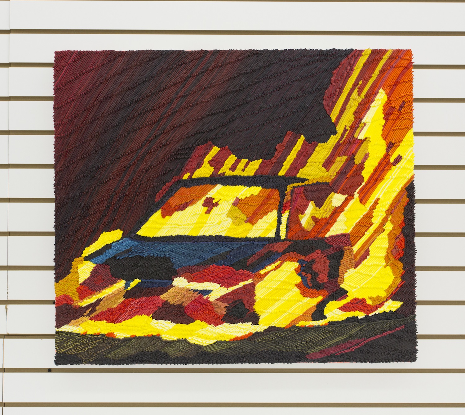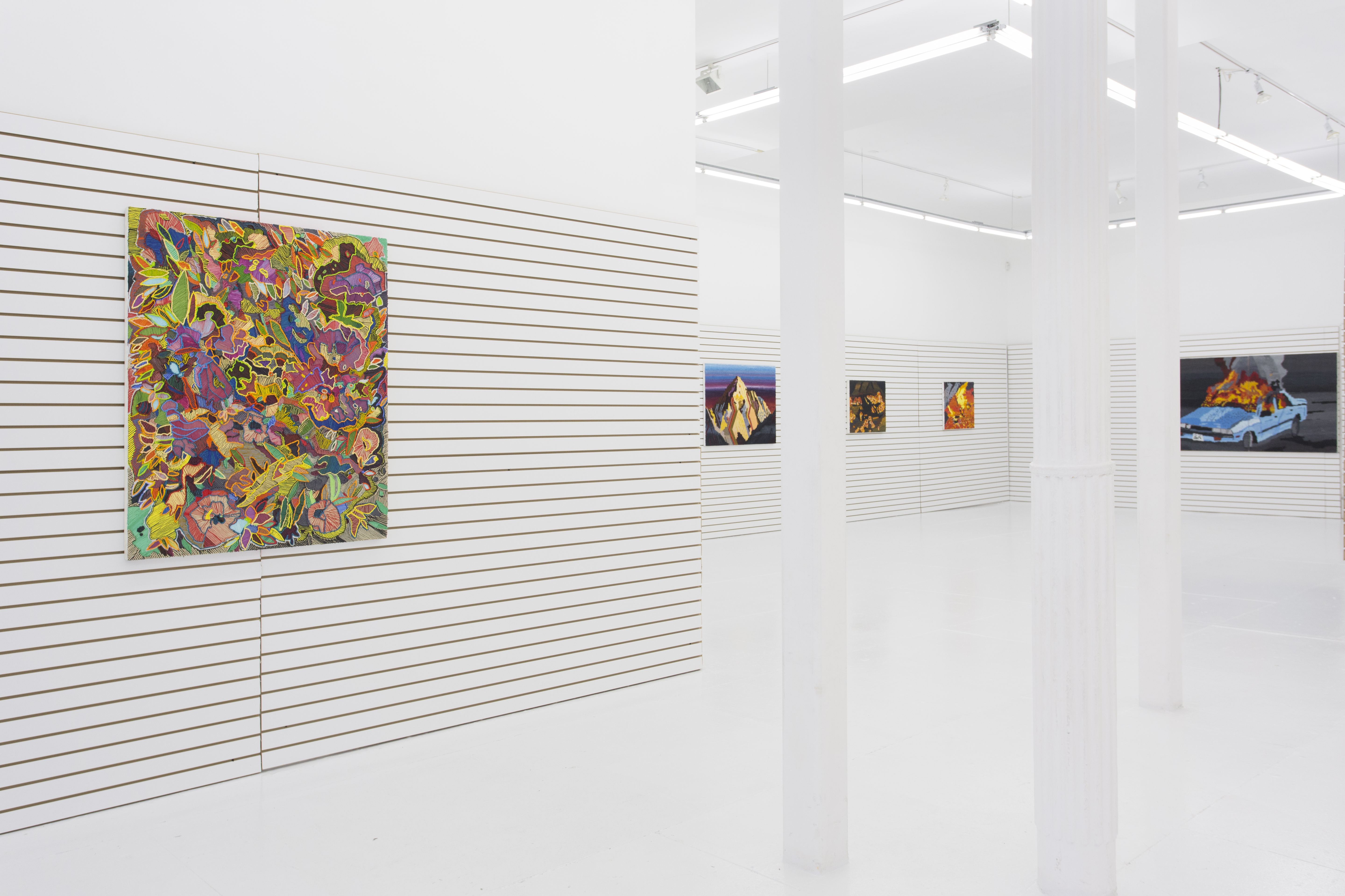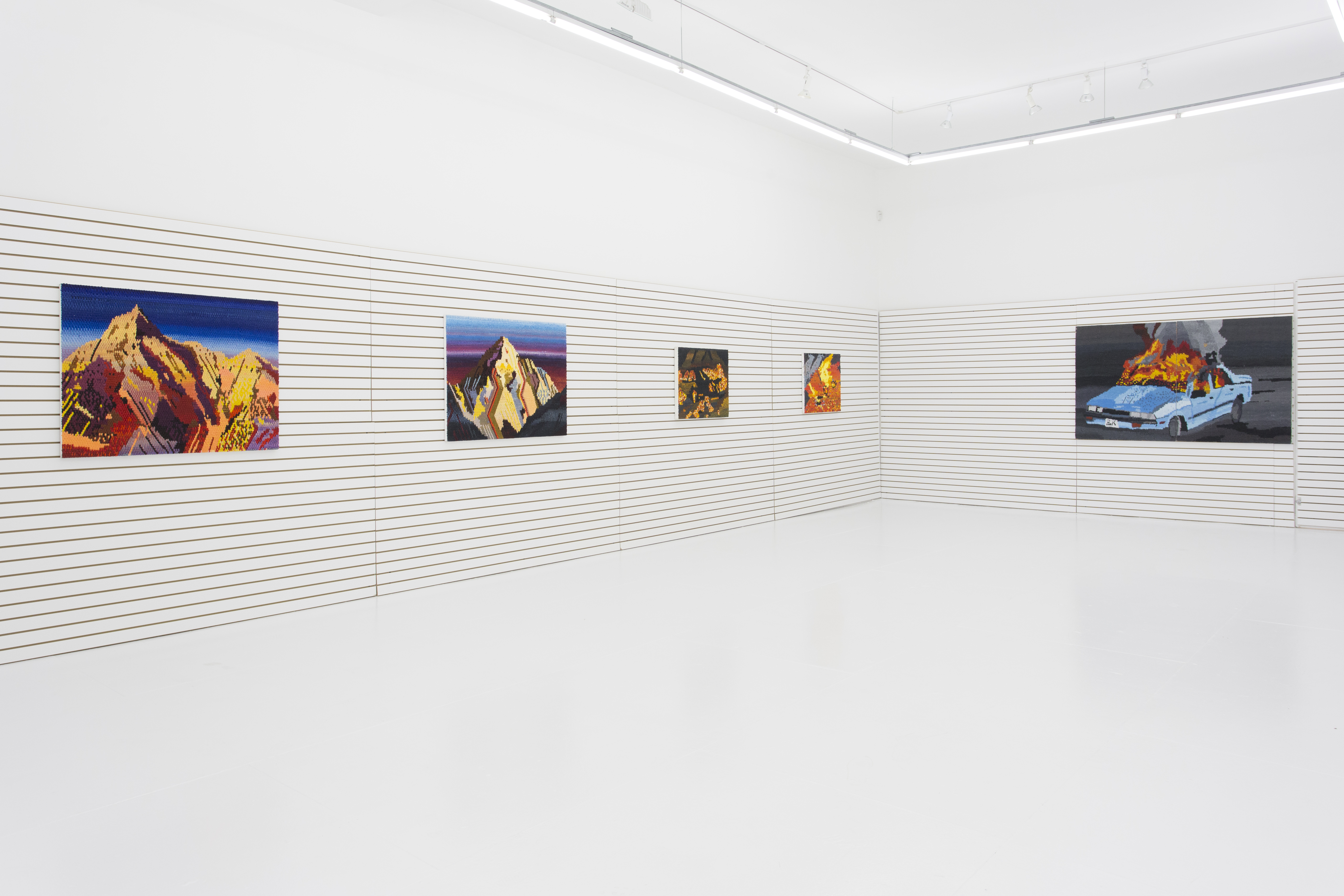Their craftiness and kitchiness adds a layer of complication; the technique feels so lovingly homespun, so why did the artist spin a scene of fiery destruction for us? Is the appeal of a flaming box truck abstract or sincere? Over-articulated edges and hypersaturated colors make the paintings of flora hectic, psychedelic. The mountains are so crazy colored they look on fire with sunset, a postcard injected with saccharine, is that beautiful or beautified? As with the exhibition by Adam Parker Smith concurrently in Gallery 3, the viewer is asked to question their own notions of beauty and the real and the fake.