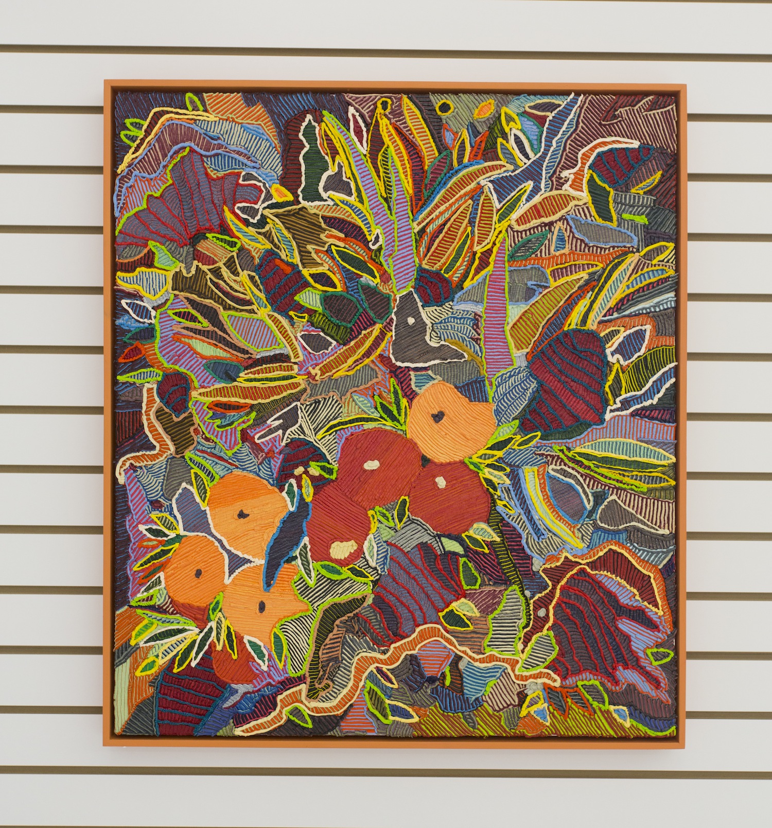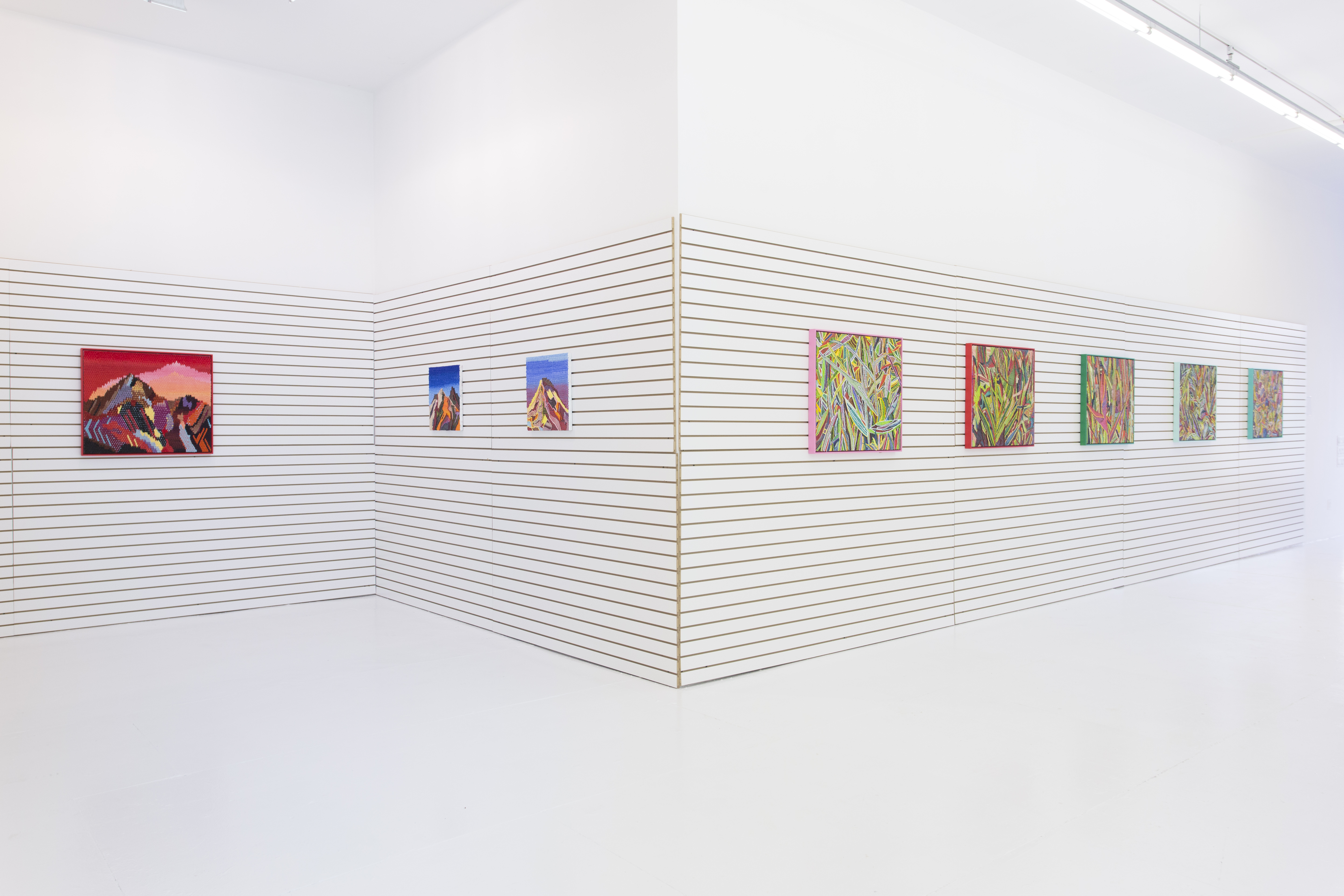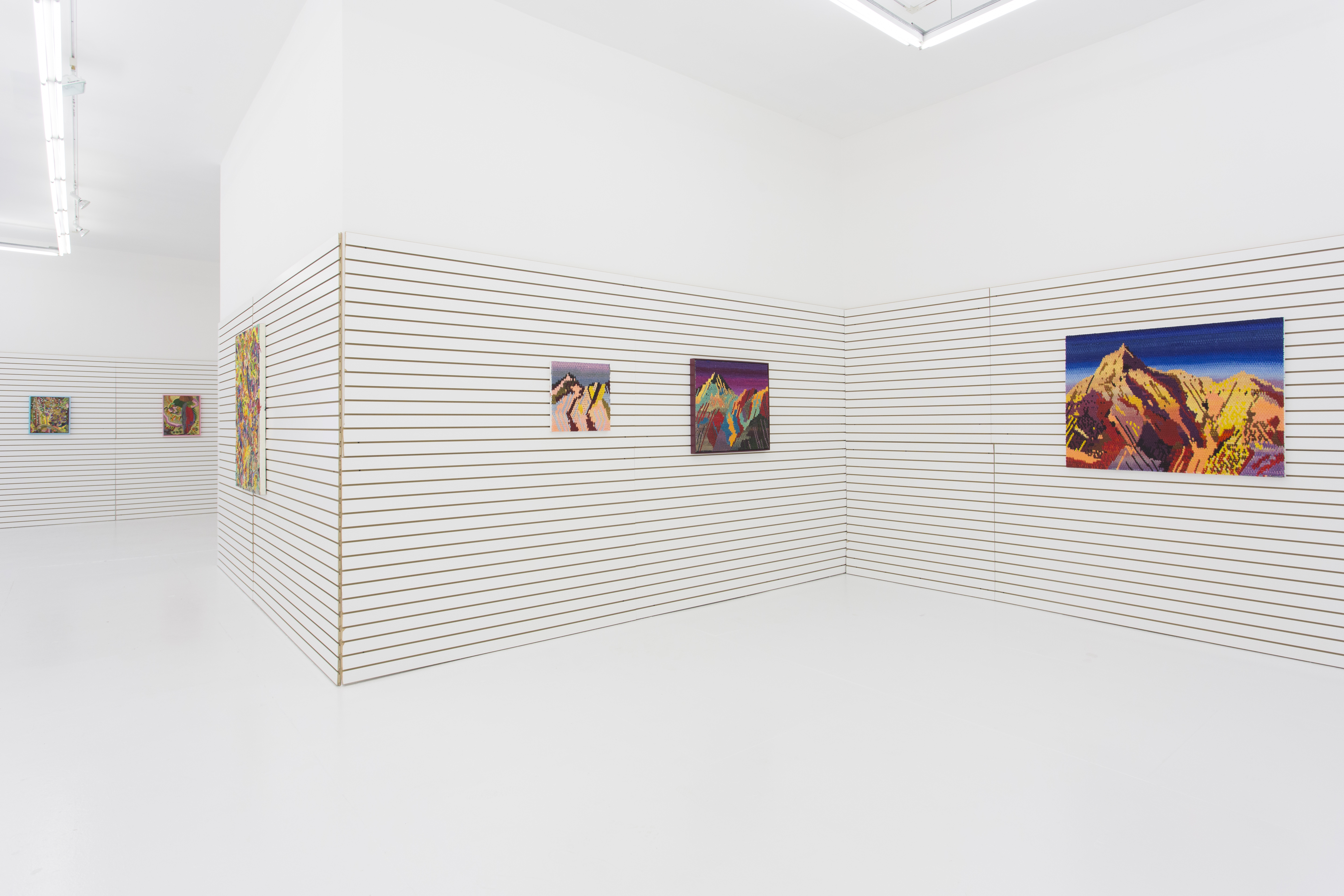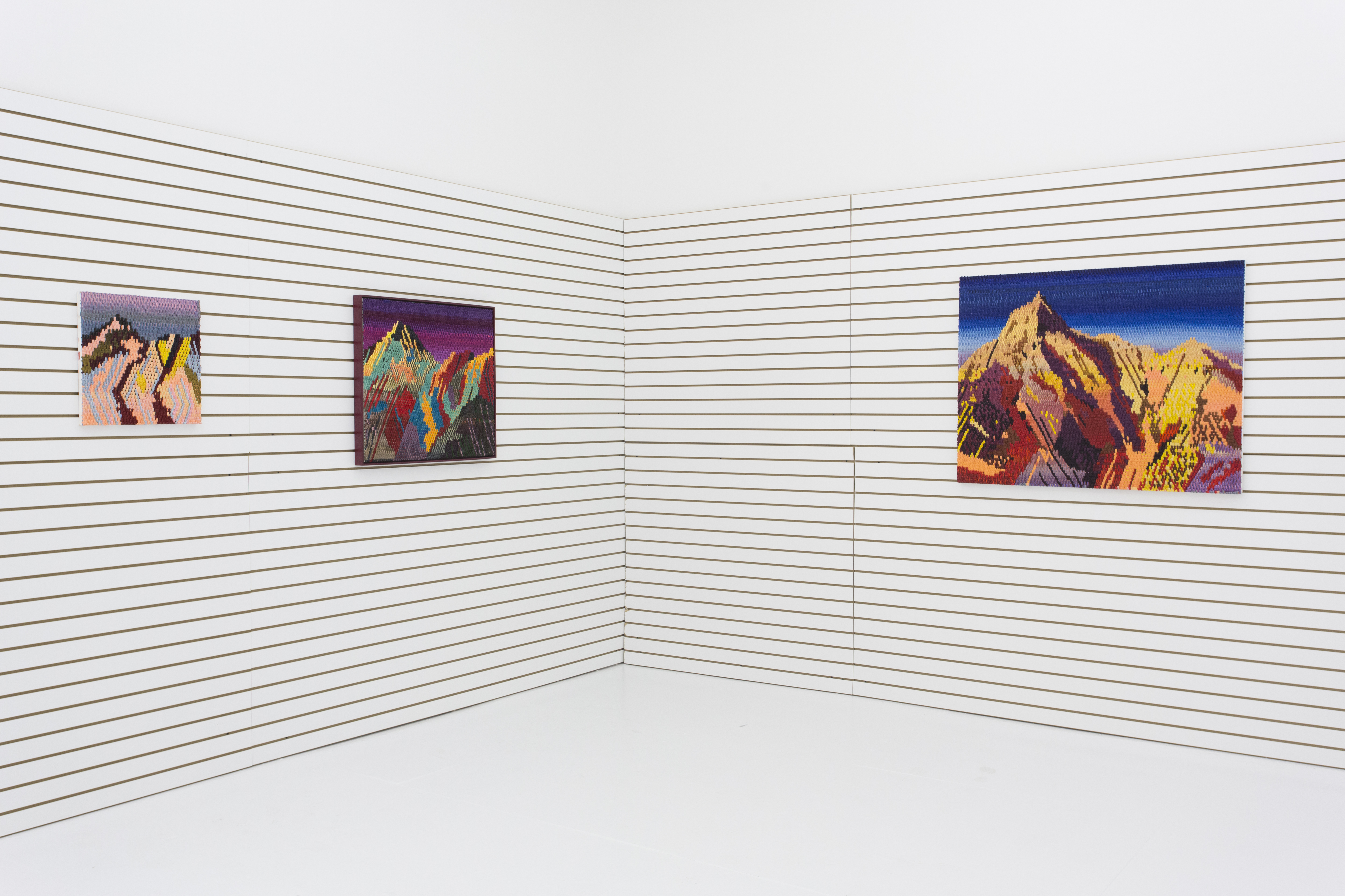 Their craftiness and kitchiness adds a layer of complication; the technique feels so lovingly homespun, so why did the artist spin a scene of fiery destruction for us? Is the appeal of a flaming box truck abstract or sincere? Over-articulated edges and hypersaturated colors make the paintings of flora hectic, psychedelic. The mountains are so crazy colored they look on fire with sunset, a postcard injected with saccharine, is that beautiful or beautified? As with the exhibition by Adam Parker Smith concurrently in Gallery 3, the viewer is asked to question their own notions of beauty and the real and the fake.