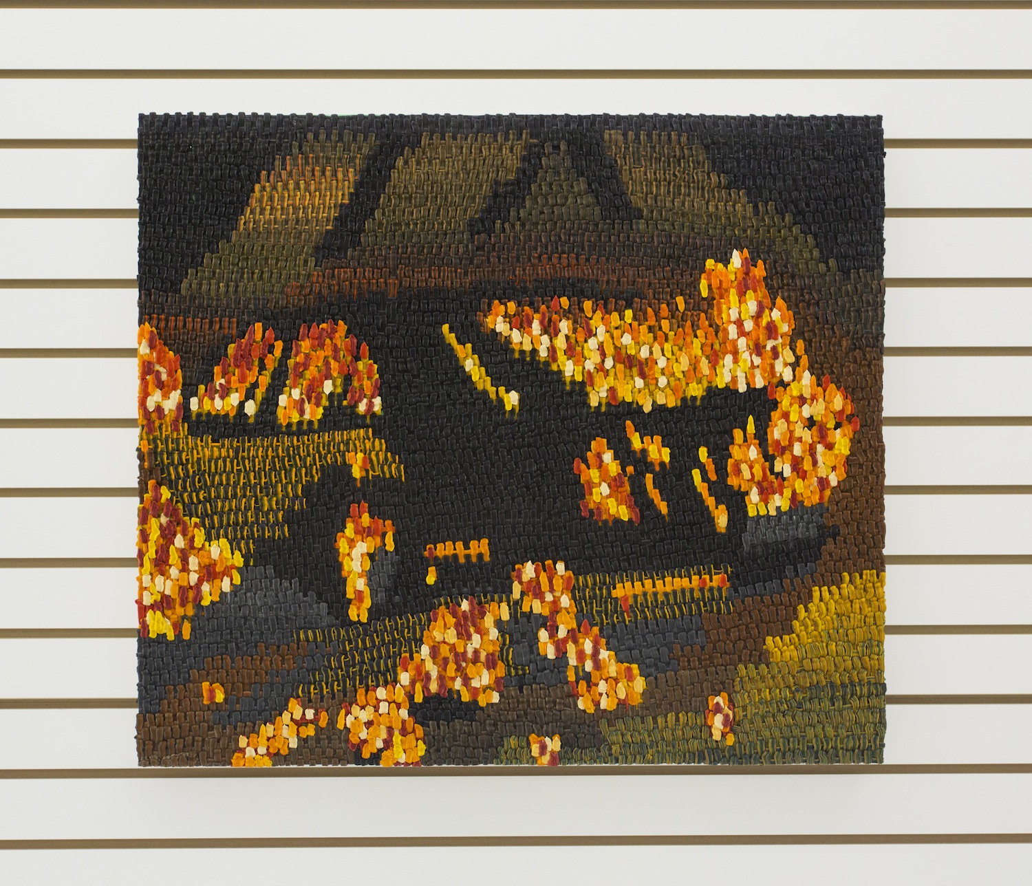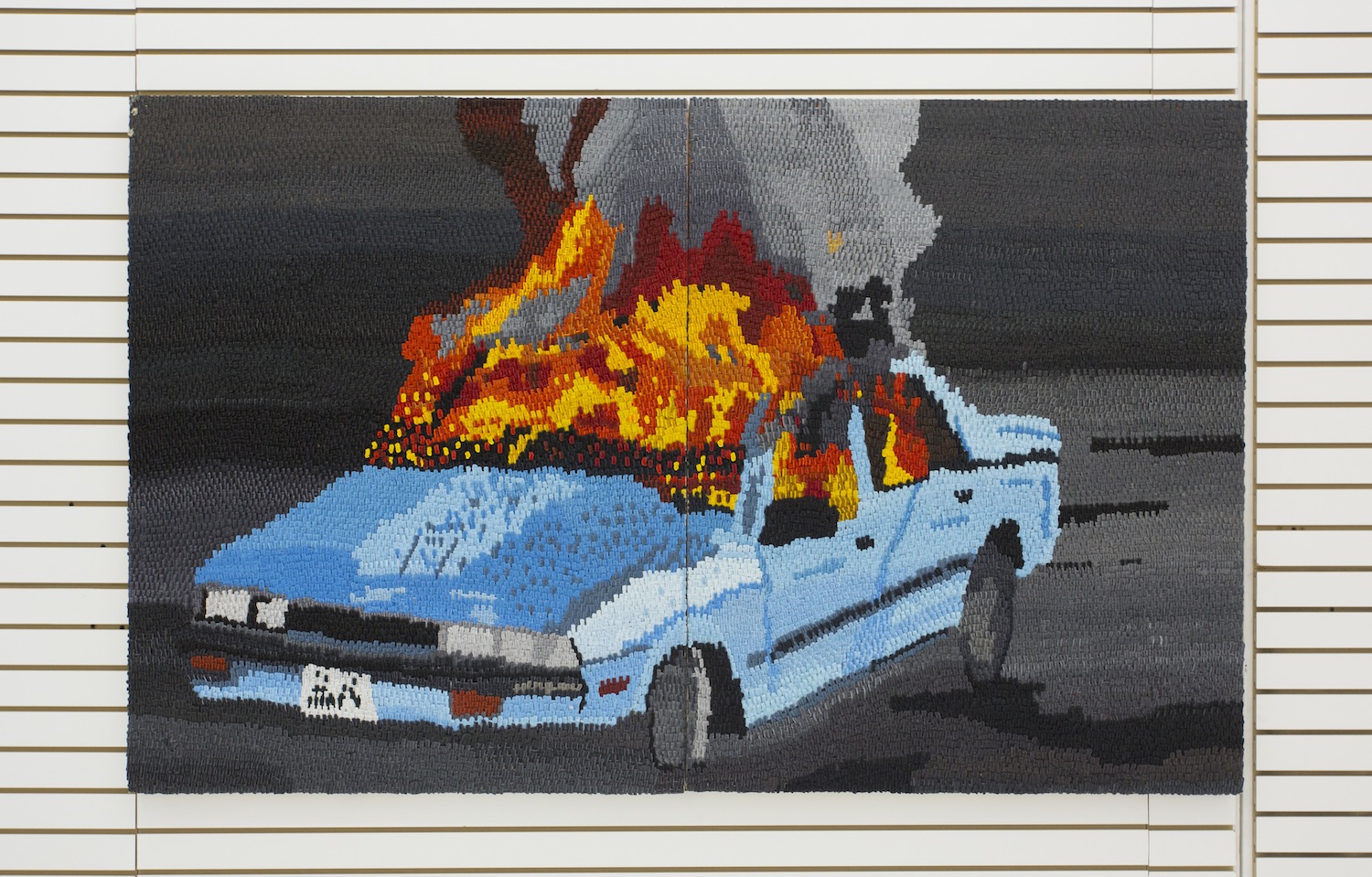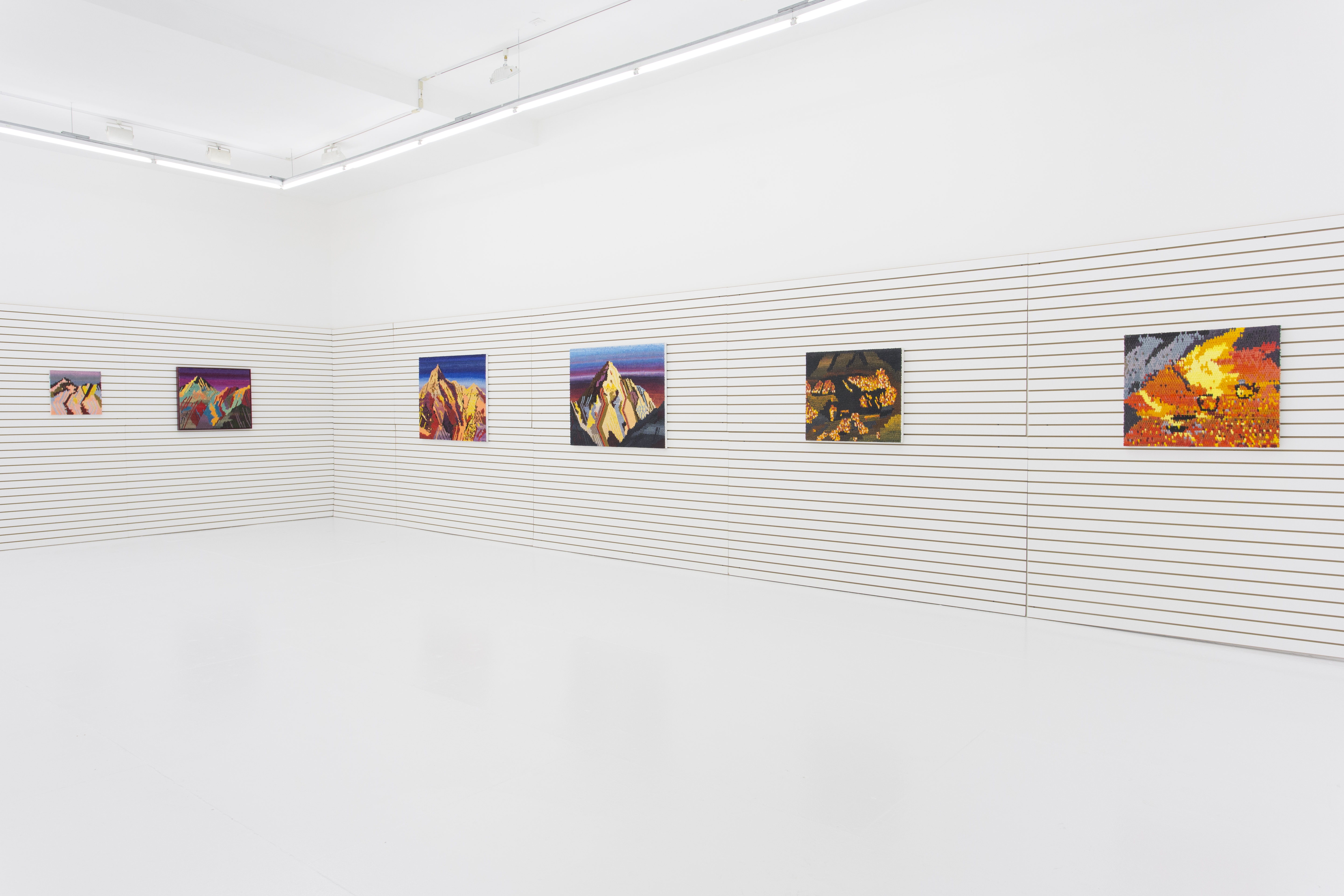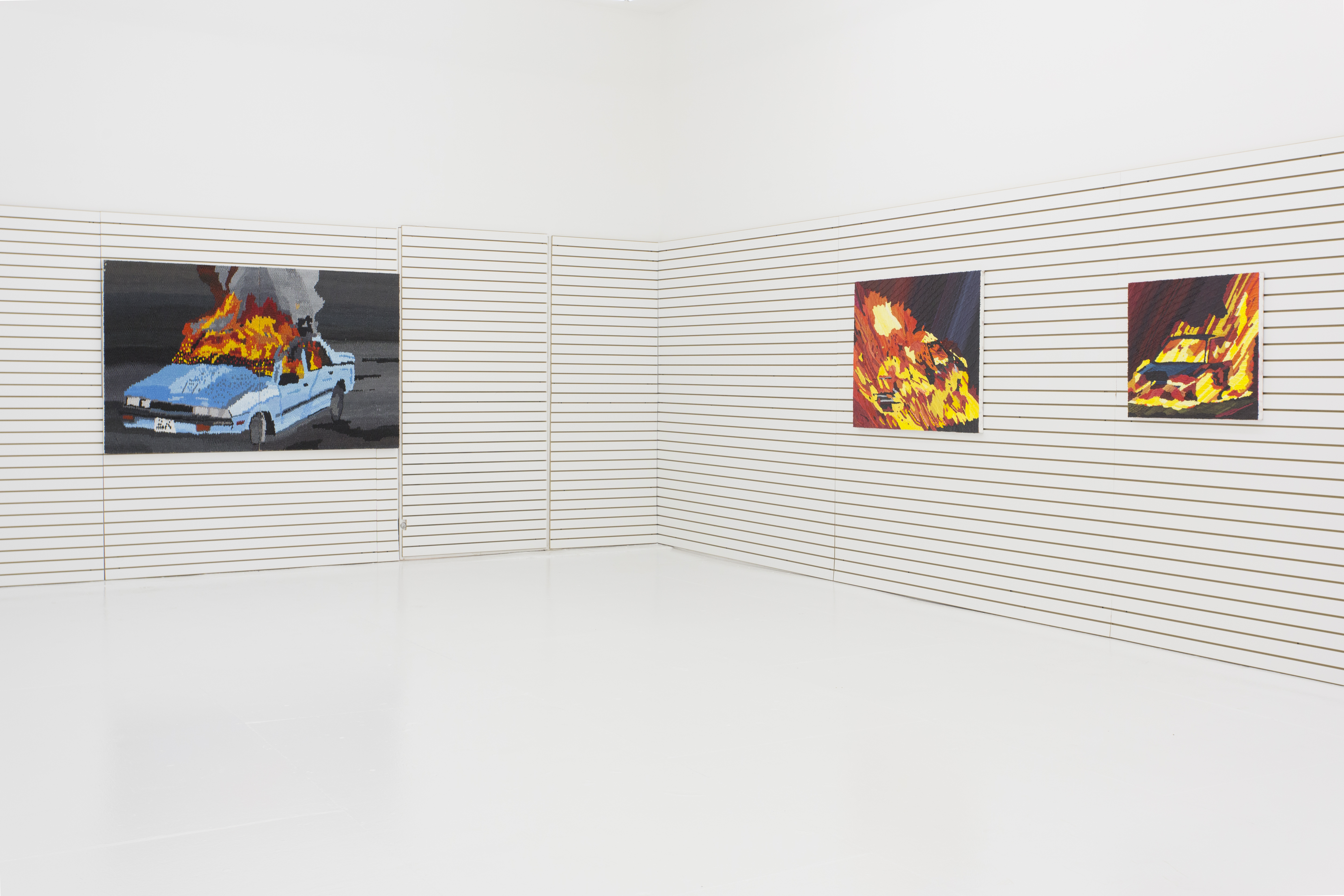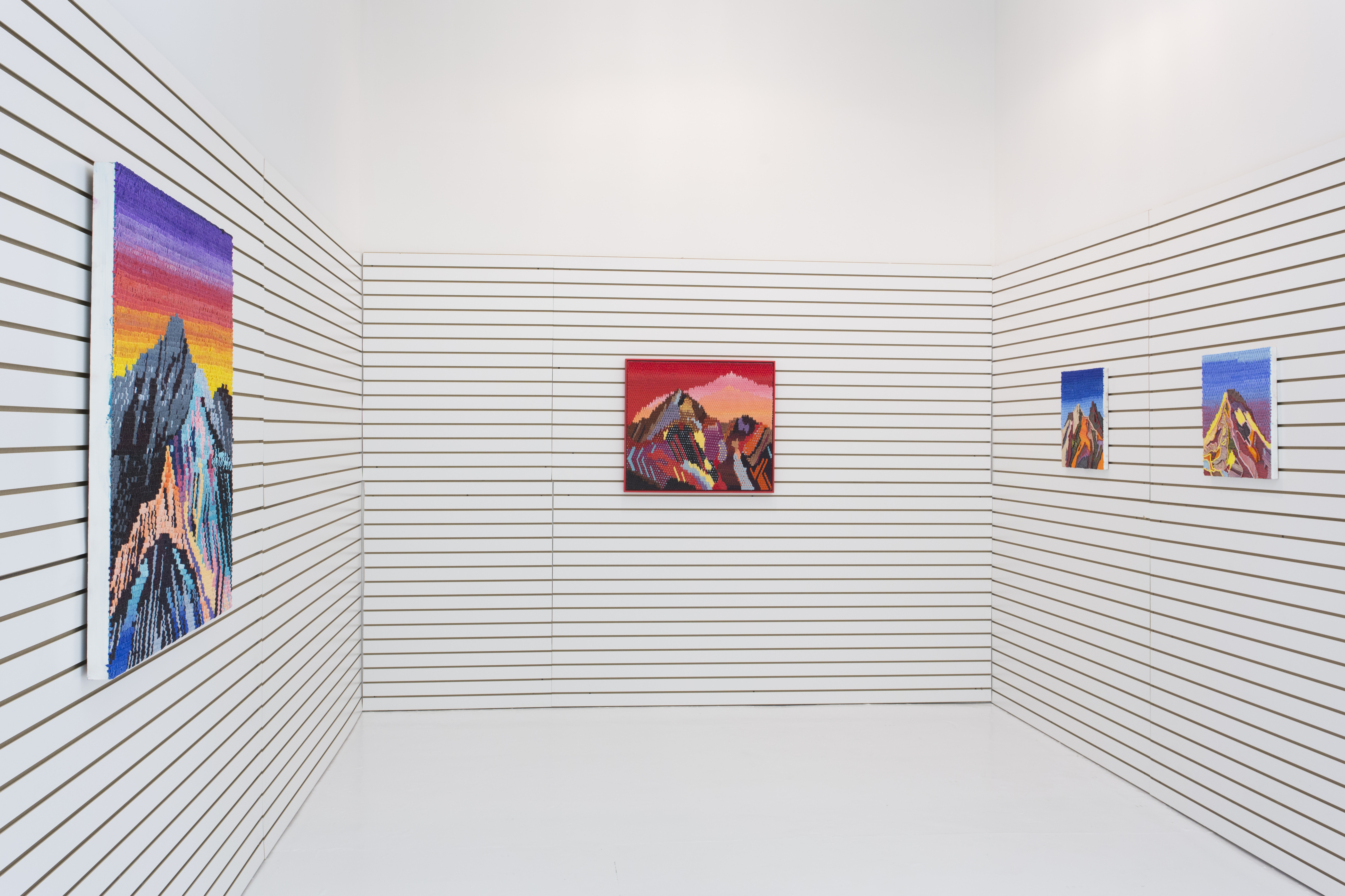 Their craftiness and kitchiness adds a layer of complication; the technique feels so lovingly homespun, so why did the artist spin a scene of fiery destruction for us? Is the appeal of a flaming box truck abstract or sincere? Over-articulated edges and hypersaturated colors make the paintings of flora hectic, psychedelic. The mountains are so crazy colored they look on fire with sunset, a postcard injected with saccharine, is that beautiful or beautified? As with the exhibition by Adam Parker Smith concurrently in Gallery 3, the viewer is asked to question their own notions of beauty and the real and the fake.
