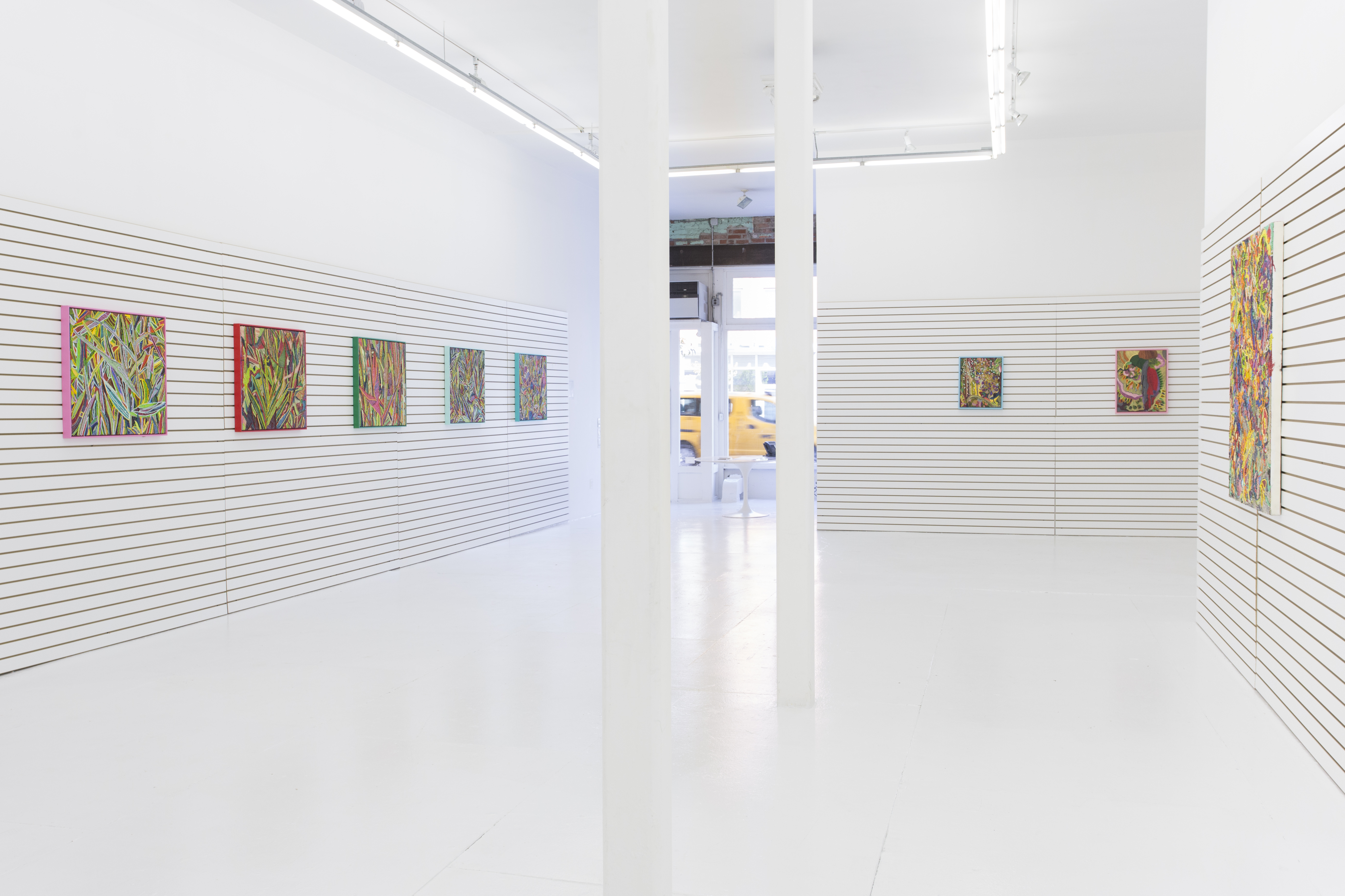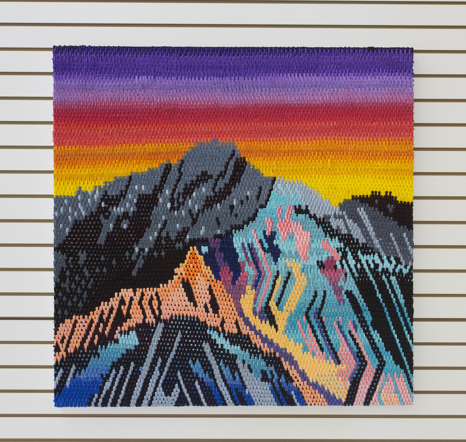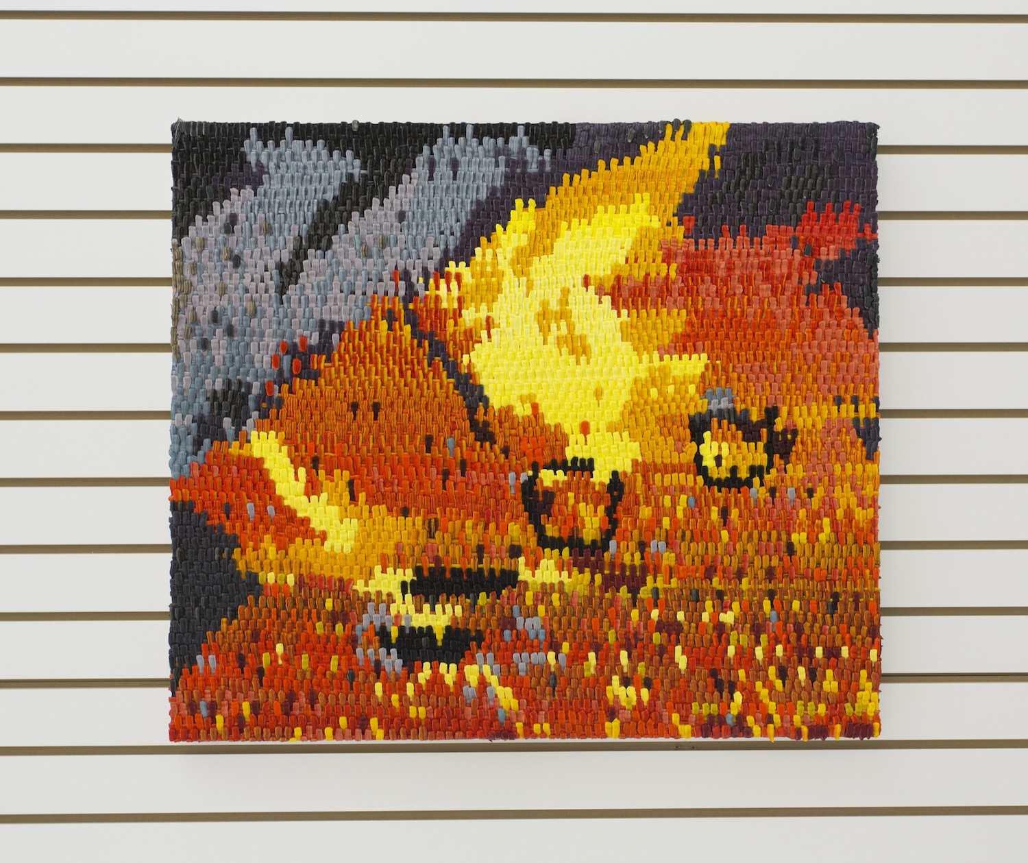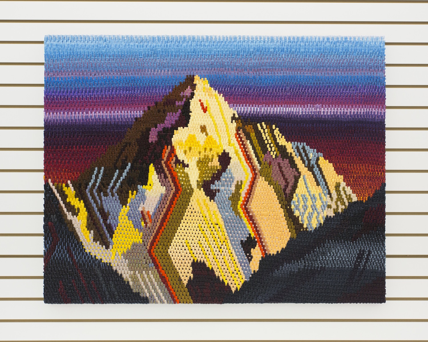 Their craftiness and kitchiness adds a layer of complication; the technique feels so lovingly homespun, so why did the artist spin a scene of fiery destruction for us? Is the appeal of a flaming box truck abstract or sincere? Over-articulated edges and hypersaturated colors make the paintings of flora hectic, psychedelic. The mountains are so crazy colored they look on fire with sunset, a postcard injected with saccharine, is that beautiful or beautified? As with the exhibition by Adam Parker Smith concurrently in Gallery 3, the viewer is asked to question their own notions of beauty and the real and the fake.