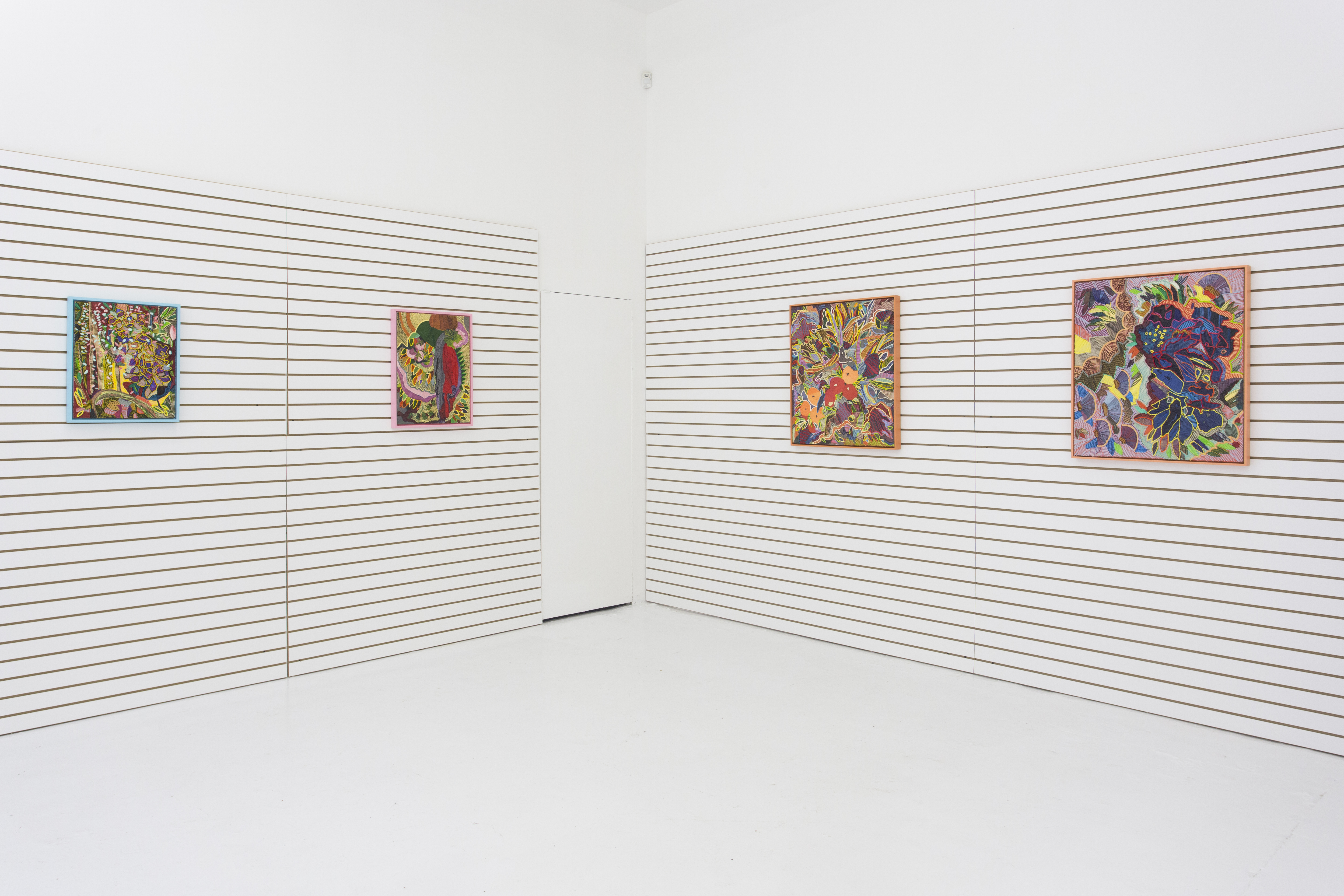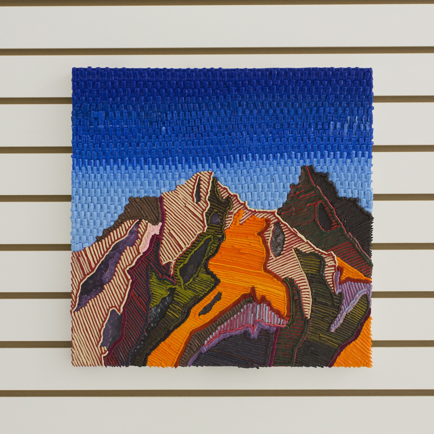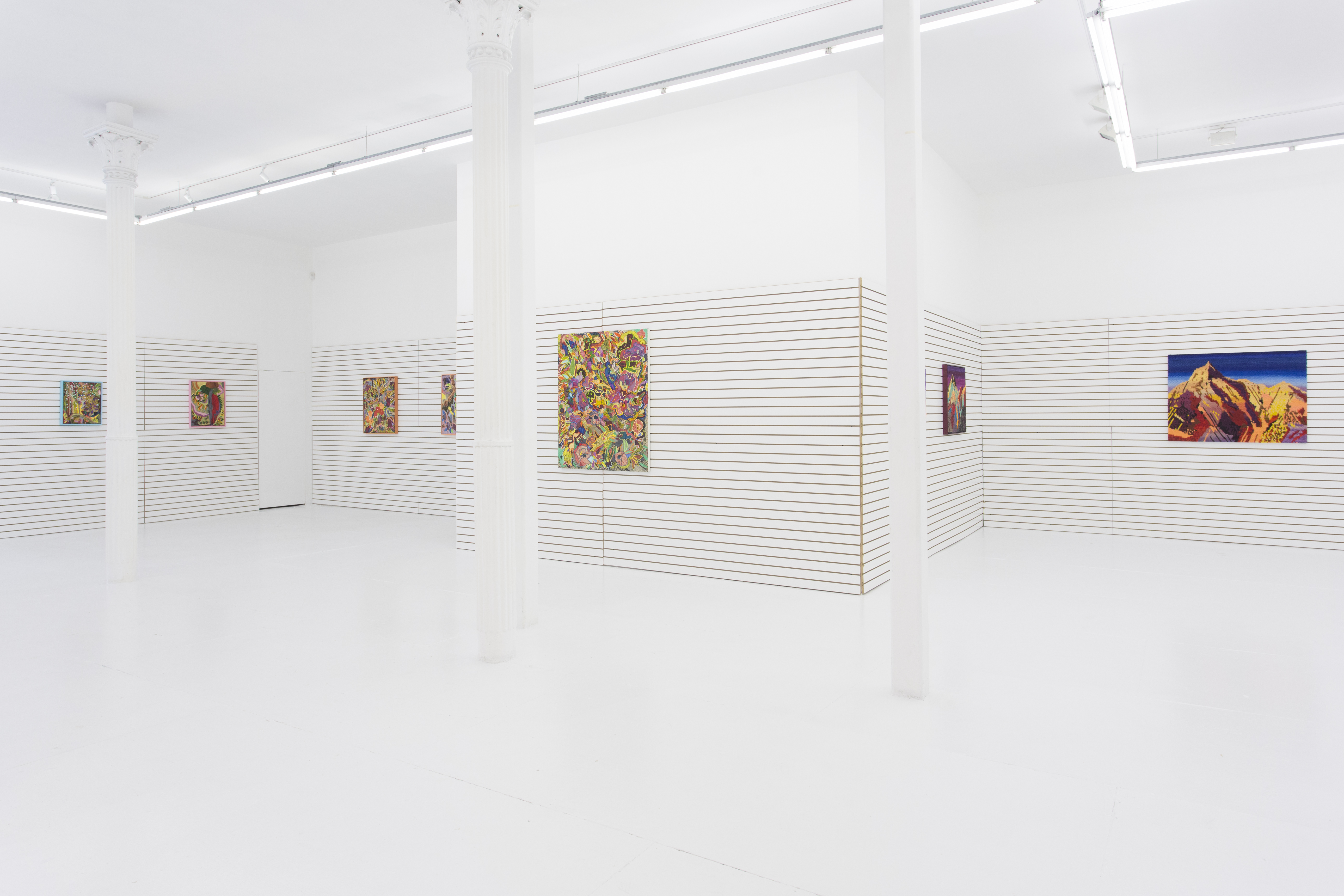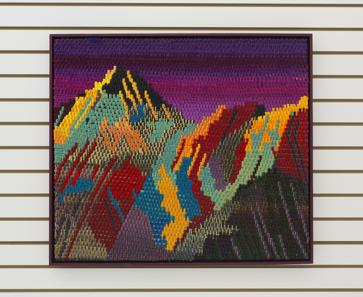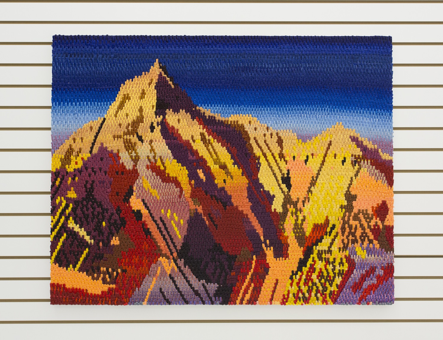 Their craftiness and kitchiness adds a layer of complication; the technique feels so lovingly homespun, so why did the artist spin a scene of fiery destruction for us? Is the appeal of a flaming box truck abstract or sincere? Over-articulated edges and hypersaturated colors make the paintings of flora hectic, psychedelic. The mountains are so crazy colored they look on fire with sunset, a postcard injected with saccharine, is that beautiful or beautified? As with the exhibition by Adam Parker Smith concurrently in Gallery 3, the viewer is asked to question their own notions of beauty and the real and the fake.