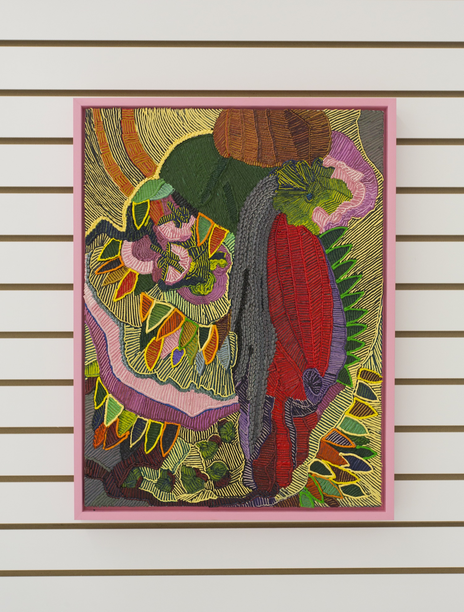 Dispensing paint through a pastry tube with varying nibs, Larsen is able to line, layer and weave colors together, sometimes blending them within the same extrusion. This technique can produce a variety of effects, from 8-bitish pointillism in the weaves, to a sort of jewel-like sculptural relief in the plants, or a tessellated warping mesh grid in the lined hybrid works. The pieces are composed either in a wonky top-down, left-to-right layering or a block-by-block patterning that is more articulated edges and paint-by-numbers.