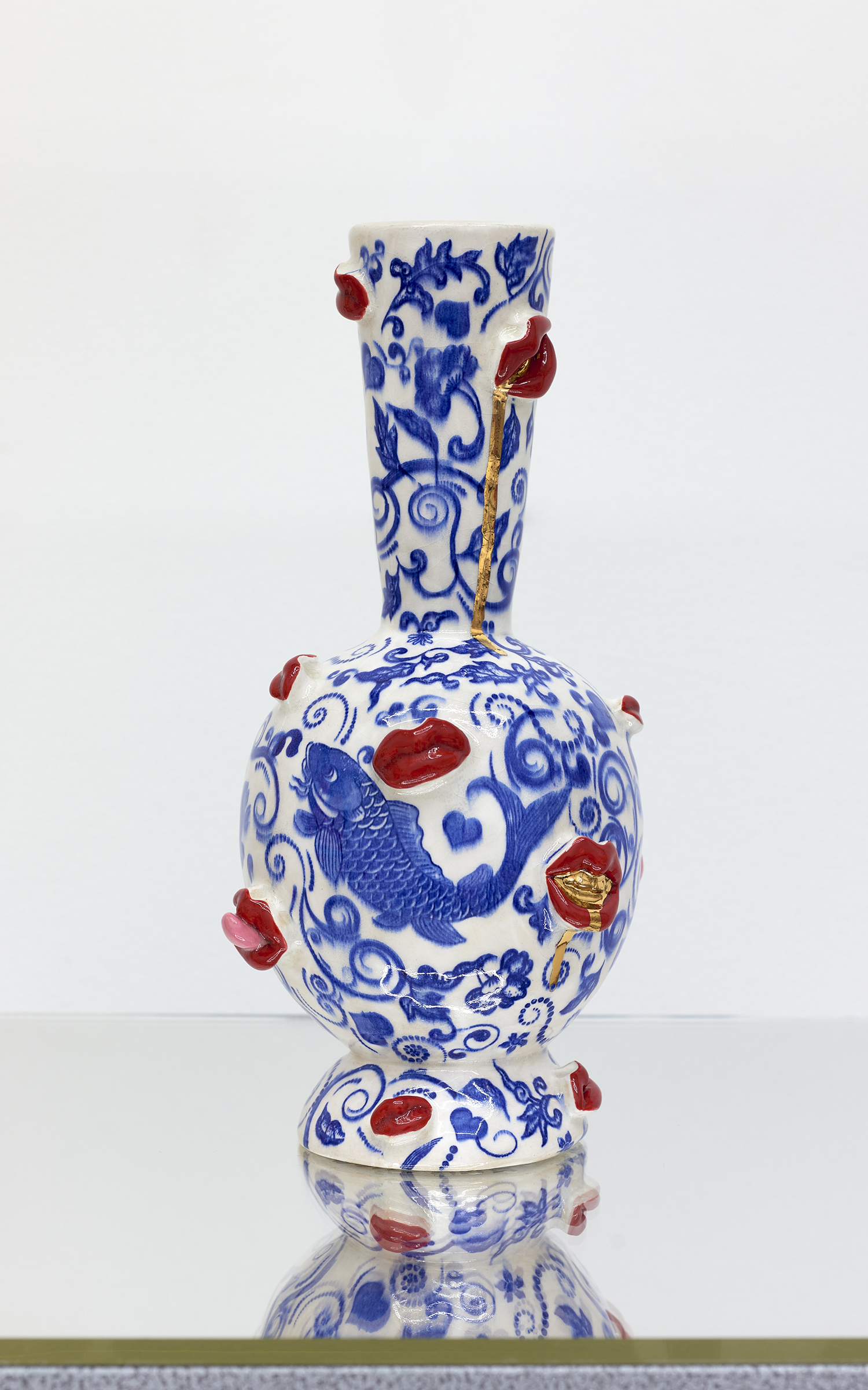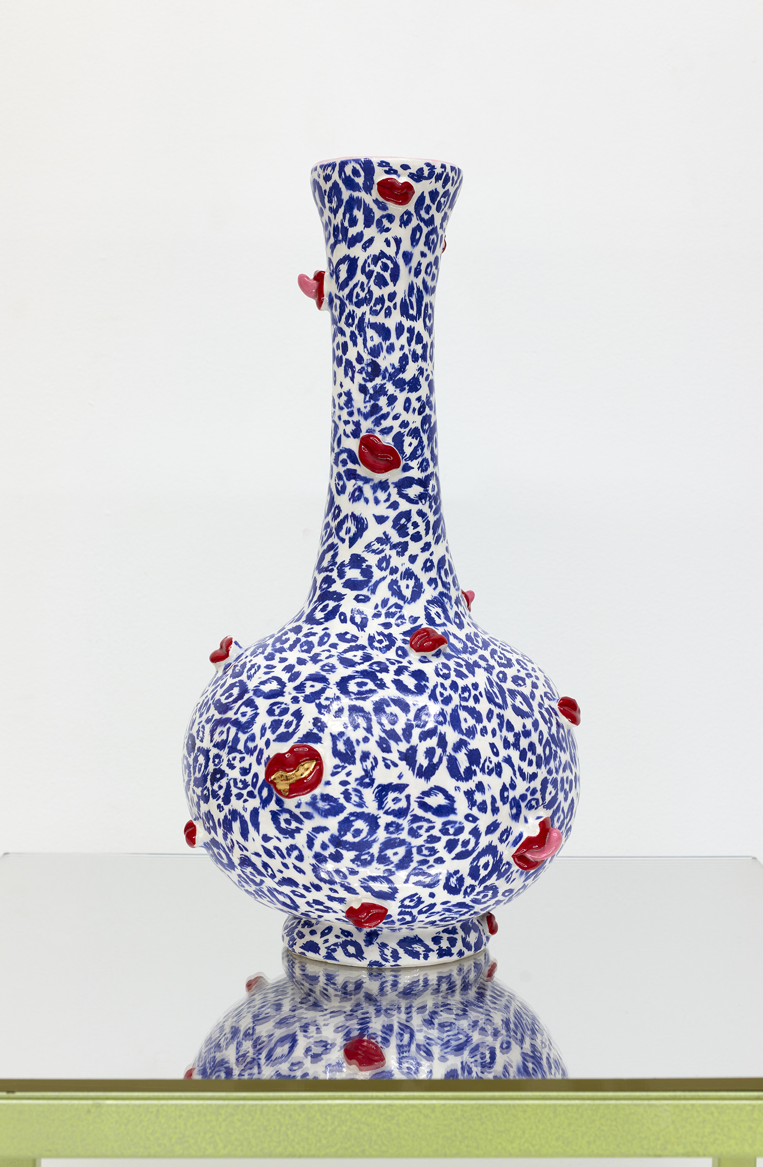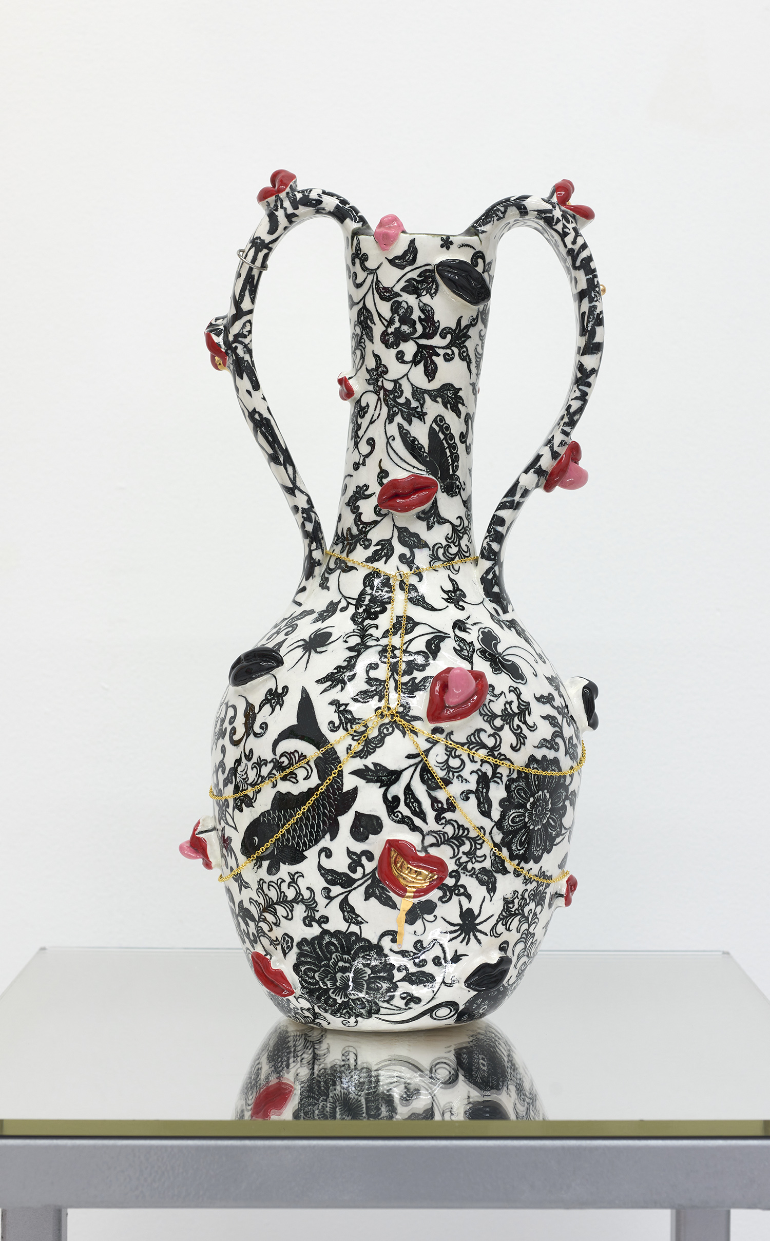Roxanne Jackson exhibits vases as well but these are traditional glazed ceramic vases in white and cobalt. Like the Delftware she references, these works are not porcelain (which the Dutch hadn’t yet figured out how to copy from China) but are low-fire raku clay painted with white underglaze. Along with Larsen she seeks to reinvent craft and disrupt historical ideas of pattern and design. In the addition of puckering mouths to the traditional vase, some with gold teeth, tongue piercings, black lipstick or draped in gold jewelry, she eroticizes and contemporizes the safe and staid motifs. Like Ruby Neri she uses a feminist punk approach to disrupt and occupy realms of design and craft in the ceramic arts.