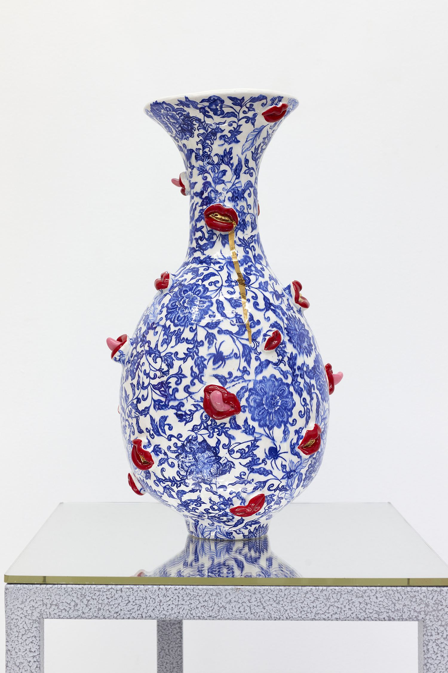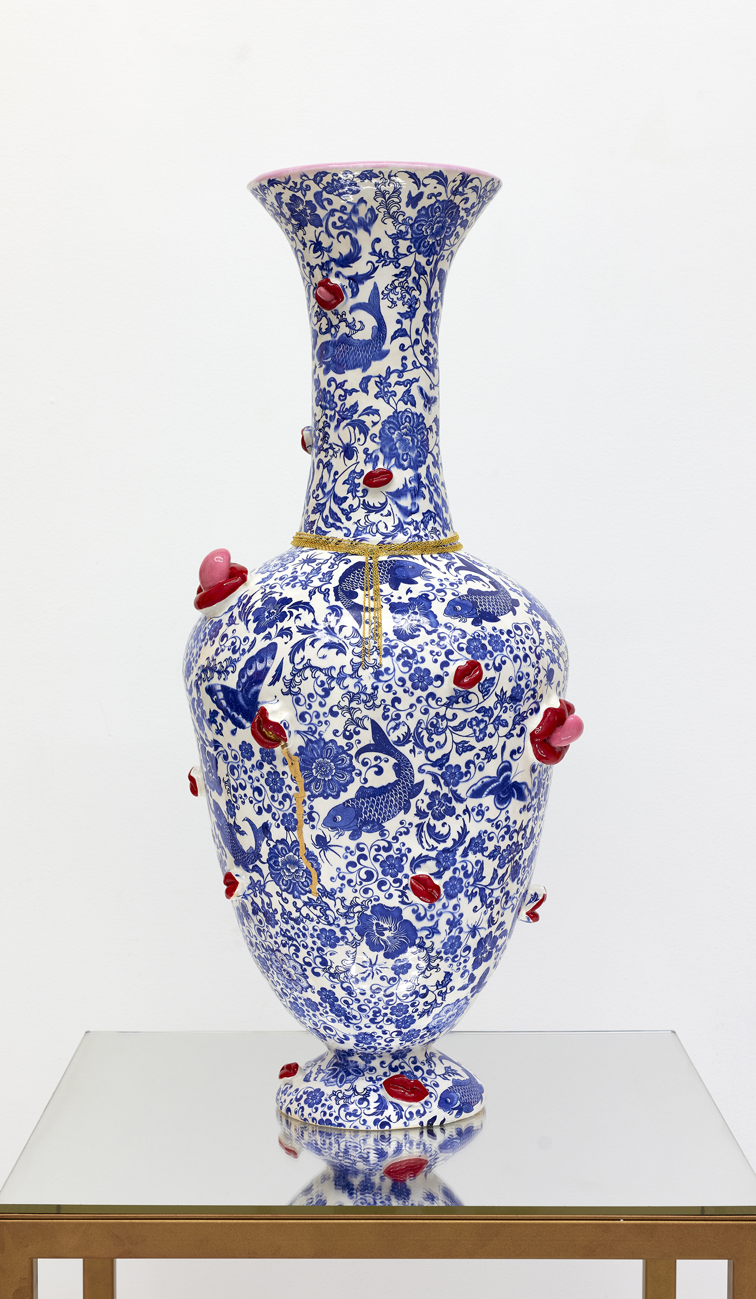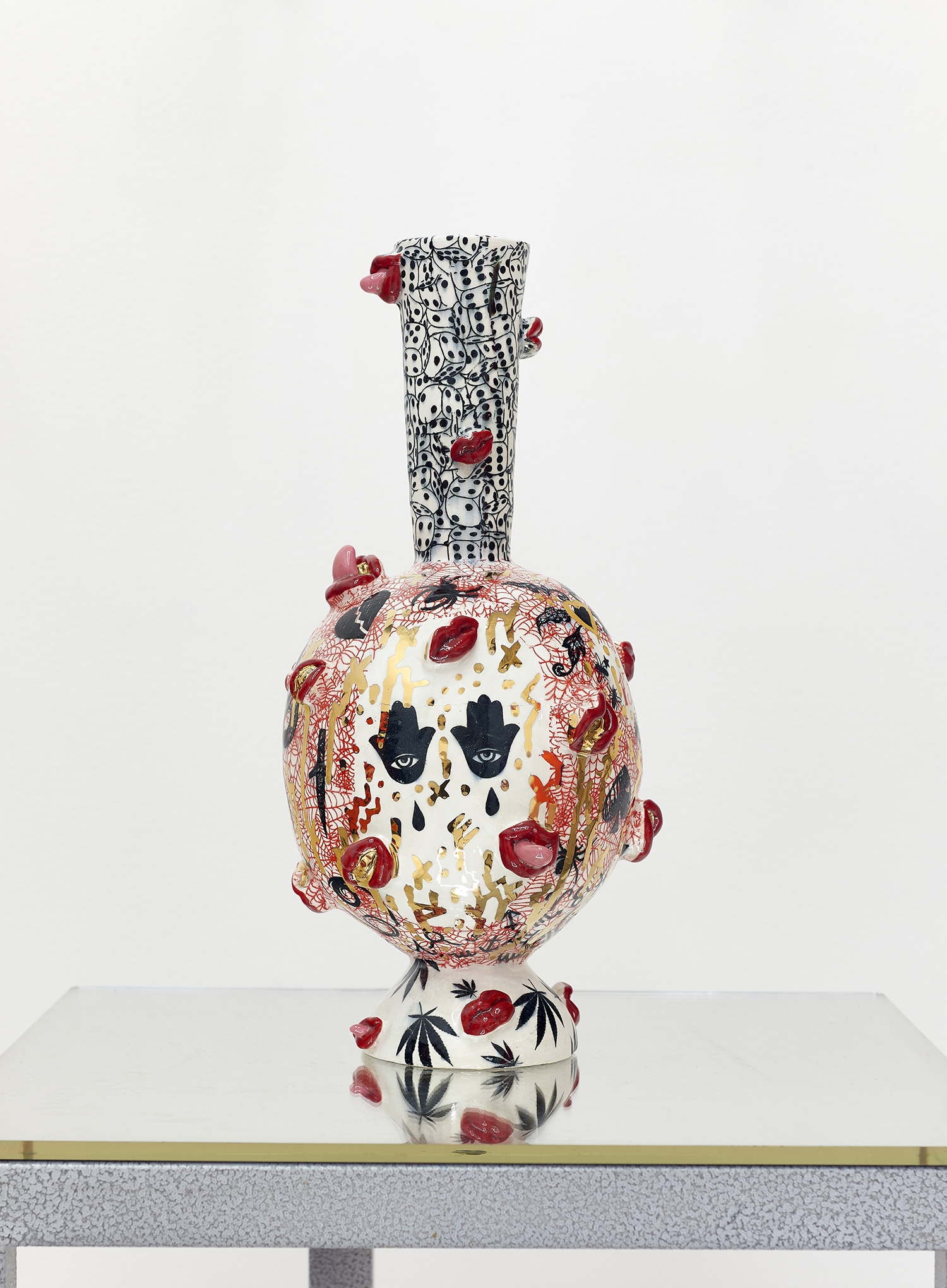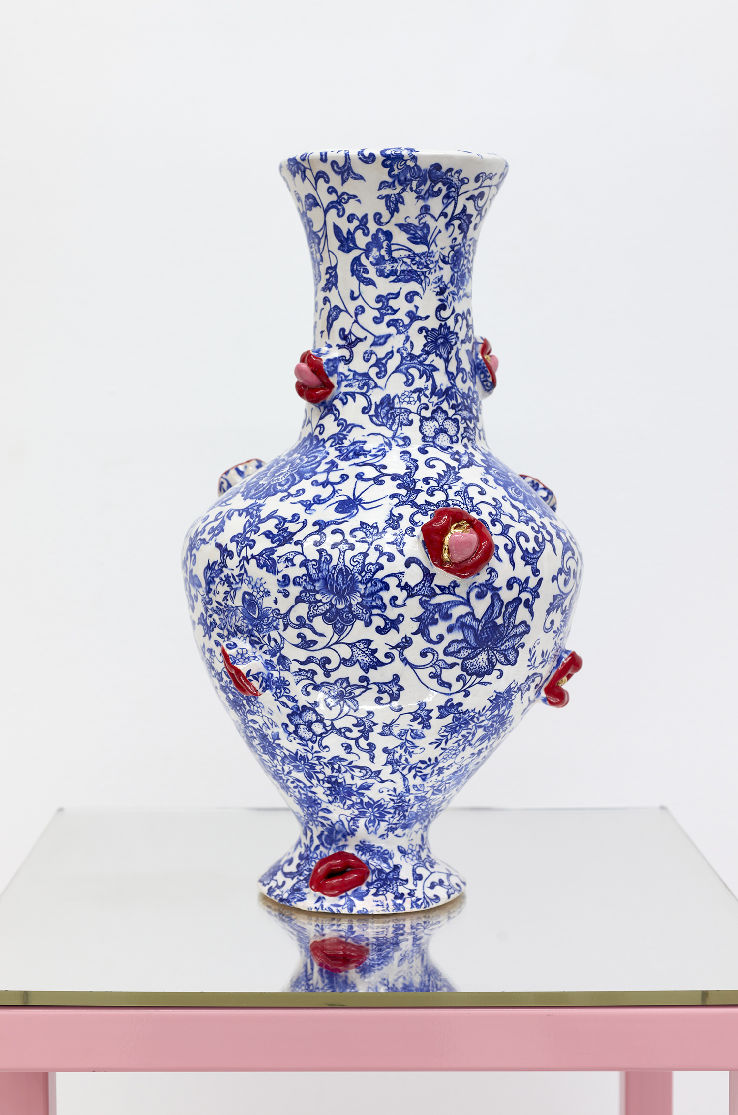 Roxanne Jackson exhibits vases as well but these are traditional glazed ceramic vases in white and cobalt. Like the Delftware she references, these works are not porcelain (which the Dutch hadn’t yet figured out how to copy from China) but are low-fire raku clay painted with white underglaze. Along with Larsen she seeks to reinvent craft and disrupt historical ideas of pattern and design. In the addition of puckering mouths to the traditional vase, some with gold teeth, tongue piercings, black lipstick or draped in gold jewelry, she eroticizes and contemporizes the safe and staid motifs. Like Ruby Neri she uses a feminist punk approach to disrupt and occupy realms of design and craft in the ceramic arts.