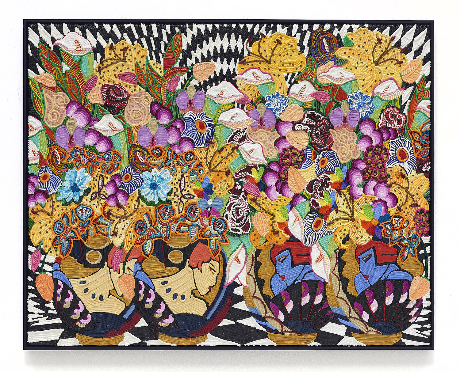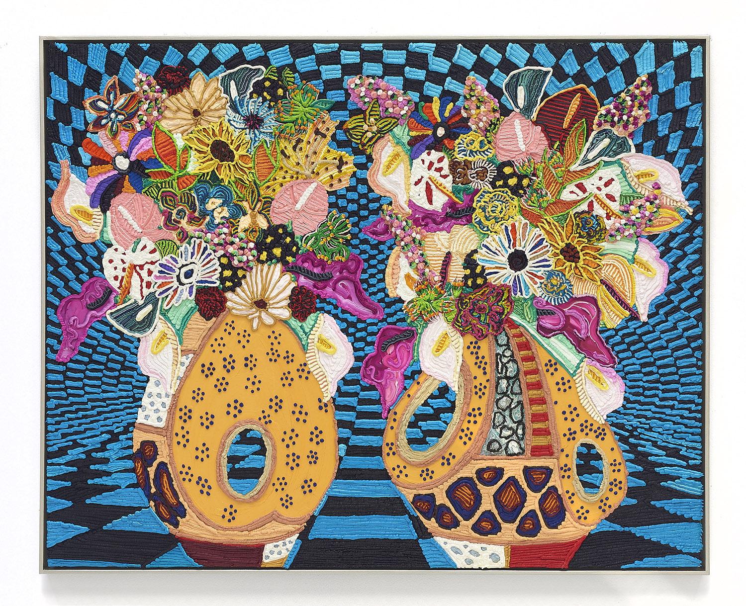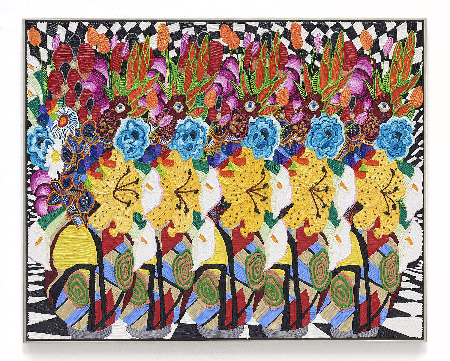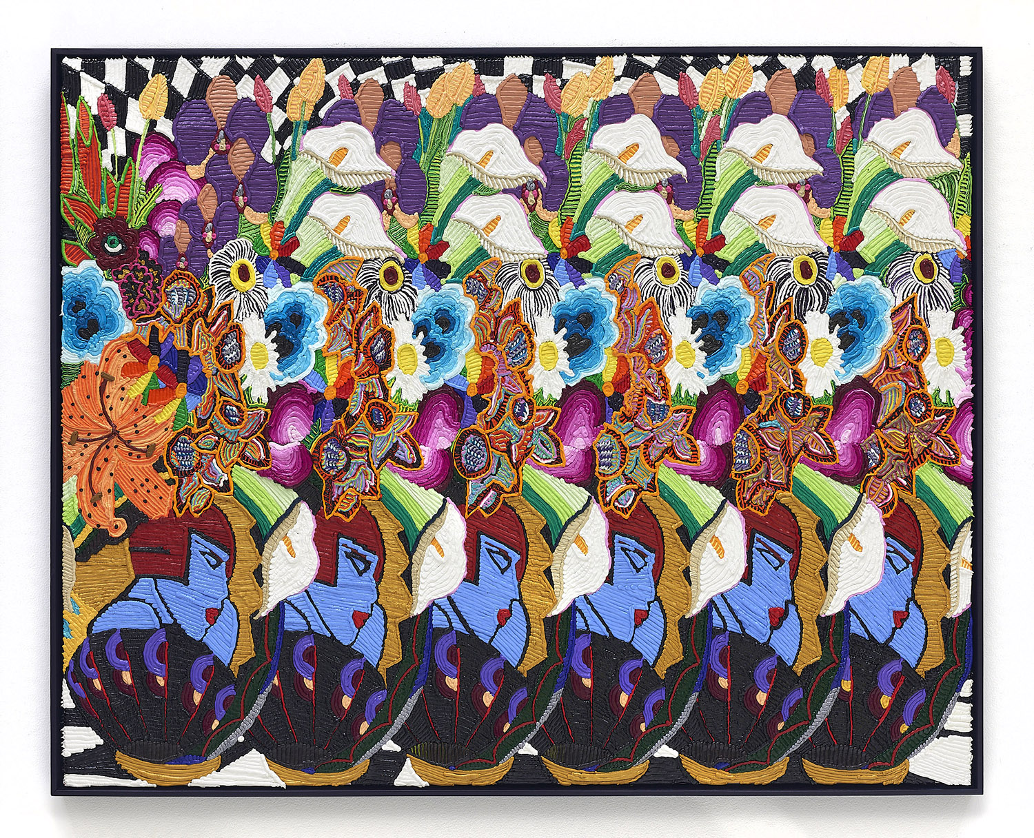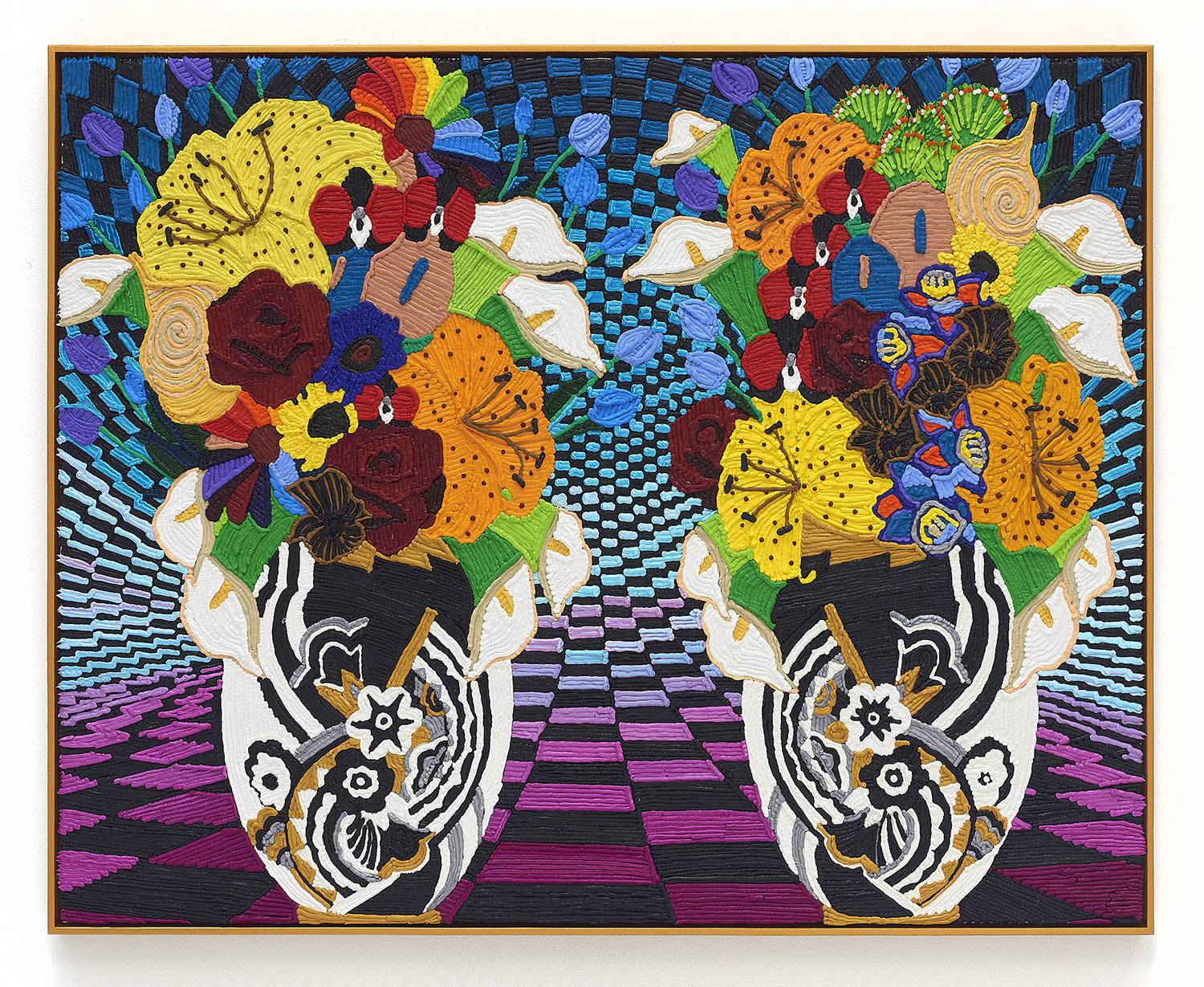 Caroline Larsen expands upon her Longwy Art Deco vase series debuted here two years ago in Kaleidoscopic (2019) with proliferating vases and flowers. Most works feature not-quite-mirror images of two vases of flowers, like the above, where a psychedelic op background further warps your perception of near-symmetry. In other works the vases start repeating even further; four, five, six vases proliferate across the panel making your eyes spin out. Not all vases in this show are from Longwy designs: Talavera pottery from Mexico, Carlton Ware and Imari Ware are included—and in one painting Caroline paints Roxanne Jackson’s vases into the painting.